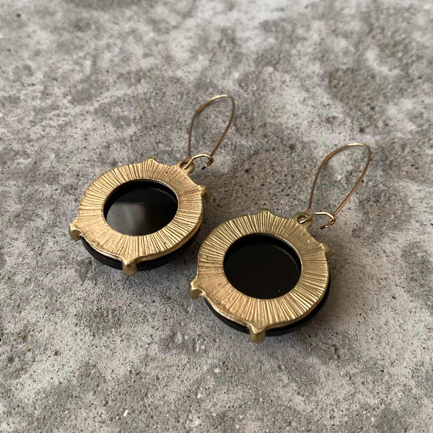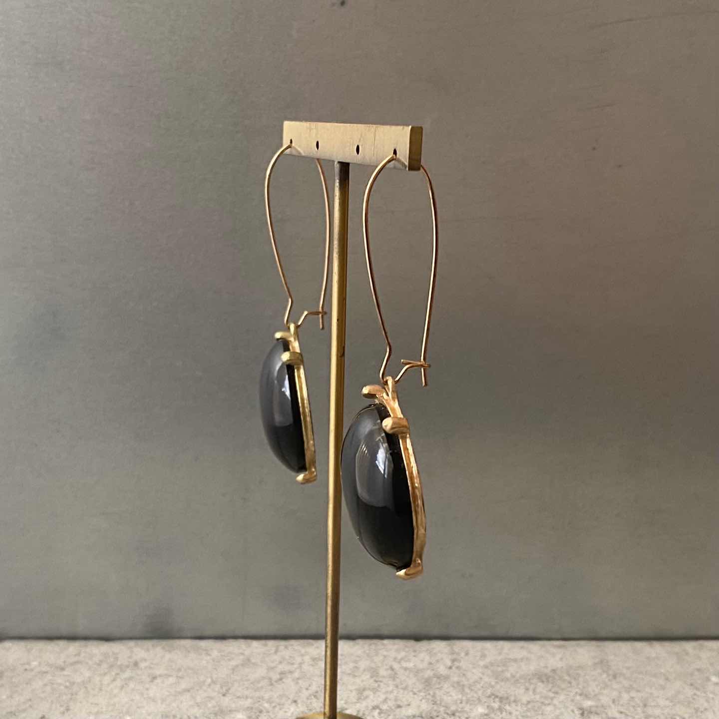 大きなブラックカラーのストーンが揺らめく個性的なデザインのUSAヴィンテージピアス。存在感がありスタイリングのアクセントにおすすめです。 □Materials メタル(ゴールドメッキ)、プラスチックストーン □Size 約H6.3×W2.6㎝ 14g □Condition【C】 メタル部分に変色がみられます。元々の作りですが、ストーンが中央より少しズレた状態で留められています。中古品であることをご理解のうえお買い求めください。ご購入前に必ずショッピングガイドのご確認をお願いいたします。 【S】未使用 【A】未使用に近い 【B】やや使用感あり 【C】使用感あり Item No.3452
