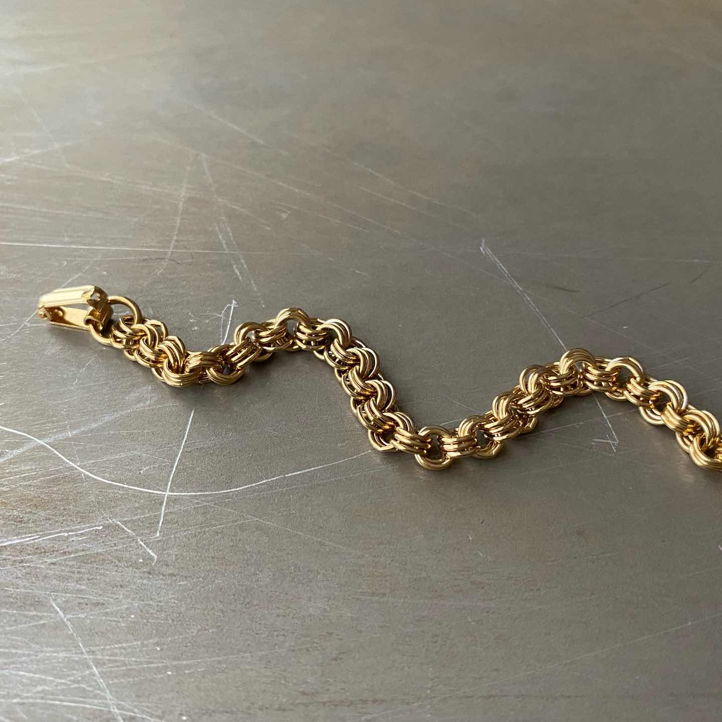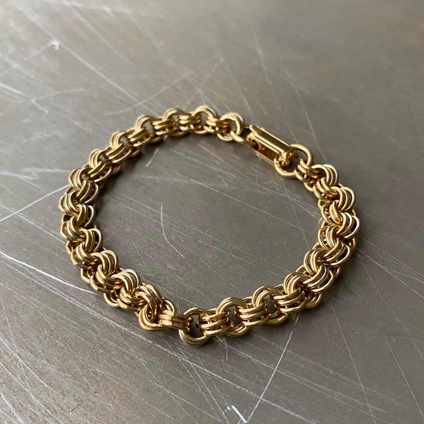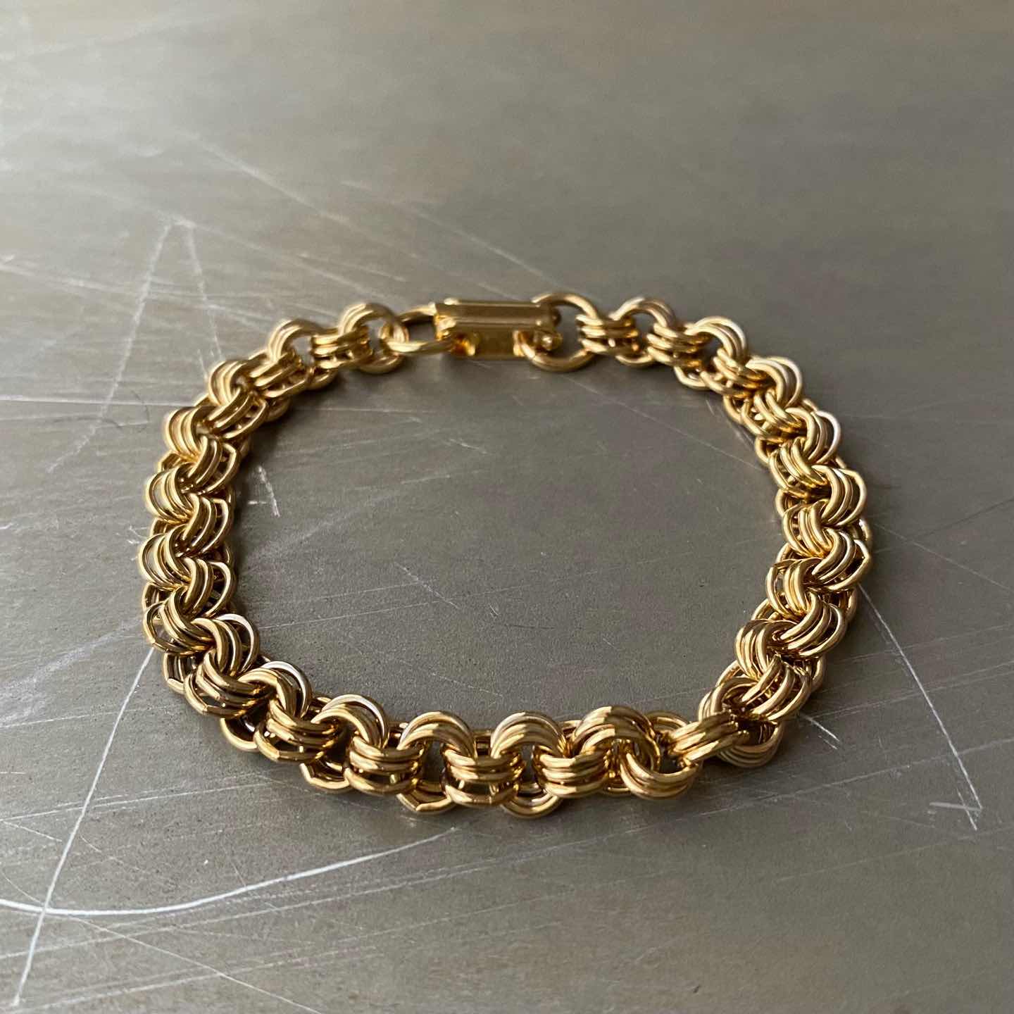 クラシカルな雰囲気のUSAヴィンテージブレスレット。シンプルながら存在感のあるチェーンやレトロな金具が魅力的。身につけやすい幅感で様々なスタイルに合わせていただけます。 □Materials メタル(ゴールドメッキ) □Size 全長 約17.4㎝ 幅 約6㎜ 11g □Condition【A】 使用感の少ない良好な状態です。中古品であることをご理解のうえお買い求めください。ご購入前に必ずショッピングガイドのご確認をお願いいたします。 【S】未使用 【A】未使用に近い 【B】やや使用感あり 【C】使用感あり Item No.3455