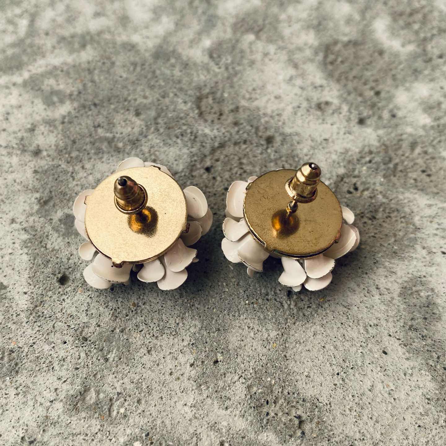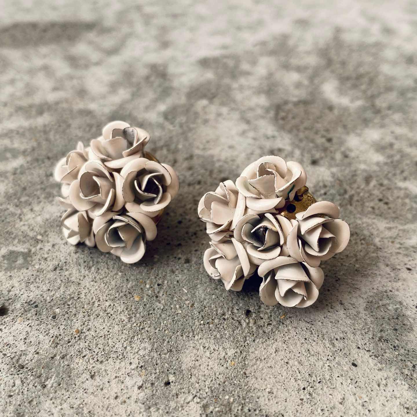 白い薔薇の花束のようなレトロ可愛いUSAヴィンテージピアス。メタルを加工して作られた繊細なフラワーが魅力的です。 □Materials メタル(ゴールドメッキ・塗装) □Size 直径 約2.3㎝ 9g □Condition【C】 経年によるメタルのトーンダウンやスレ、花びら部分に塗装剥がれがみられます。古びた雰囲気がお好きな方におすすめです。中古品であることをご理解のうえお買い求めください。ご購入前に必ずショッピングガイドのご確認をお願いいたします。 【S】未使用 【A】未使用に近い 【B】やや使用感あり 【C】使用感あり Item No.3460