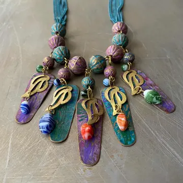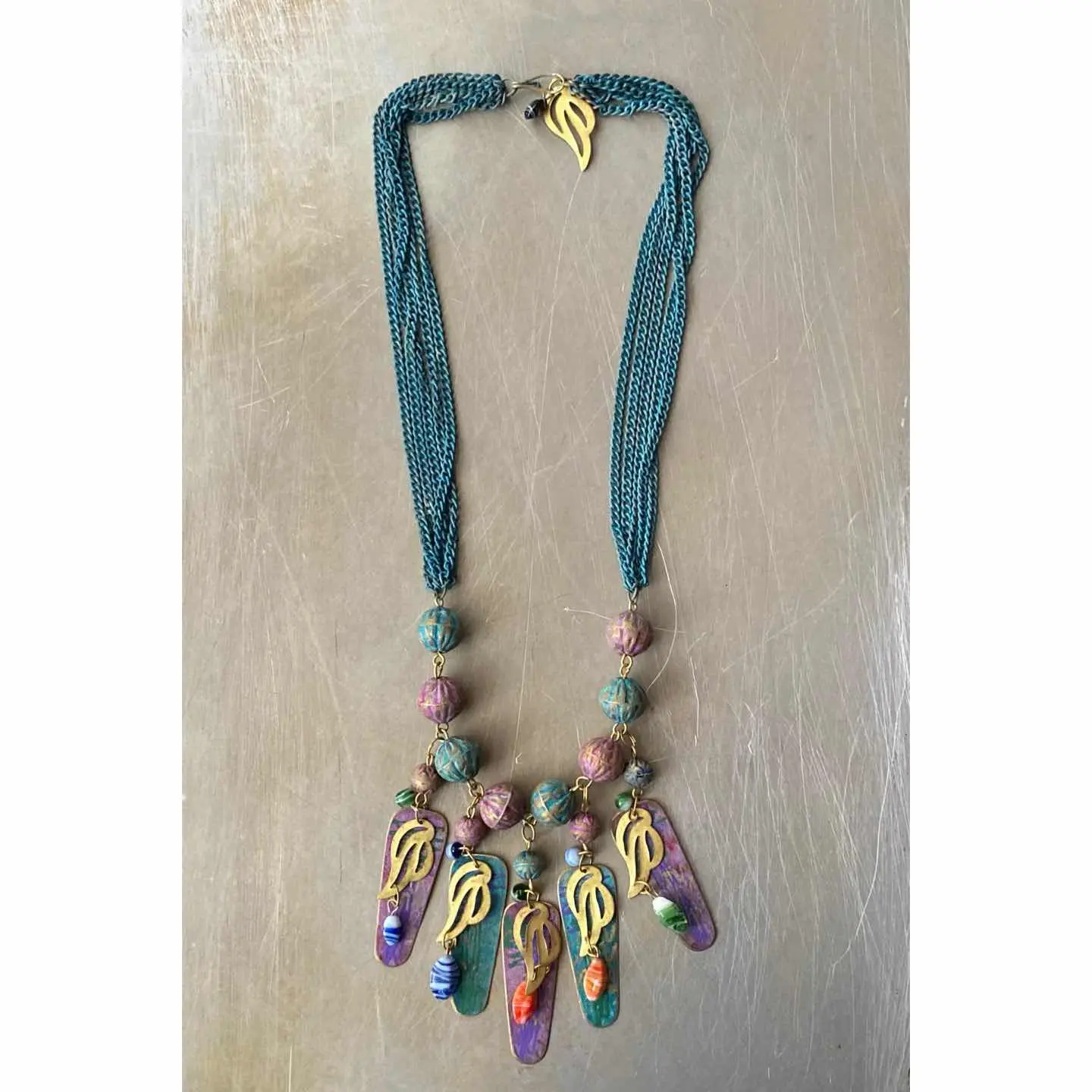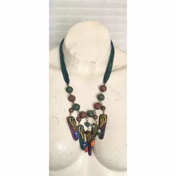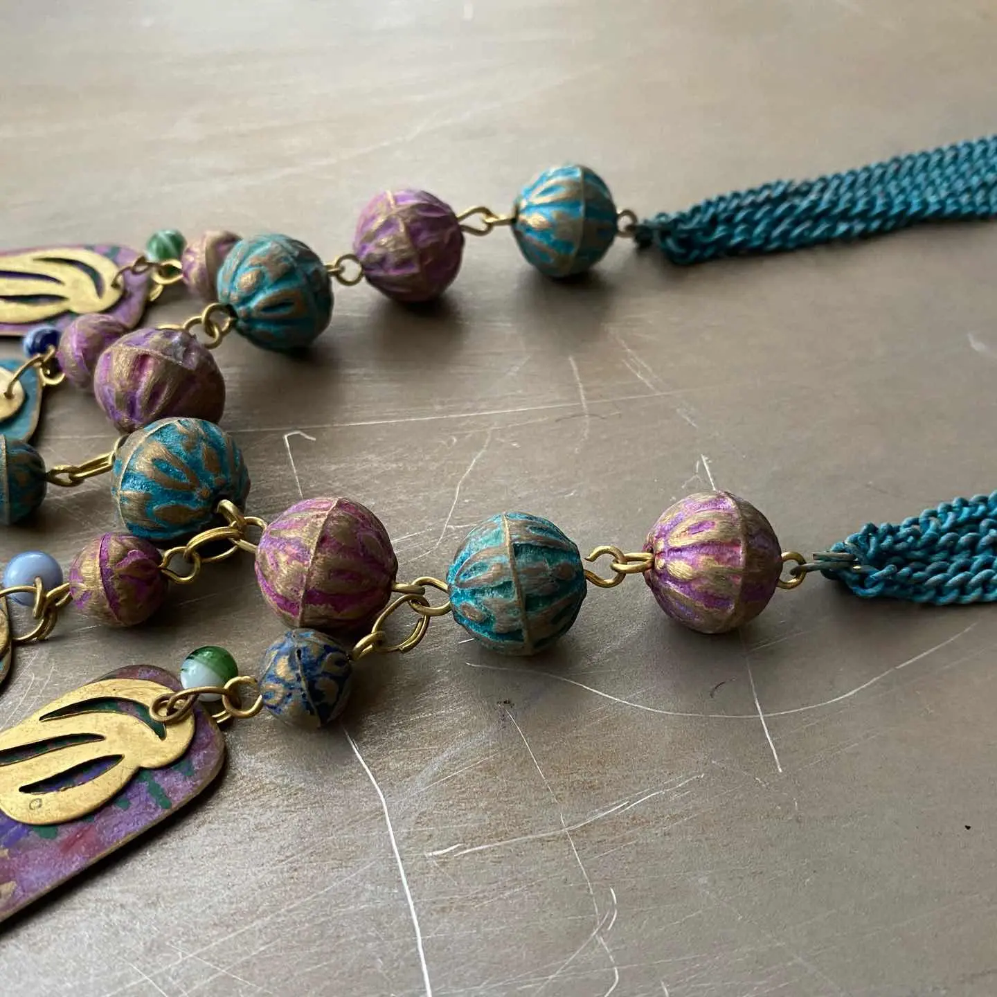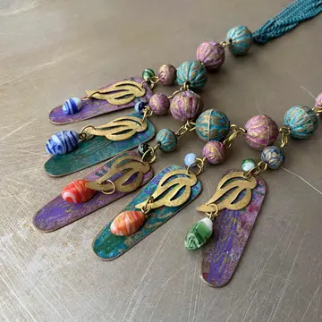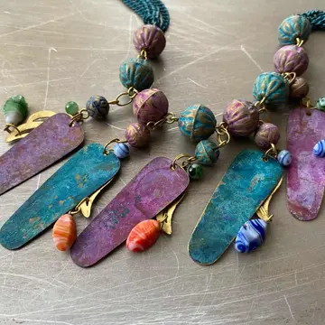 70年代に人気のあった個性的なペイントのUSAヴィンテージネックレス。色とりどりのパーツが揺らめくユニークでお洒落なデザインです。存在感がありコーディネートを明るく彩ってくれます。 □Materials 真鍮(ペイント)、ガラスビーズ □Size 全長 約58㎝ 幅 約1.3〜7.3㎝ 74g □Condition【B】 目立ったダメージの無い良好な状態です。中古品であることをご理解のうえお買い求めください。ご購入前にショッピングガイドのご確認をお願いいたします。 【S】未使用 【A】未使用に近い 【B】やや使用感あり 【C】使用感あり Item No.3469