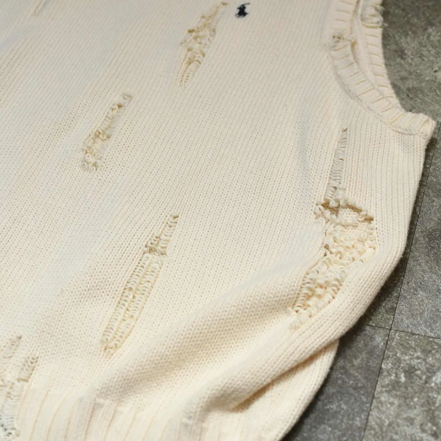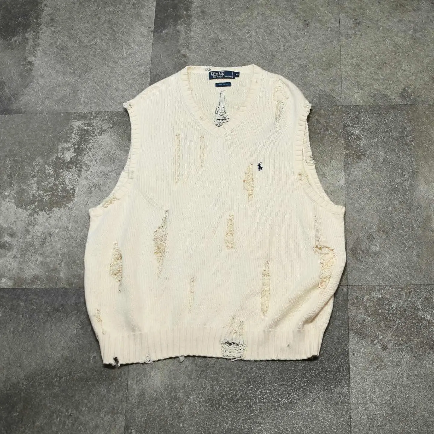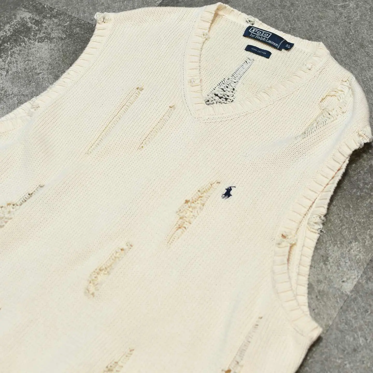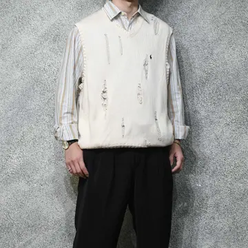 SIZE:XL 着丈72cm 肩幅46cm 身幅63cm fabric/cotton 着用画像 177cm/64kg ラルフのニットベストをボロカスタム。 どこか畏まった印象で落とし込みにくさを 感じていた方、カジュアルなスタイリングに 落とし込んでみてはどうでしょう。 差し色にもなるアイテムと合わせたり、 柄シャツと合わせたり、コーデを考える時間も 楽しくなるようなニットベストです。 ※撮影状況により、実物と多少色が異なる場合が ございます。 ※古着を取り扱っているため、気づかない汚れや ほつれ等がある場合がございます。 予めご了承ください。 ※サイズは着用感で選んでおり、 表記サイズではございません。 表記サイズは説明欄の最初に記載しております。 古着 オーバーサイズ old vintage ヴィンテージ used 80's 90's アメリカ古着 ユーロ古着 POLO RALPH LAUREN Eddie Bauer OLD GAP LANDS' END ランズエンド LLBean エルエルビーン オールドギャップ エディーバウアー ラルフローレン ブルックスブラザーズ Brooks Brothers ホワイト 白 ニット セーター リメイク古着 などがお好きな方 #vintage #オーバーサイズ #old #used #90s #80s #古着 #ヴィンテージ #アメリカ古着 #ユーロ古着 #LLBean #エルエルビーン #EddieBauer #エディーバウアー #oldgap #オールドギャップ #LANDSEND #ランズエンド #NAUTICA #ノーティカ #ラルフローレン #POLORALPHLAUREN #ブルックスブラザーズ #BrooksBrothers #リメイク #リメイク古着 #ニットベスト #ベスト #ニット #セーター #ダメージニット