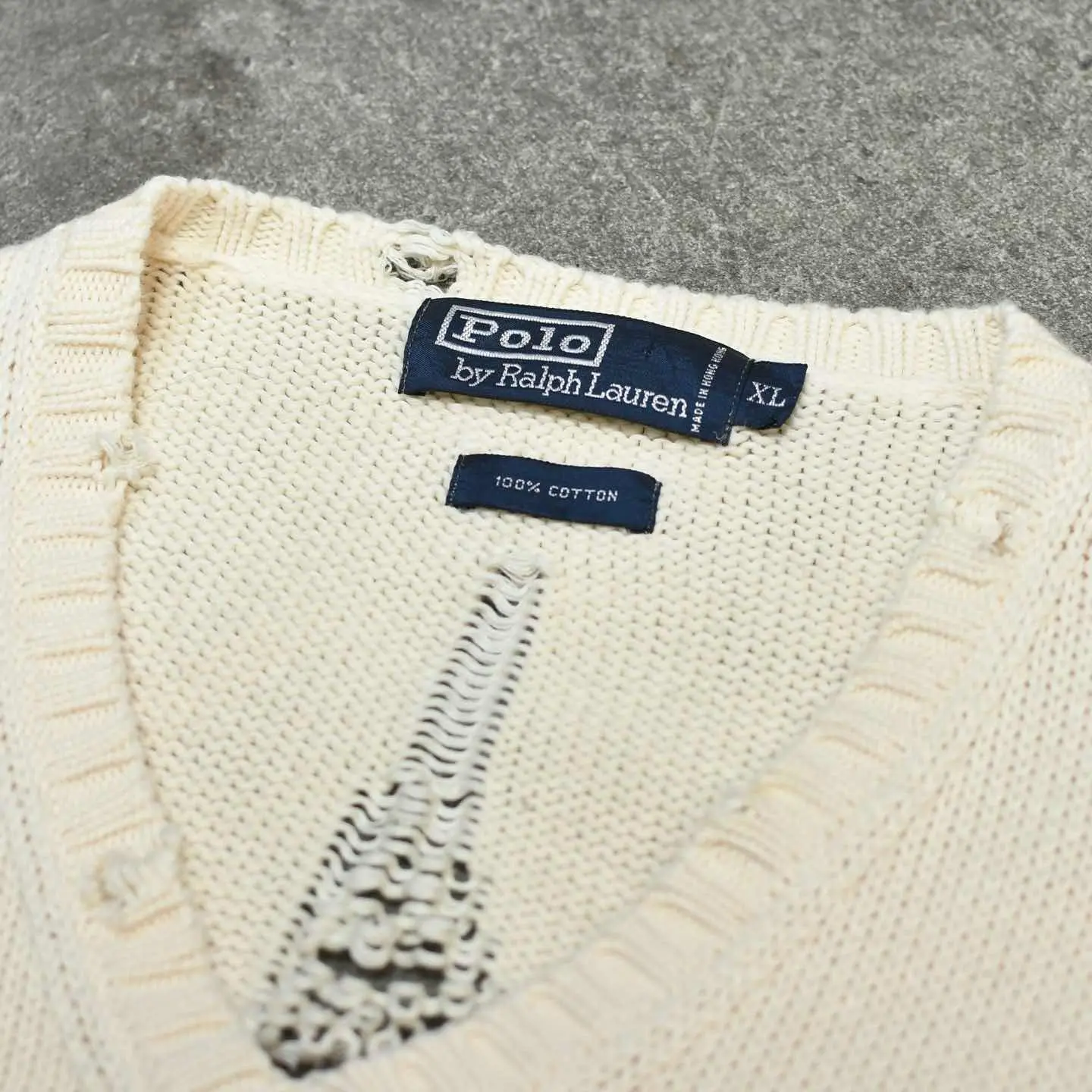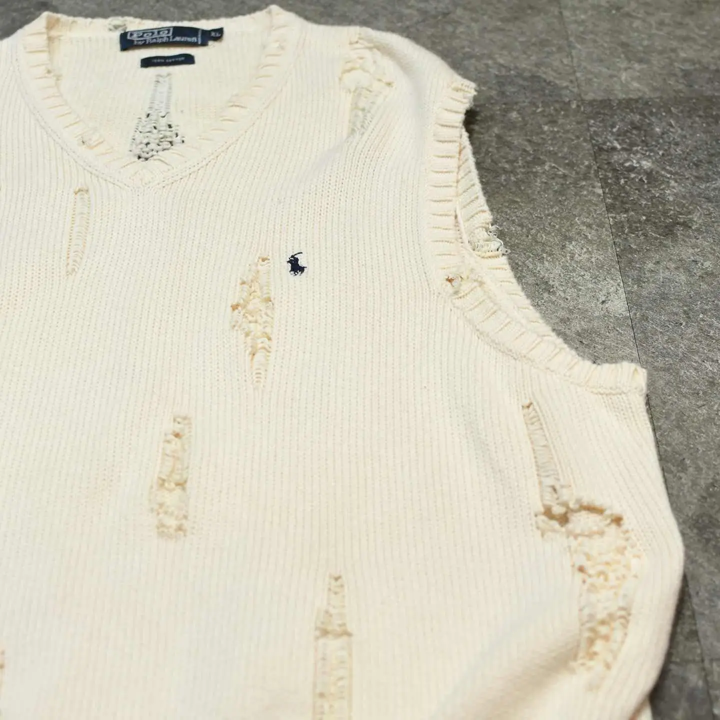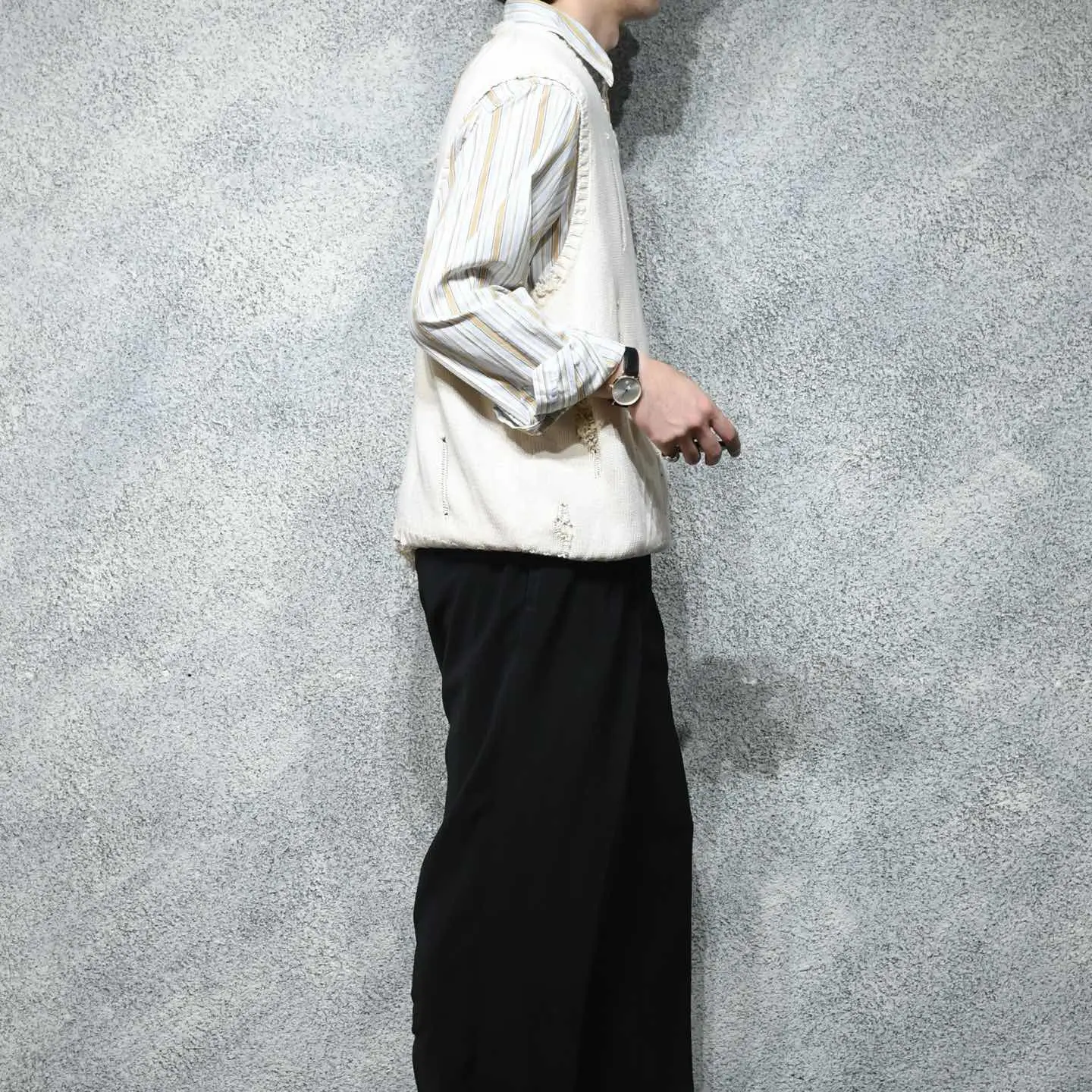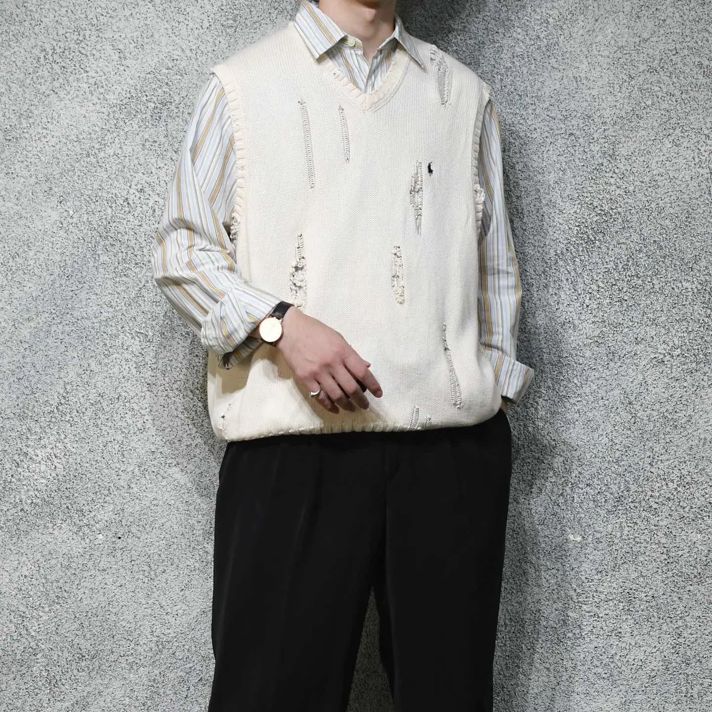 SIZE:XL 着丈72cm 肩幅46cm 身幅63cm fabric/cotton 着用画像 177cm/64kg ラルフのニットベストをボロカスタム。 どこか畏まった印象で落とし込みにくさを 感じていた方、カジュアルなスタイリングに 落とし込んでみてはどうでしょう。 差し色にもなるアイテムと合わせたり、 柄シャツと合わせたり、コーデを考える時間も 楽しくなるようなニットベストです。 ※撮影状況により、実物と多少色が異なる場合が ございます。 ※古着を取り扱っているため、気づかない汚れや ほつれ等がある場合がございます。 予めご了承ください。 ※サイズは着用感で選んでおり、 表記サイズではございません。 表記サイズは説明欄の最初に記載しております。 古着 オーバーサイズ old vintage ヴィンテージ used 80's 90's アメリカ古着 ユーロ古着 POLO RALPH LAUREN Eddie Bauer OLD GAP LANDS' END ランズエンド LLBean エルエルビーン オールドギャップ エディーバウアー ラルフローレン ブルックスブラザーズ Brooks Brothers ホワイト 白 ニット セーター リメイク古着 などがお好きな方 #vintage #オーバーサイズ #old #used #90s #80s #古着 #ヴィンテージ #アメリカ古着 #ユーロ古着 #LLBean #エルエルビーン #EddieBauer #エディーバウアー #oldgap #オールドギャップ #LANDSEND #ランズエンド #NAUTICA #ノーティカ #ラルフローレン #POLORALPHLAUREN #ブルックスブラザーズ #BrooksBrothers #リメイク #リメイク古着 #ニットベスト #ベスト #ニット #セーター #ダメージニット