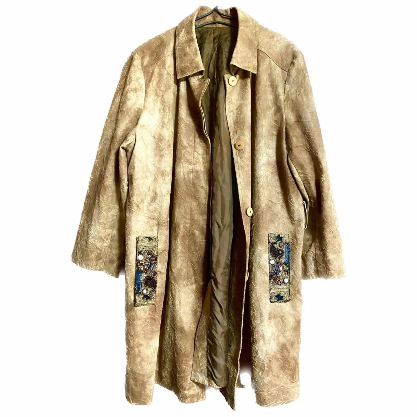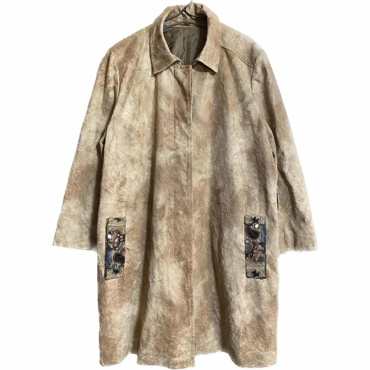 60s 職人作成 Peacockポケット 裏打ち 3Dアート焼き討ちJKT お宝品、 60年代のヴィンテージ職人が関わった世界に1つのジャケット 理由は簡単裏打ちアートと言われる、 別名、焼き討ちアートと思います 0.1秒 勝負の。裏側から立体にするために記事を焼いて立体を作るやつです 立体アートが、ボディーに現れるんですね。さらにポケット口ピーコックハンドアート、既製品なわけない、だから、 世界に1つです、だが?? そんな理論は正直どうでもいいです。 もうとにかくかっこいい。この独特のカラーリングに仕上がった。ジャケット フォーマルなのに、嫌味のない 状態に仕上がっており コーディネート見ればわかりますよね シルエットが良いから、ここまでかっこよく決まるんです。 ちなみに、年中活躍のタイプです 洗えます。重ね着にも最適!! ▷color◁ 写真通り ※ブラウザで異なる場合ありますがかなり実物には、近づけてます、 ▷size◁ 平置き片面採寸【㎝表記】 表記size Lに属します。 着丈/80 身幅/58 肩幅/45 袖丈 /60 DSは袖はハンガー採寸 ※多少の誤差は理解下さい 170センチ Mジャストの私が、着用して前締めできます、し、ゆるだぼ、 【素材】 焼き打ちtexture、画像参照、職人の手作業じゃないとできません、立体アートいいます、 【状態】 不具合なし良い、長持ちします、洗えます、 検品、洗濯、検品で、3回チェックして発送しますので、ご安心して、お買い求め下さい!!