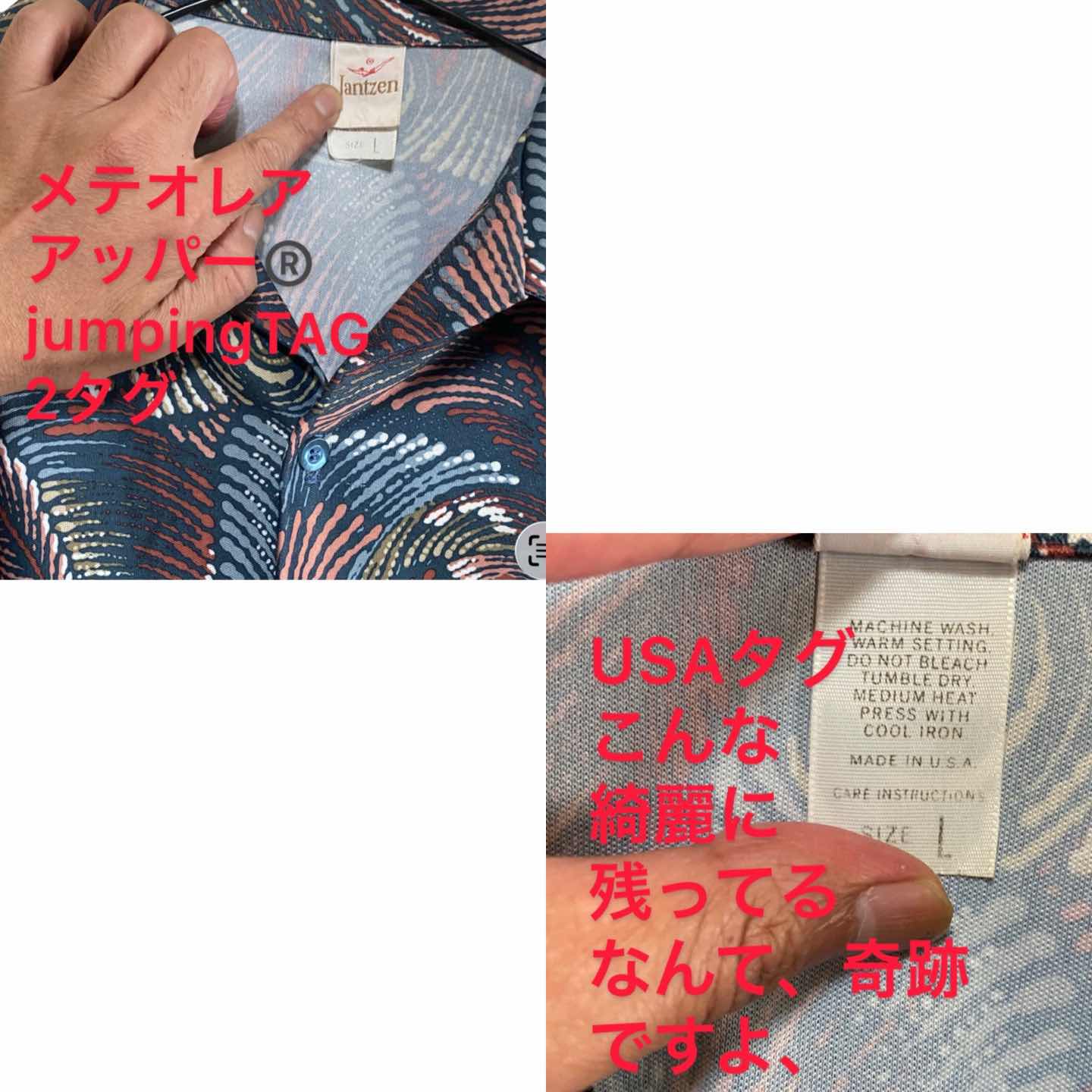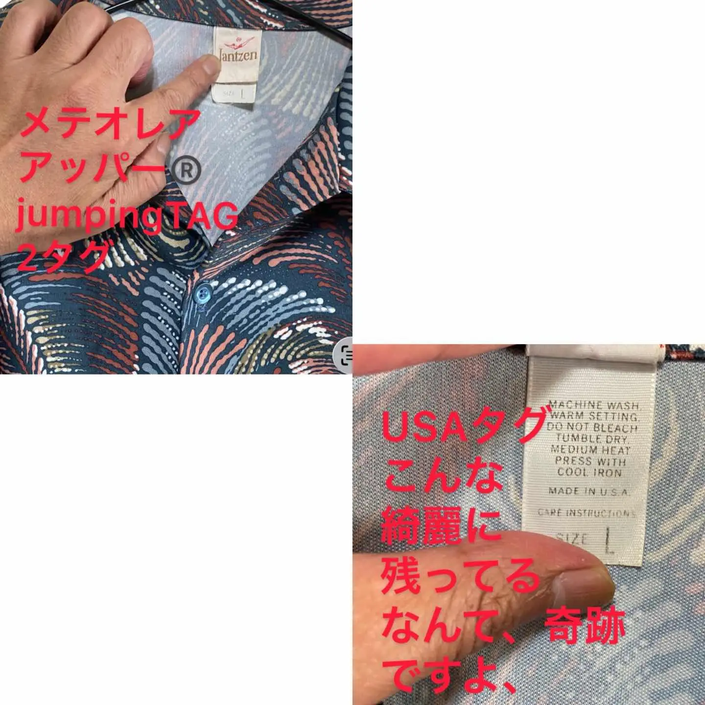 50-60s 最高級 USAmade Jantzen 鳳凰 UP ®︎タグシャツ L •Brand:Jantzen USAブランド •data:50-60 見極め方、シルエット、襟、柄、素材 一番は、タグ2ベロ、に、アップ ®︎マーク、商品、右側につくのは、60後期から、よって、遠慮しても60です、アップタイプは、 •point: 素材の安定感、激レアfenix柄しかも、ボディは、状態良い、1910から続くアメリカブランドのこのタイプは、中々てにはいらない、しかも、独特の、シルエットが、アメカジから、アメスト、フォーマル カジュアル全てにきまる、 です!! ▷color◁ fenix artといわれる、超希少な柄 ※ブラウザで異なる場合ありますがかなり実物には、近づけてます、 ▷size◁ 平置き片面採寸【㎝表記】 表記size L表記 ひとによっては、XLのかたでもいけます、 着丈/76 身幅/60 肩幅/58DS 袖丈 /65↓ DSは袖はハンガー採寸 ※多少の誤差は理解下さい 170/Mジャスト体型の私が着て、✔️参考に ジャスト オーバーサイズ✔︎ ビックサイズ 【素材】 アンティーク強化ポリ 【状態】 ↓以外は。100%美品です。ボディ超綺麗ですが、 意味不明なクレーム嫌なんで、明記↓ 写真片方袖インに、1カ所と明記してますが、アップ見てください2カ所突っ張りありますが、イン袖、外から見えないし、50-60sで、破れでもない、さらに、他でアップしても、接写じゃないとみえない、レベルです。これを、は?って、思う方は、そもそもが、古着に理解なさすぎますので、お断りします