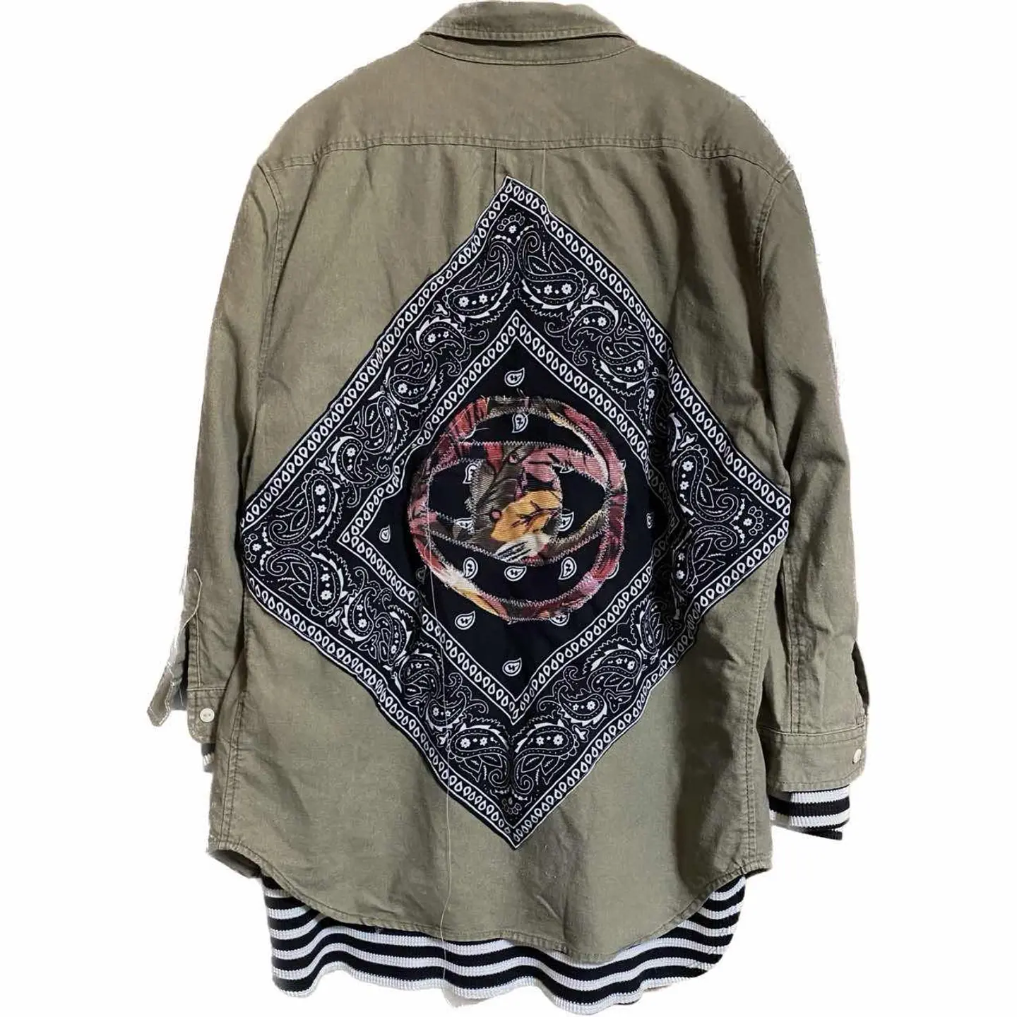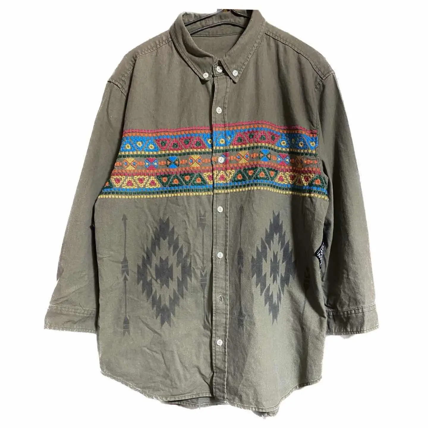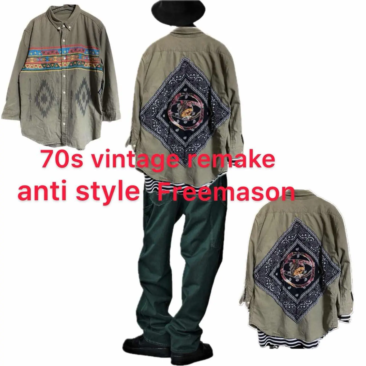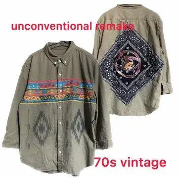 70s unconventional anti style Freemason シャツ L •brand vintage •data 70s vintage remake unconventional anti style •point anti style unconventional 型破りな、アートを施した、 70s vintage シャツを、フルカスタム、 猫目ボタンと、かなり、レアなんですが、 質が良いからそのままでいいと言う思考停止は、したくなかったから、 一気にカスタムしました遊牧民の伝統的な刺繍を施し、チマヨ柄プリント これだと、ネイティブですよね、こっからが、antistyle バックにバンダナ縫い付けさらに、フリーメーソンのマークをオリジナルのバティックの布を使い1から作成して縫い付けました シャツは年中活躍しますので、迷わずゲットください。 ▷カラー◁ 写真通り ▷size◁ 平置き片面採寸【㎝表記】 表記size Lを使用しました、 着丈75 身幅57 膚幅50 袖丈59 シルエット、襟で完全70sですね、 DSは袖はハンガー採寸 ※多少の誤差は理解下さい 170センチ Mジャストの私が、着用してゆったりです、インナーXL着てます参考に 【素材】 リネン50 cotton40 ポリ10 【状態】 最高級、丁寧にリメイクしたんで、 検品、洗濯、検品で、3回チェックして発送しますので、ご安心して、お買い求め下さい!!