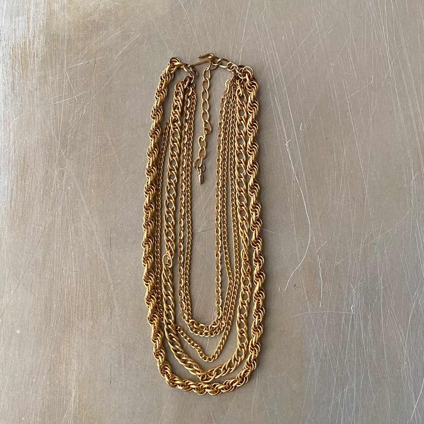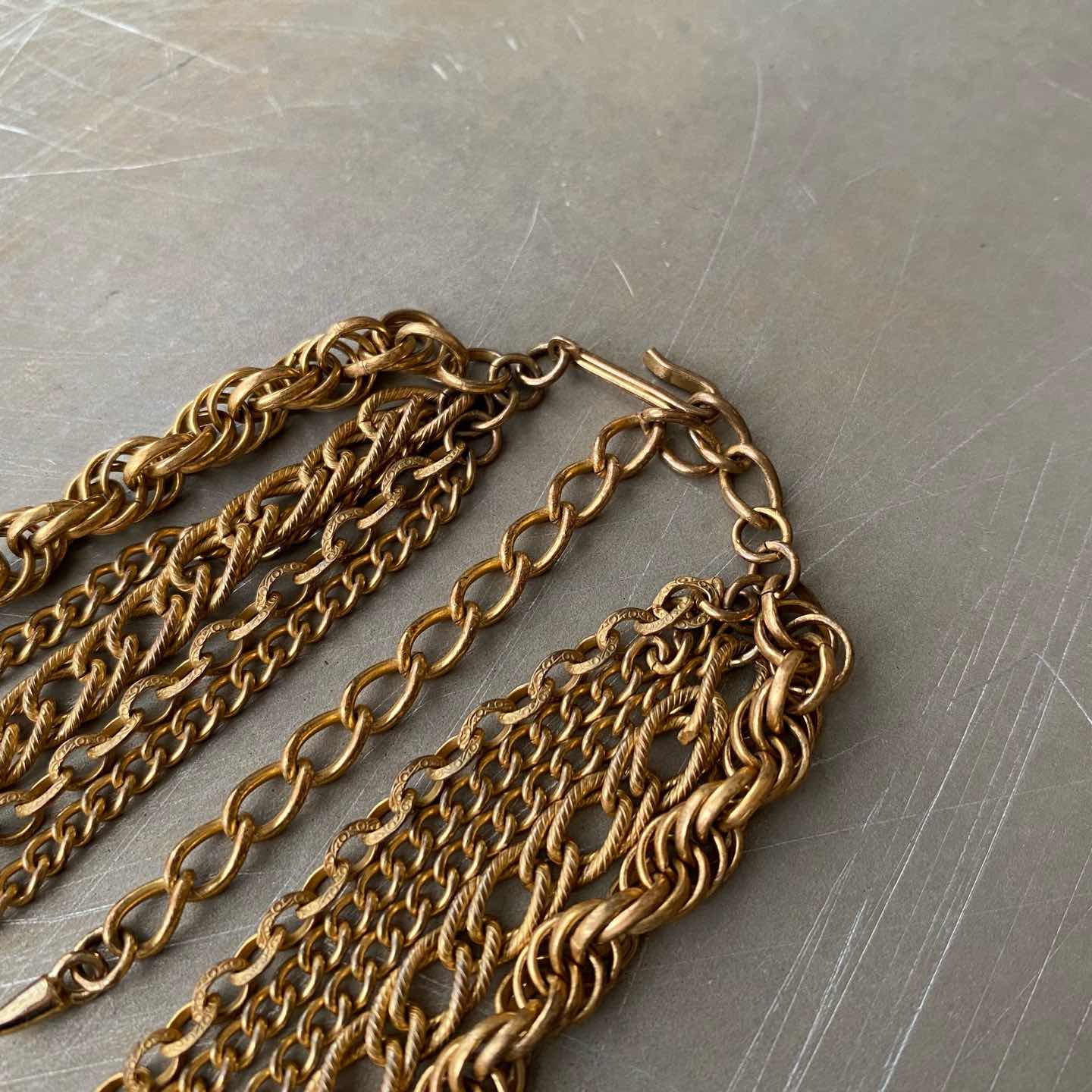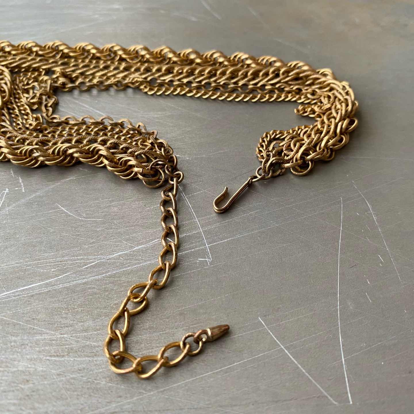 クラシカルな5連チェーンのUSAヴィンテージネックレス。ボリューム感のあるデザインで留め具はヴィンテージならではのフックタイプになっています。古びたメタルの色味も魅力的。存在感がありスタイリングにお洒落な雰囲気をプラスしてくれます。 □Materials メタル(ゴールドメッキ) □Size 全長 約32〜42㎝+アジャスター7㎝ チェーン幅 3〜6.5㎜ 63g □Condition【B】 画像の通り経年によるメタルの変色がみられますが、目立ったダメージの無い良好なヴィンテージコンディションです。中古品であることをご理解のうえお買い求めください。ご購入前にショッピングガイドのご確認をお願いいたします。 【S】未使用 【A】未使用に近い 【B】やや使用感あり 【C】使用感あり Item No.3471