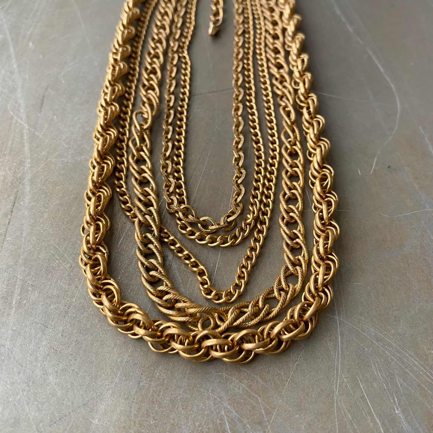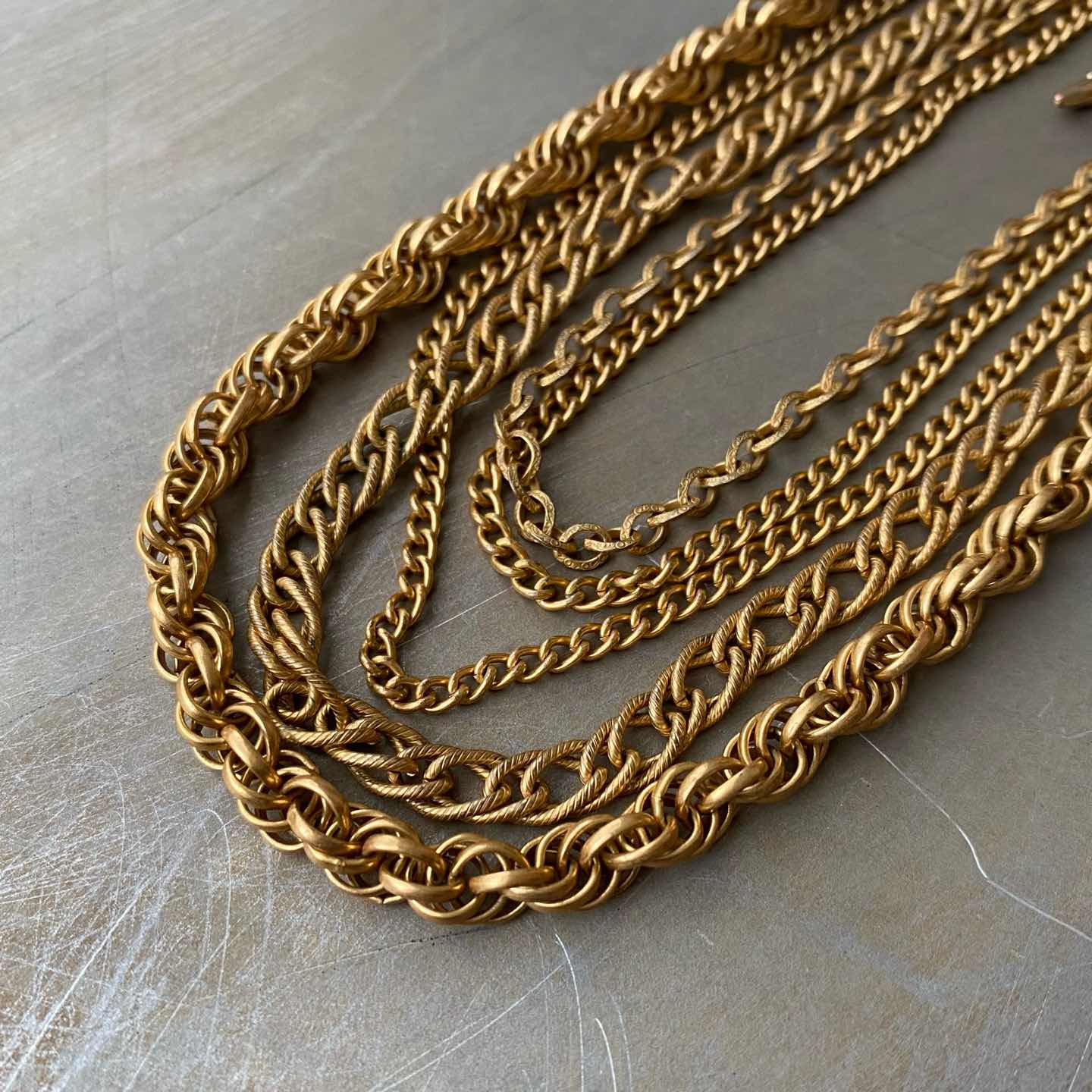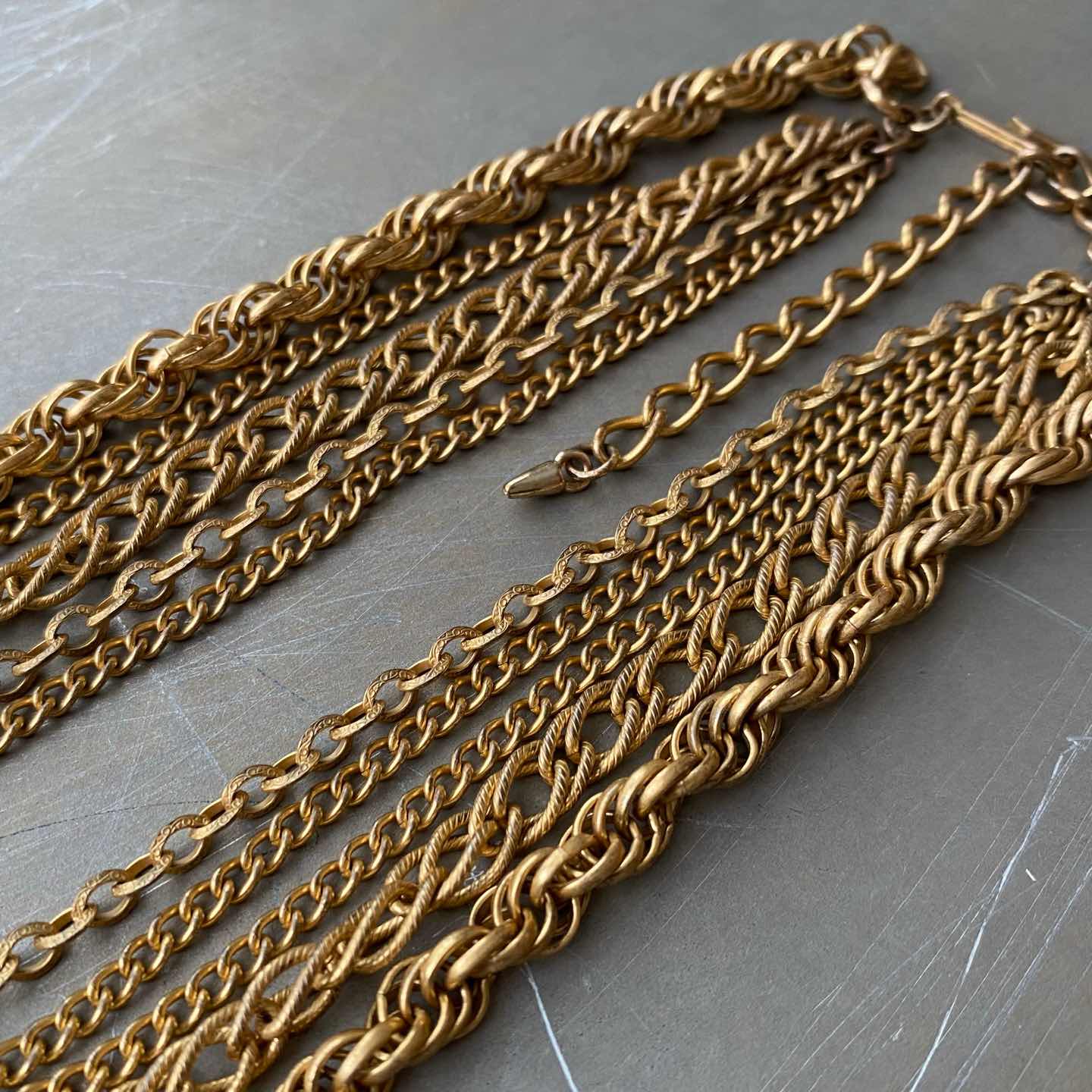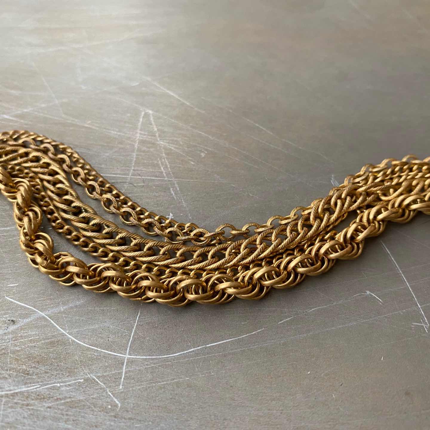 クラシカルな5連チェーンのUSAヴィンテージネックレス。ボリューム感のあるデザインで留め具はヴィンテージならではのフックタイプになっています。古びたメタルの色味も魅力的。存在感がありスタイリングにお洒落な雰囲気をプラスしてくれます。 □Materials メタル(ゴールドメッキ) □Size 全長 約32〜42㎝+アジャスター7㎝ チェーン幅 3〜6.5㎜ 63g □Condition【B】 画像の通り経年によるメタルの変色がみられますが、目立ったダメージの無い良好なヴィンテージコンディションです。中古品であることをご理解のうえお買い求めください。ご購入前にショッピングガイドのご確認をお願いいたします。 【S】未使用 【A】未使用に近い 【B】やや使用感あり 【C】使用感あり Item No.3471