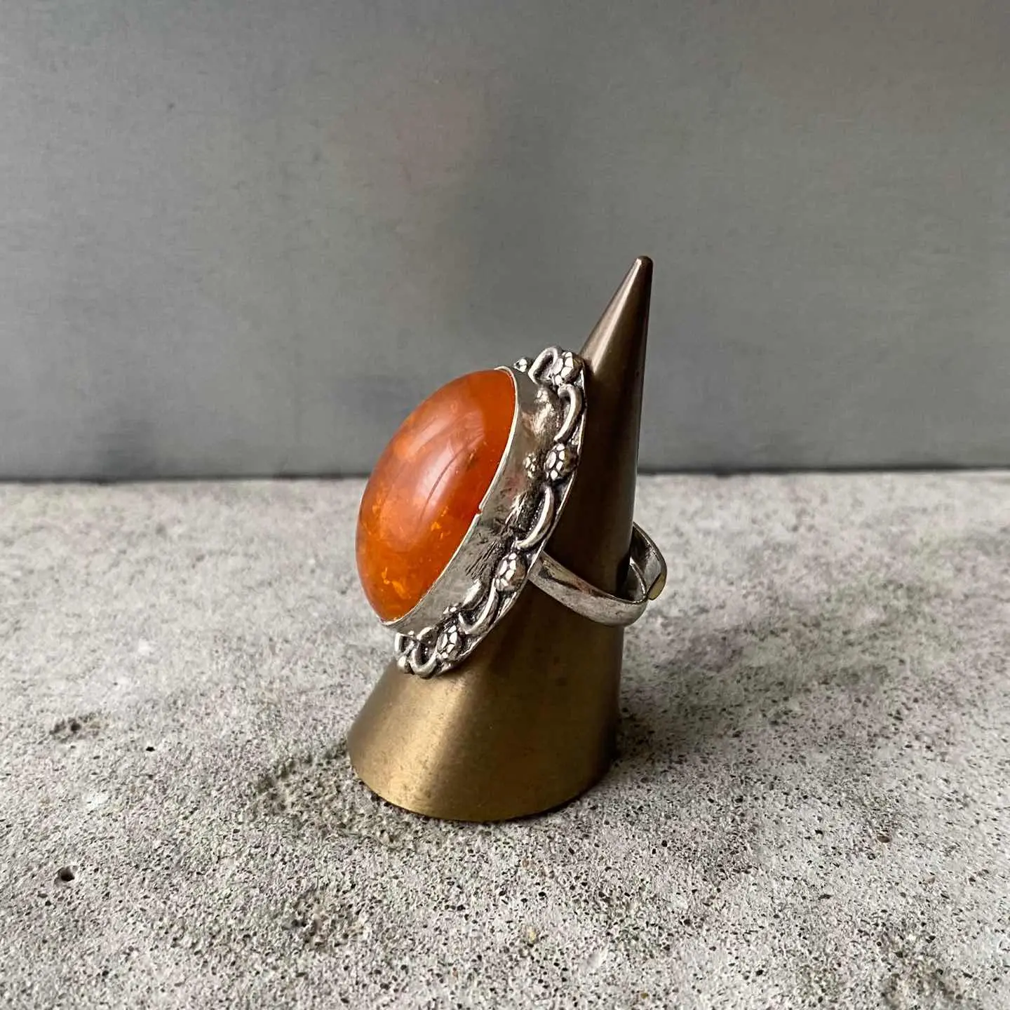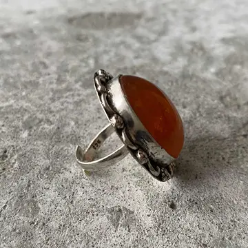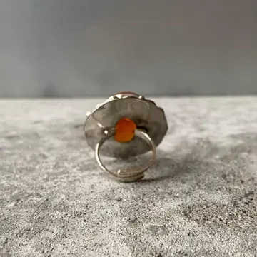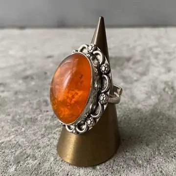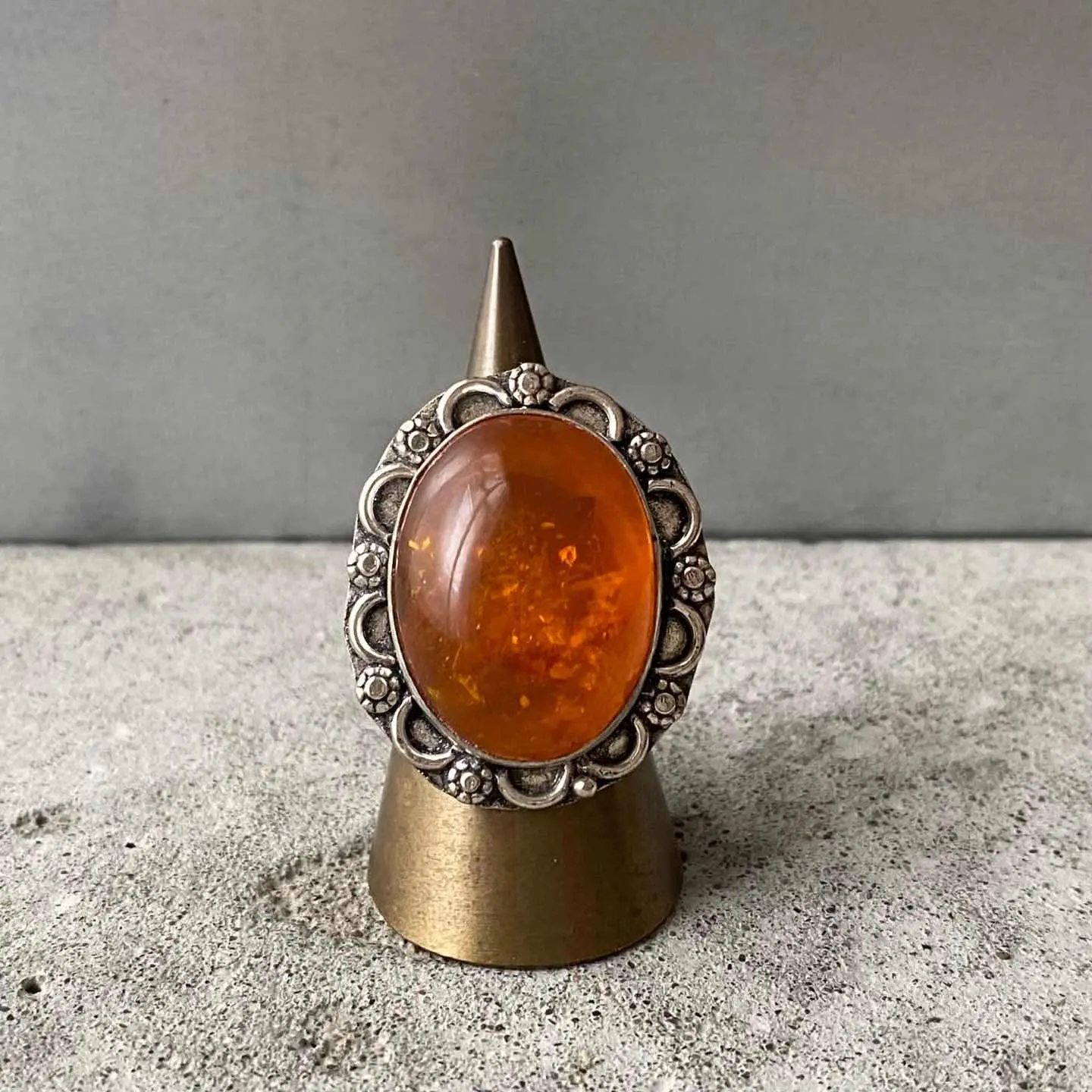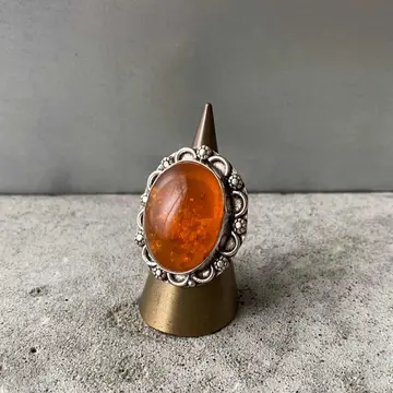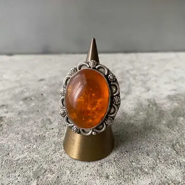 琥珀色の大きなストーンがきらめくリング。レトロなデザインの石座がお洒落な雰囲気。大ぶりで存在感がありコーディネートのアクセントに。古着スタイルにもオススメです。 □Materials 真鍮(シルバー925メッキ)、イミテーションストーン □Size 9号(フリーサイズ) リング幅 約3㎜ 石座部分 約H3.1×W2.6㎝ 8g □Condition こちらの商品は新品です。海外ハンドメイド製品の為ラフな作りがお好きな方にオススメです。元々の作りですが、メタル部分に細かなスレ傷やリングの曲面部分にフラットになっている箇所、ふくりん部分のフチに小さな凹みがみられます。画像をご確認ください。ご購入前に必ずショッピングガイドのご確認をお願いいたします。 Item No.3474
