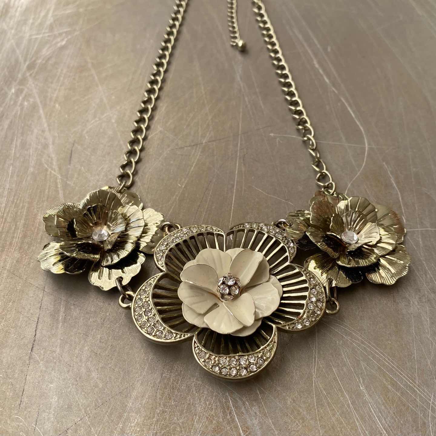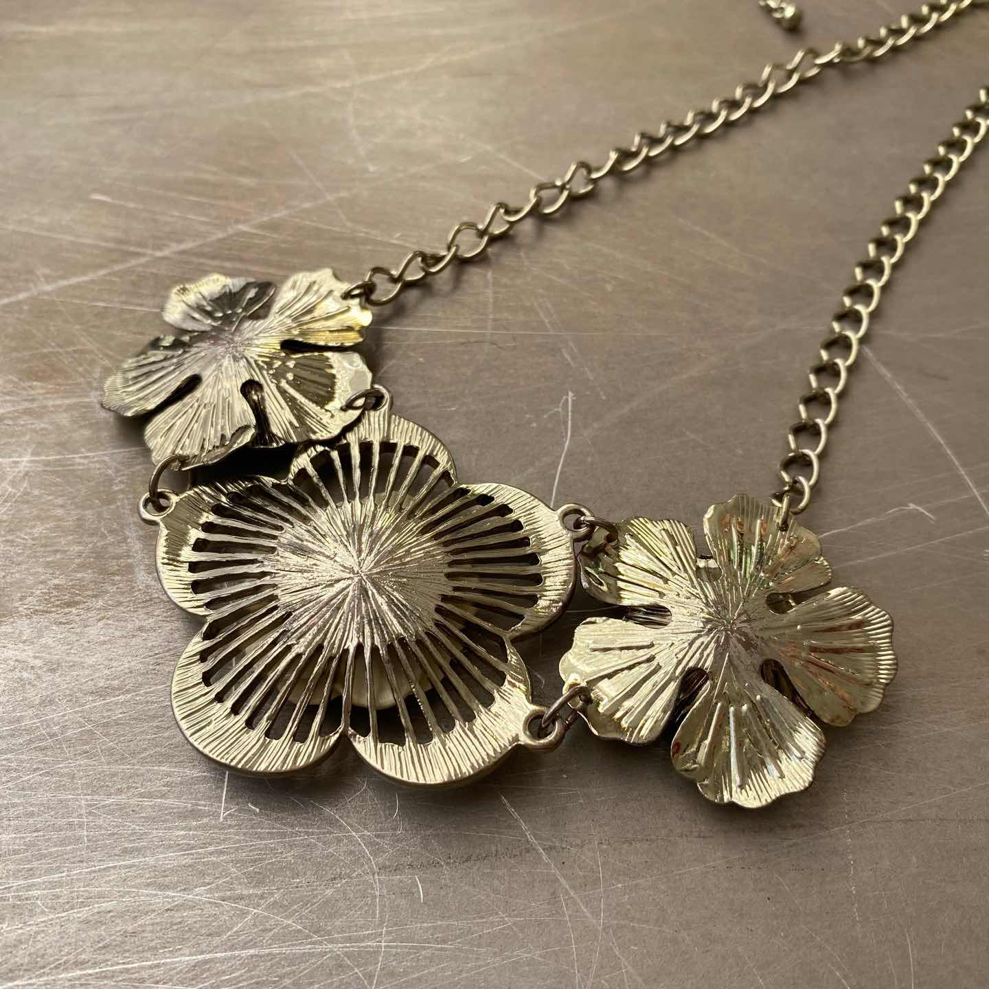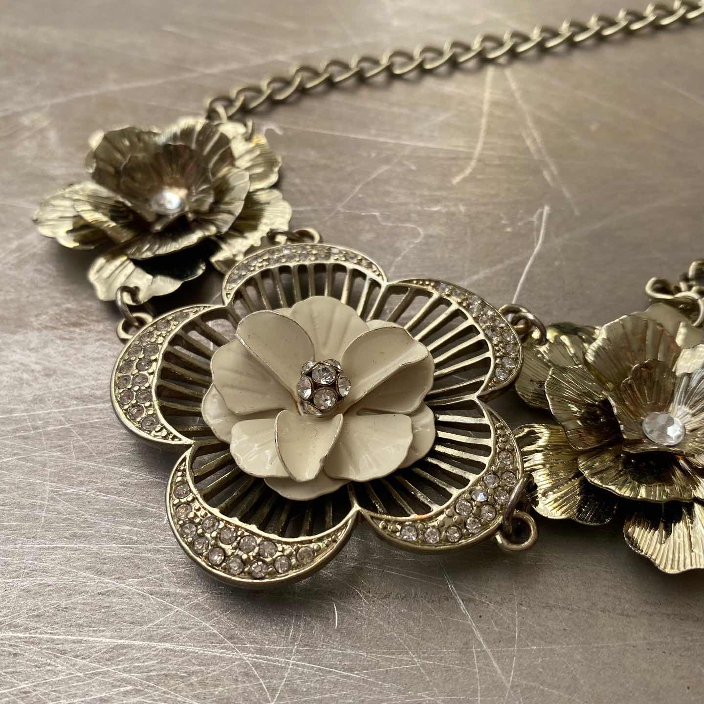 メタルのフラワーパーツにビジューがキラキラと輝くクラシカルな雰囲気のUSAヴィンテージネックレス。大ぶりで存在感がありスタイリングの主役におすすめです。 □Materials メタル(メッキ、塗装)、ガラスストーン □Size 全長 約46㎝+アジャスター7㎝ フラワーパーツ幅 約5.2㎝ 45g □Condition【B】 画像の通り花びらの塗装部分にやや剥がれがみられます。中古品であることをご理解のうえお買い求めください。ご購入前にショッピングガイドのご確認をお願いいたします。 【S】未使用 【A】未使用に近い 【B】やや使用感あり 【C】使用感あり Item No.3478