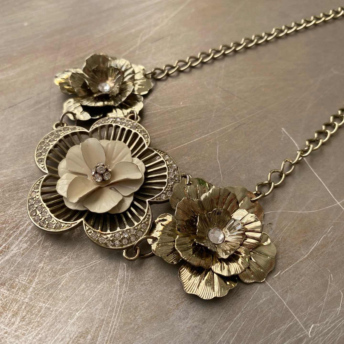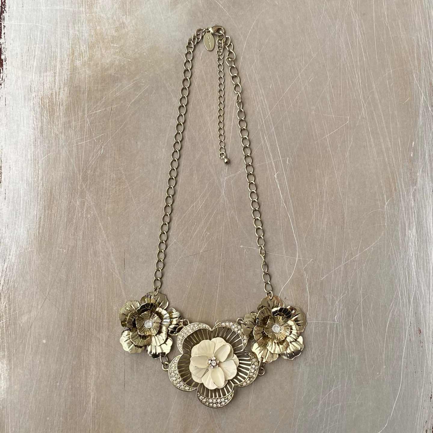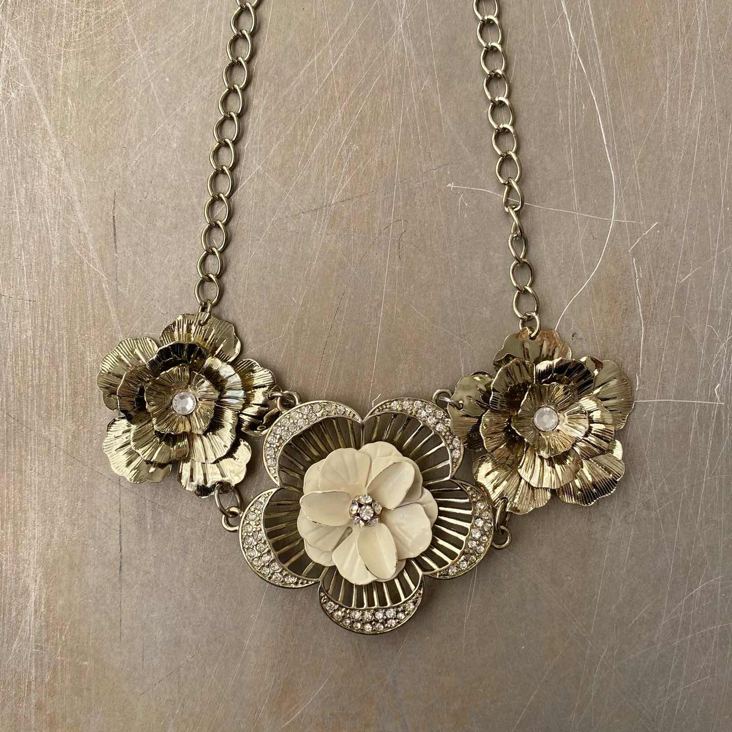メタルのフラワーパーツにビジューがキラキラと輝くクラシカルな雰囲気のUSAヴィンテージネックレス。大ぶりで存在感がありスタイリングの主役におすすめです。 □Materials メタル(メッキ、塗装)、ガラスストーン □Size 全長 約46㎝+アジャスター7㎝ フラワーパーツ幅 約5.2㎝ 45g □Condition【B】 画像の通り花びらの塗装部分にやや剥がれがみられます。中古品であることをご理解のうえお買い求めください。ご購入前にショッピングガイドのご確認をお願いいたします。 【S】未使用 【A】未使用に近い 【B】やや使用感あり 【C】使用感あり Item No.3478