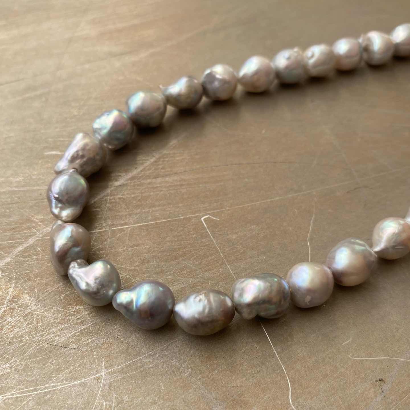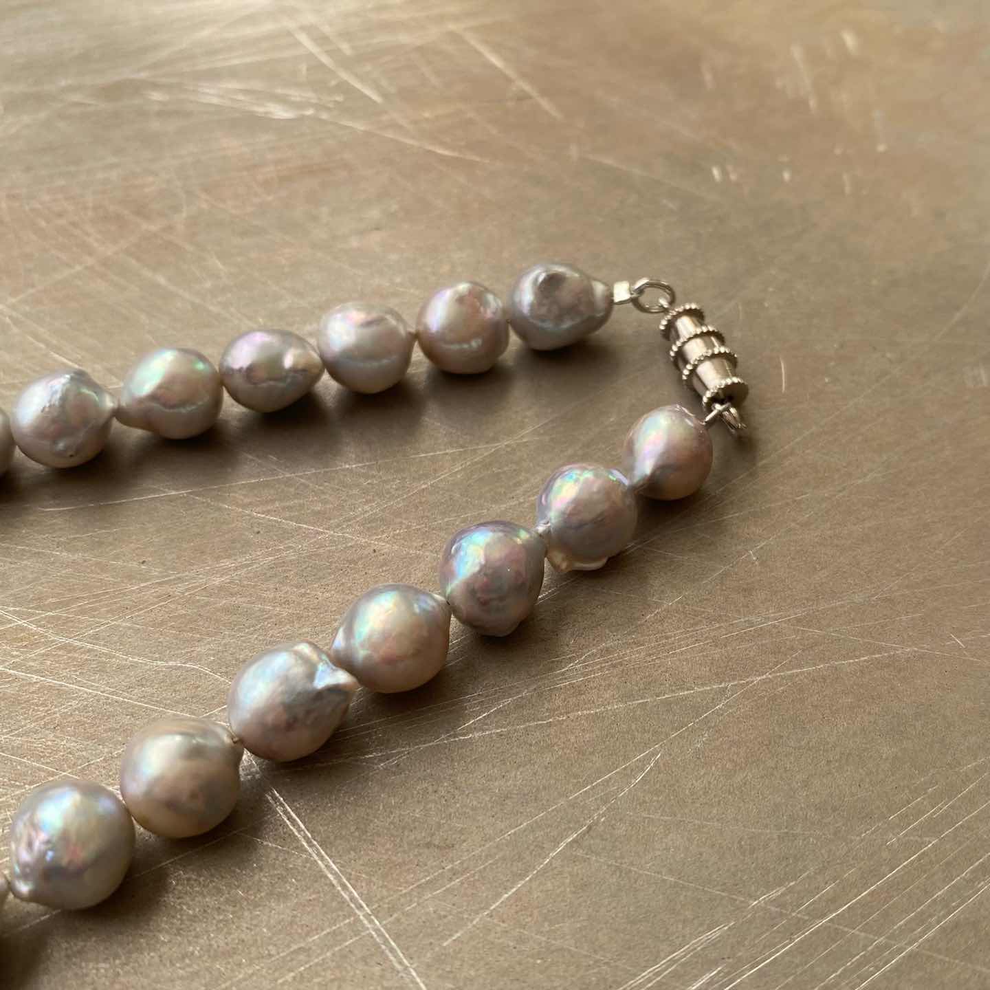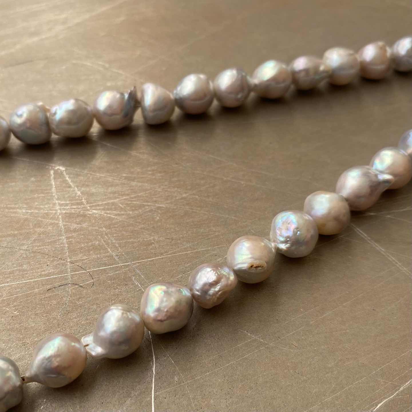 ほんのり玉虫色に輝く美しいパールが魅力的なUSAヴィンテージネックレス。ラフな形のバロックパールがカジュアルなスタイルにも合わせやすくお顔まわりを上品に彩ってくれます。 □Materials 天然石(淡水パール)、メタル(シルバーメッキ) (※ワイヤーおよびカンは新品のものに交換しています) □Size 全長 約38㎝ パール幅 9㎜ 32g □Condition【A】 使用感の少ない良好な状態です。(パールには凹凸や色ムラ等天然石ならではの特徴がみられます)中古品であることをご理解のうえお買い求めください。ご購入前にショッピングガイドのご確認をお願いいたします。 【S】未使用 【A】未使用に近い 【B】やや使用感あり 【C】使用感あり Item No.3477