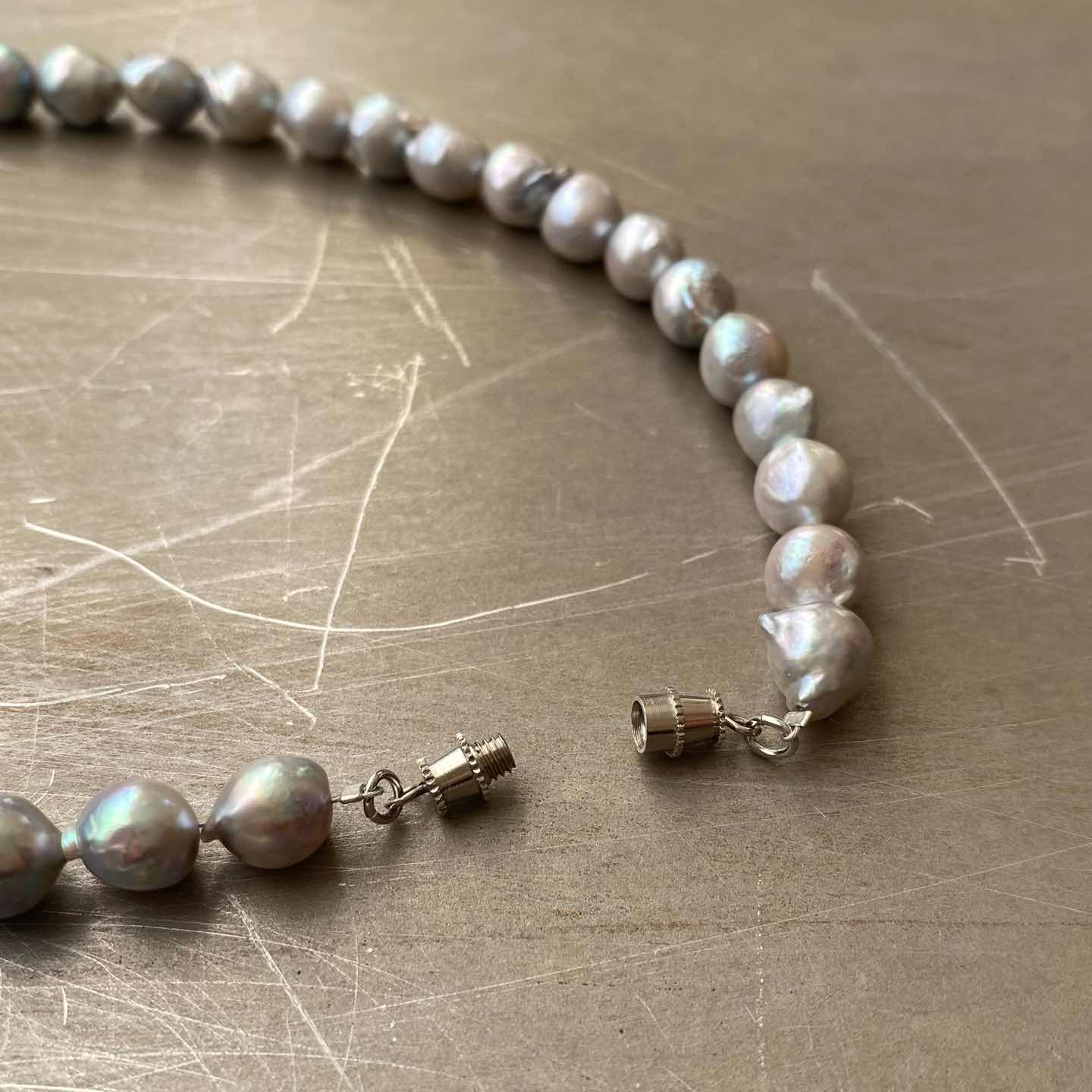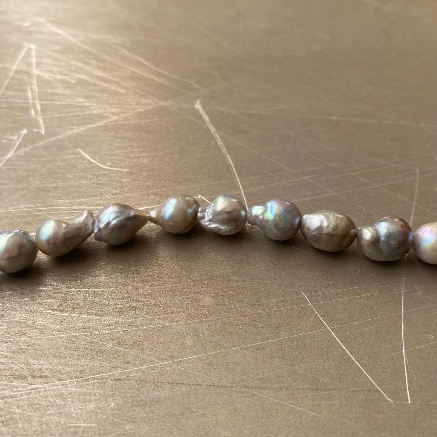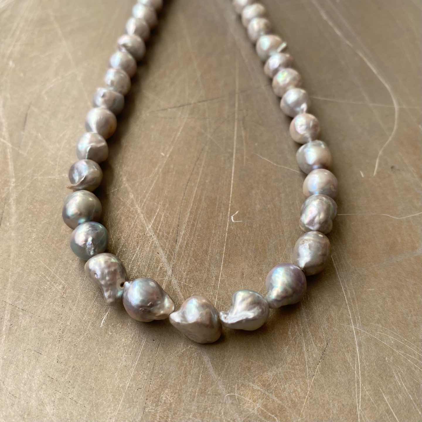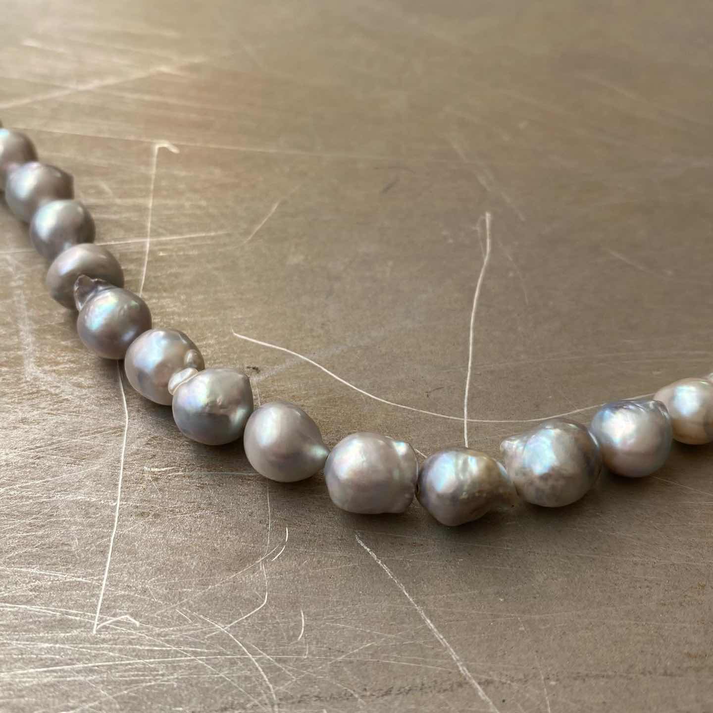 ほんのり玉虫色に輝く美しいパールが魅力的なUSAヴィンテージネックレス。ラフな形のバロックパールがカジュアルなスタイルにも合わせやすくお顔まわりを上品に彩ってくれます。 □Materials 天然石(淡水パール)、メタル(シルバーメッキ) (※ワイヤーおよびカンは新品のものに交換しています) □Size 全長 約38㎝ パール幅 9㎜ 32g □Condition【A】 使用感の少ない良好な状態です。(パールには凹凸や色ムラ等天然石ならではの特徴がみられます)中古品であることをご理解のうえお買い求めください。ご購入前にショッピングガイドのご確認をお願いいたします。 【S】未使用 【A】未使用に近い 【B】やや使用感あり 【C】使用感あり Item No.3477