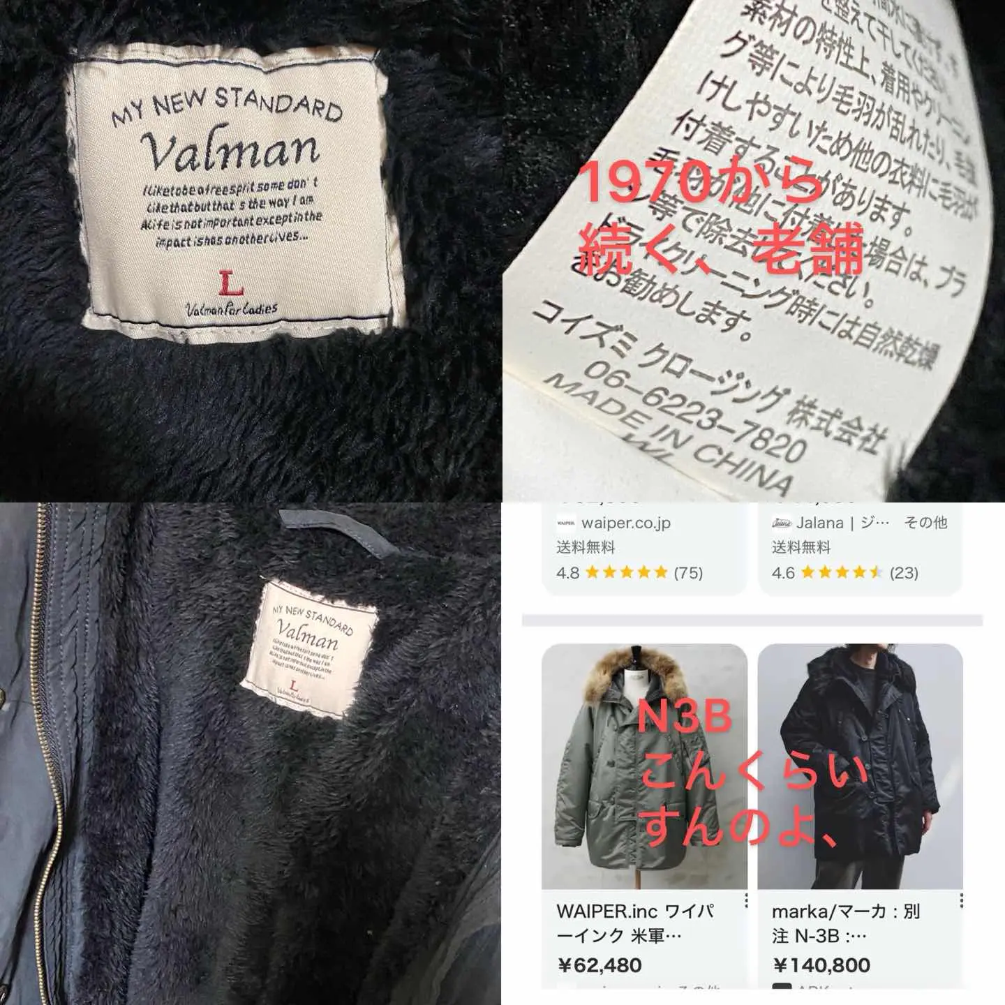 90s 老舗valman 防寒最強 N3B ミリタリージャケット コーデ2個提供、先ず寒い地区の方は、早めに防寒対策して下さい、風邪ひいちゃうよ?です。 コーデ、ミリタリーを、 綺麗目にもってくfudgeコーデ、全て取り扱い商品!! もう一個、よこ!! 私物トラックボトムで、アメカジストリート、要するに、何にでも対応するってことですが、 あまり否定はしたくないですが、ミリタリーは、ガチ着は、やめとけ、が、私の意見です。前締めに、デニム、しかもスタンダードすぎるやつは、、、、ちょっと、古いっす。 さらにこれはかなりお買い得となってますので、下確認後ご購入下さい •Brand:valman •data:90s 限定モデル、ビックタグに、メッセージがその証!! •point:先ず写真全てみてください、N3Bたかっ!! って、方いますよね?? 50000-60000万?へ、ダメージあっても?みたいなね、、当店のは、ダメージ無し、さらに上記理由を1970年代から続く老舗メーカーが買える値段でと、技術を集結したらいいんですね。限定ラインなんで逆に希少価値が上がってしまってます。それは考慮して かっこいいミリタリーを楽しんでください。 ▷color◁ ※ブラウザで異なる場合ありますがかなり実物には、近づけてます、 ▷size◁ 平置き片面採寸【㎝表記】 表記size L表記ですが、そもそも、N3Bは、前締めダサいです、あまり、↓関係ないっす。 着丈/82 身幅/56 肩幅/46 袖丈 /64 DSは袖はハンガー採寸 ※多少の誤差は理解下さい 170/Mジャスト体型の私が着て、✔️参考に ジャスト オーバーサイズ✔︎ ビックサイズ インナーフリーセーターですよ?前開けすりゃ、関係ない、 【素材】 ポリ92 ナイロン8 リモンタですね、質が違うし、ミリタリーリミテッドだから、最高級使ってます 【状態】 フェード感が逆にカッコいいしミリタリーは、価値上がります。前の方が大切に着てたんでしょう。ダメージ無し 検品、洗濯、検品で、3回チェックして発送しますので、ご安心して、お買い求め下さい!! #N3B #冬服