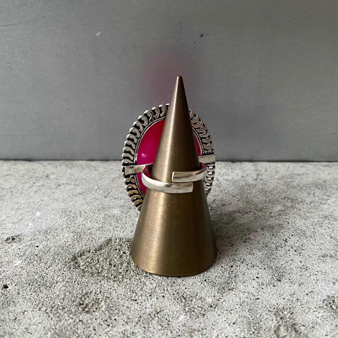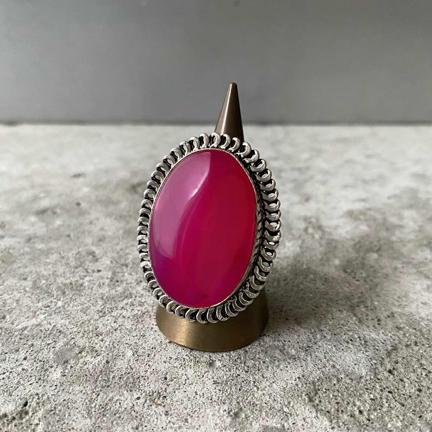 大きなピンク色のストーンが可愛らしい天然石リング。クラシカルなデザインの石座がお洒落な雰囲気。「カルセドニー」は、コミュニケーションをサポートし、心地よい人間関係へや良縁へ導いてくれると言い伝えられています。大ぶりで存在感がありコーディネートの差し色におすすめです。 □Materials 天然石(カルセドニー)、真鍮(シルバー925メッキ) □Size 9号(フリーサイズ) リング幅 約3㎜ 石座部分 約H3.6×W2.7㎝ 11g □Condition こちらの商品は新品です。海外ハンドメイド製品の為ラフな作りがお好きな方にオススメです。元々の作りですが、メタル部分に細かなスレや曲面部分にフラットになっている箇所がございます。石材はキレイな楕円形ではなくラフカットです。(※石材には内包物やクラックなど天然石ならではの特徴がみられます)ご購入前に必ずショッピングガイドのご確認をお願いいたします。 □Attention こちらの石材は染色加工がされています。色落ちテスト済で通常の使用には問題ございませんが、汗や雨等で湿った場合他の衣類などに色が移ることがありますのでご注意ください。 Item No.3486