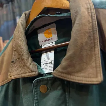 Carharttのレザーショルダー × ダック地ハンティングジャケットです。深緑のダック地にブラウンレザーの切替が入った希少デザインで、アメカジらしい重厚感のある1着です。XL表記でゆったり着られます。 ショルダーと襟のレザーパーツに自然なエイジングがありますが、雰囲気としてとても良く、全体的に古着としては良好なコンディションです。大容量ポケットやしっかりした生地感など、カーハートらしいタフな作りが特徴です。 雰囲気系のアウターを探している方におすすめで、冬〜春のライトアウターとしても活躍します。古着にご理解のある方のみご検討ください。 福島県の古着屋willrebirthがセレクト。