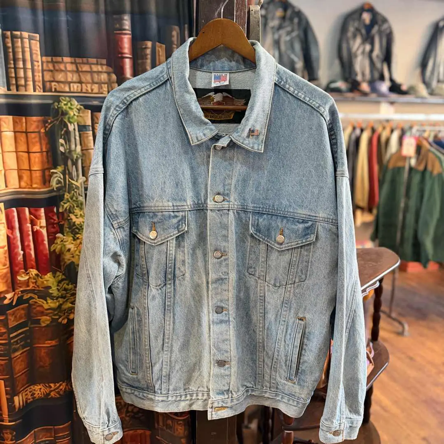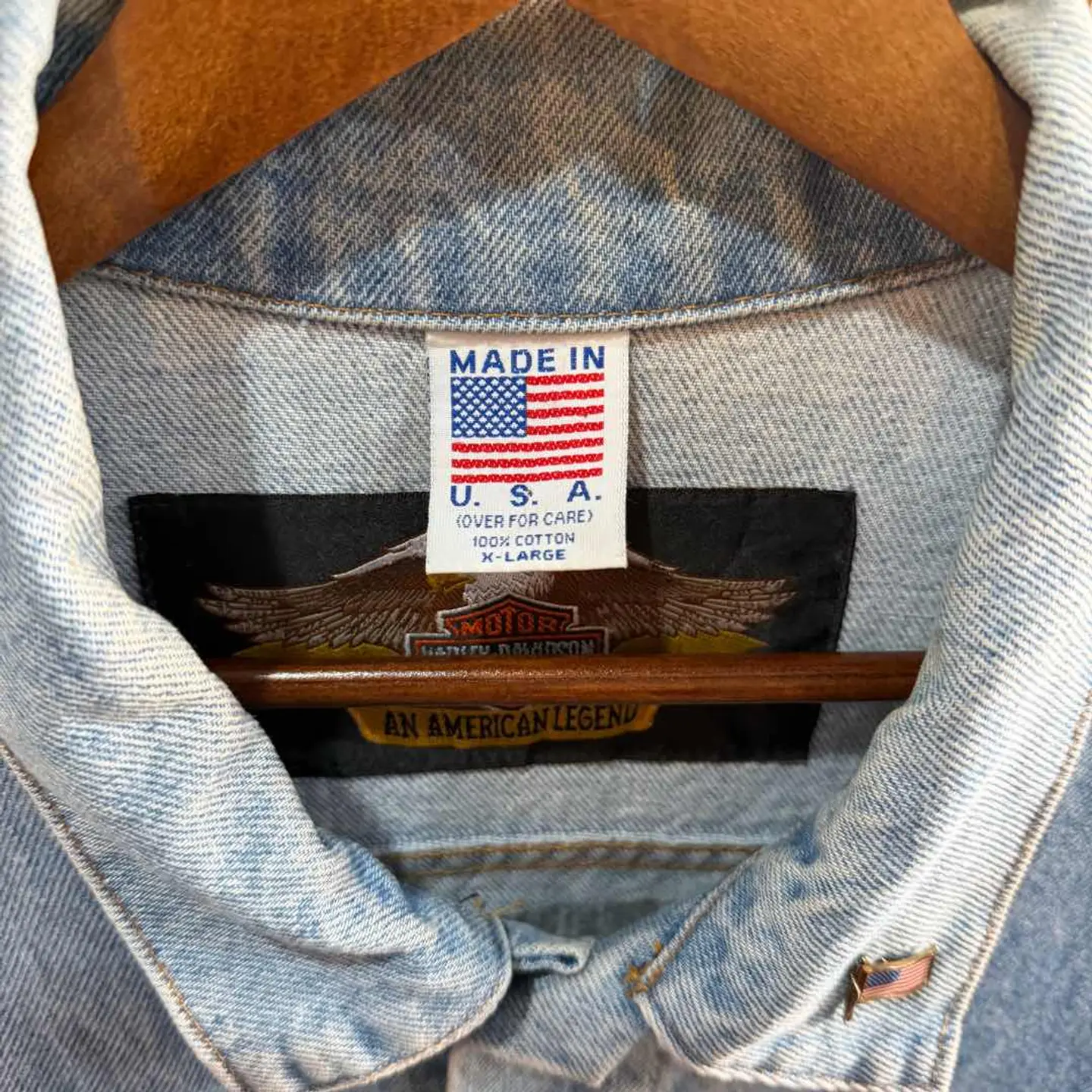 福島県の古着屋「WillRebirth」がセレクトしたHarley-DavidsonのUSA製デニムジャケットです。淡いライトインディゴの色落ちに、胸のハーレーロゴタグが入った雰囲気抜群の1着です。アメリカ国旗ピンバッジ付きで、ハーレーらしい無骨さがしっかり感じられます。 MADE IN USA表記の希少なモデルで、デニムのアタリや色落ちも良く、アメカジ・バイカー・ストリートなど幅広いスタイルに合わせやすいライトアウターです。サイズはXLでゆったりシルエット。 古着らしい自然な使用感はありますが、着用に問題のあるダメージはありません。ハーレーのデニムを探している方におすすめです。古着にご理解のある方のみご検討ください。
