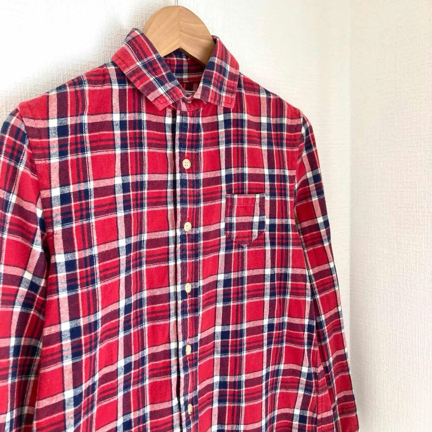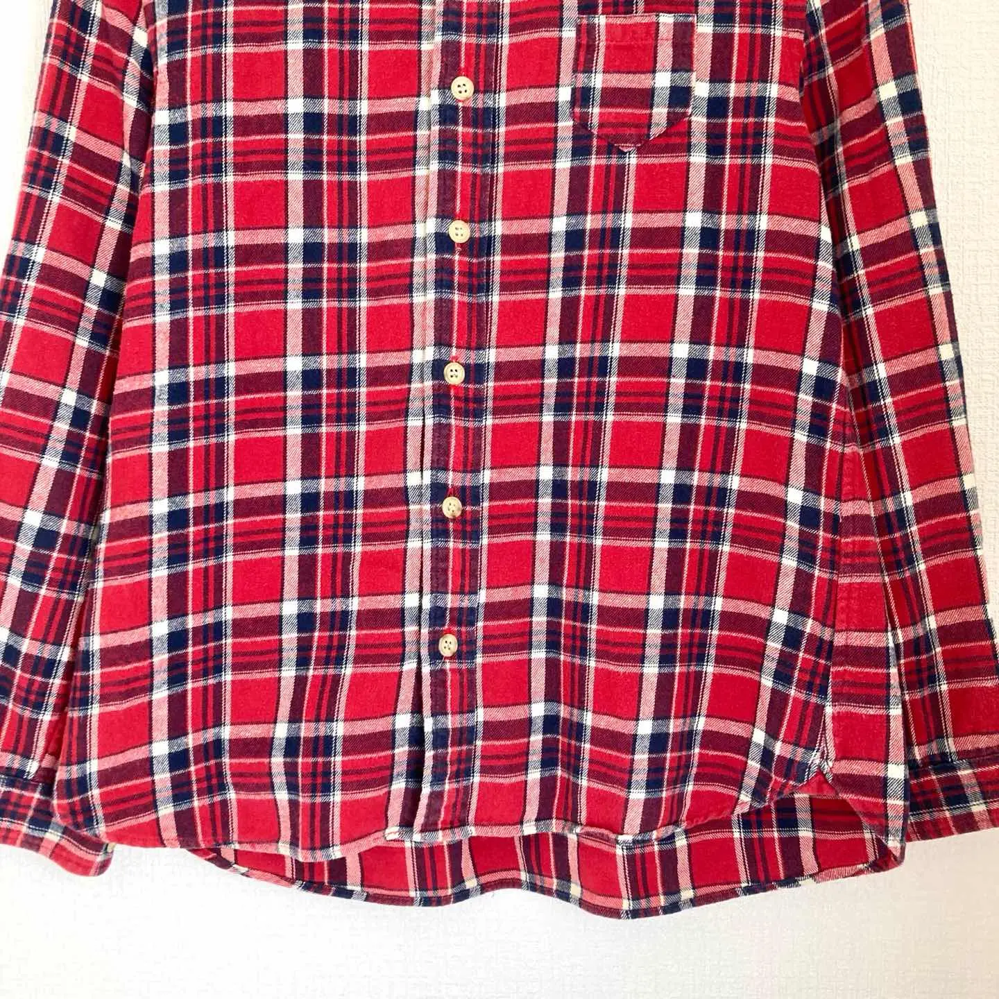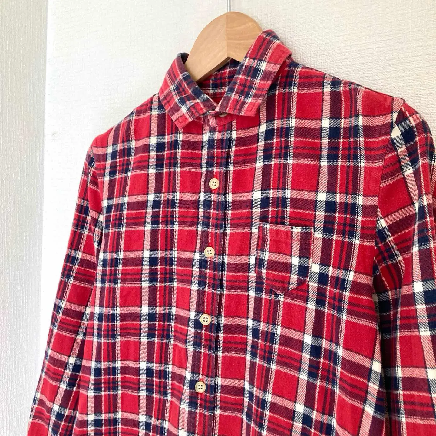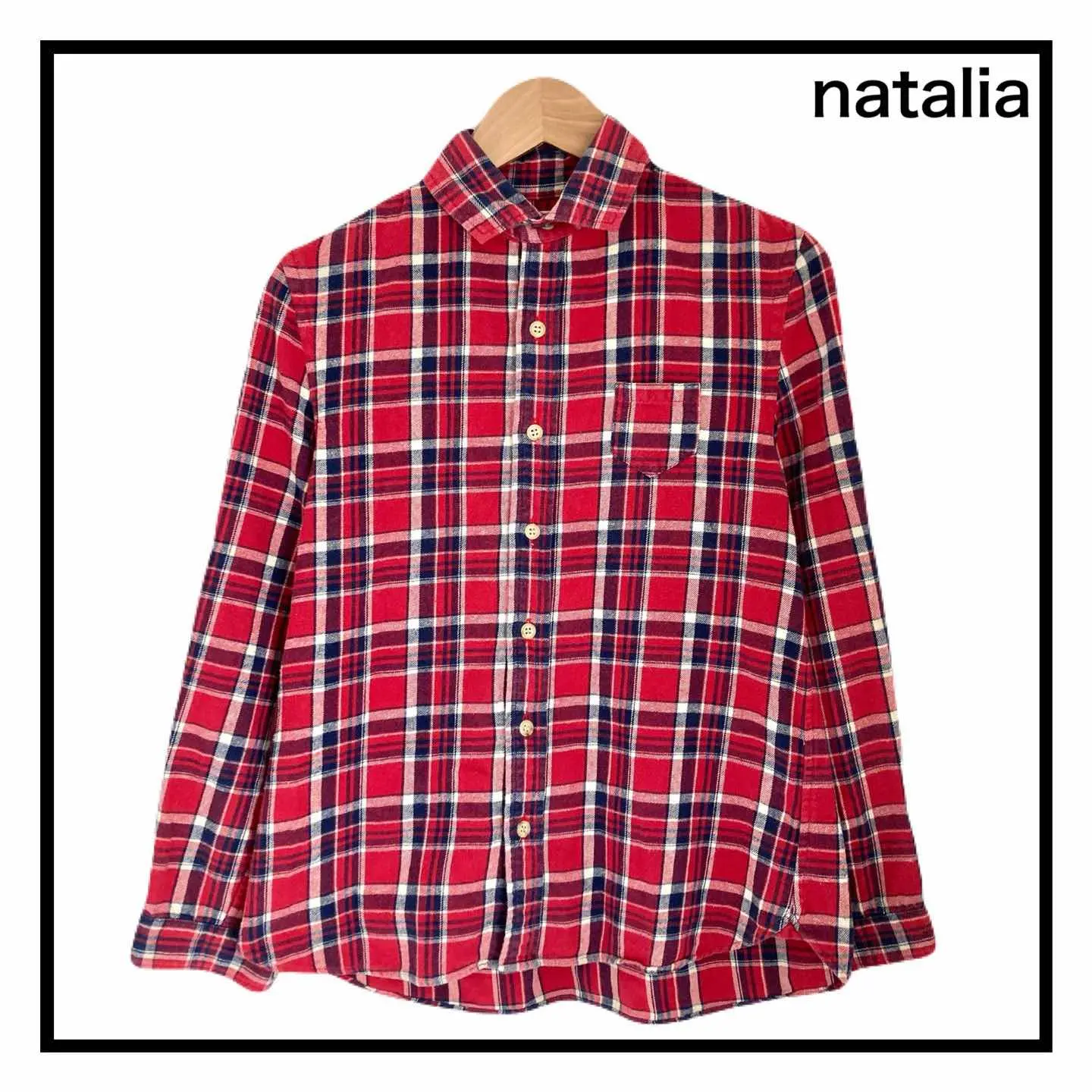 このnataliaのラウンドカラーシャツは、鮮やかなレッドチェック柄が特徴の一枚です!ネル素材の柔らかな肌触りが心地よく、さりげなくカジュアルさを演出します。着心地も抜群。 どんなシーンでも活躍すること間違いなしのアイテムです。デニムやスカート、さらにはシャツジャケットとして合わせることで、自在にスタイルを楽しむことができます。 ブランド natalia 商品名 natalia Round Collar Shirts チェック柄 レッド レディース ネルシャツ サイズ フリーサイズ 肩幅37.5㎝ 身幅45㎝ 袖丈51.5㎝ 着丈前58㎝ 後62㎝ カラー レッド系 #ABY280 #ふくしるべのシャツ