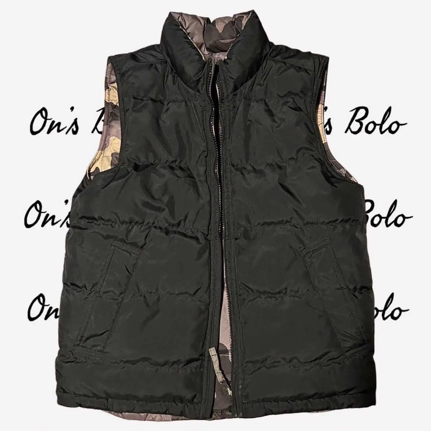 90〜00's GAP ブラックと迷彩柄の短丈の裏表で着れるダウンベストです. 暖かさが残る今の時期にピッタリな1着だと思います.