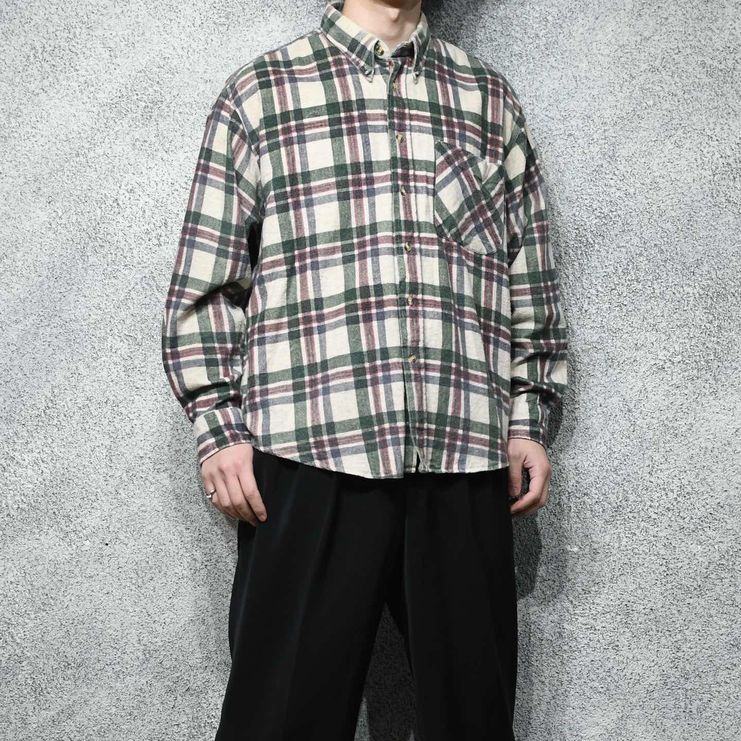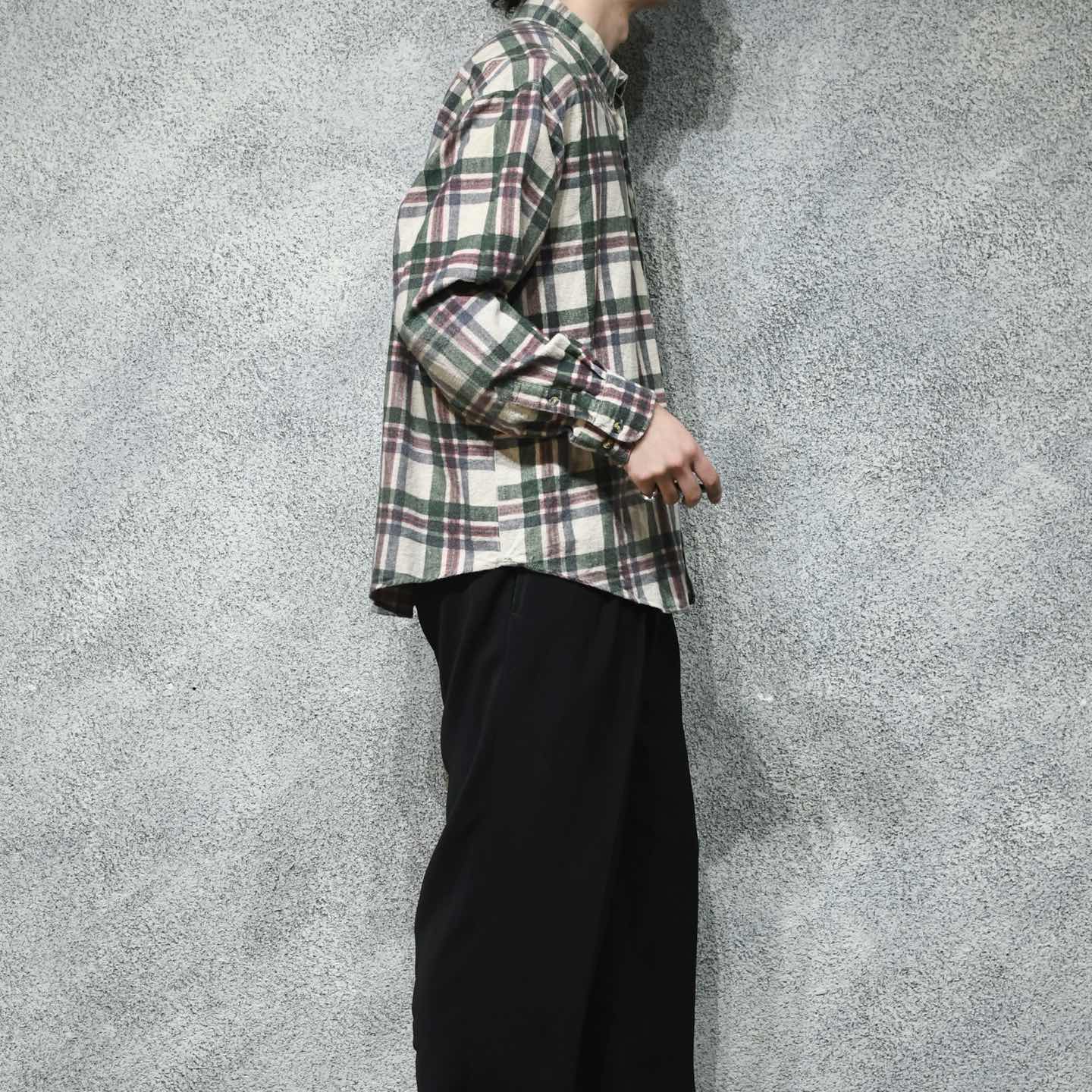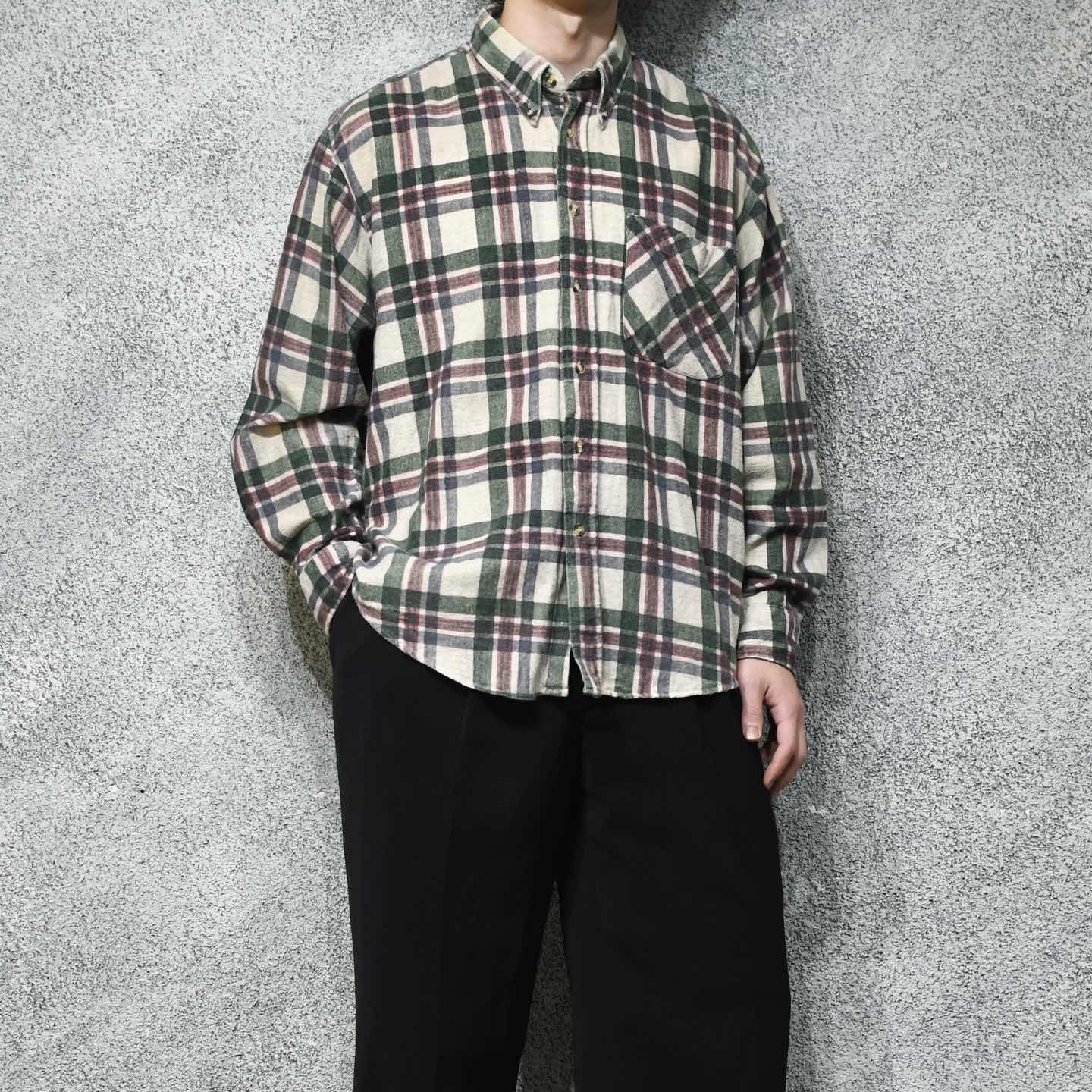 SIZE:43/44 着丈73cm 肩幅54cm 身幅68cm 袖丈60cm fabric/cotton 着用画像 177cm/64kg 元よりこの色使いのチェックシャツを 探している方は居ないかと思いますが、 アースカラーをベースに選ばれた3色から生まれる、 優しくも独特な雰囲気に惹かれました。 またふわっと起毛した生地も肌触りが良く、 角の無い印象です。 チェック柄、そしてシャモア生地。 カジュアルな印象を与える要素を持ちながら、 程よく個性をもスタイリングに乗せることが 出来る逸品です。 ※撮影状況により、実物と多少色が異なる場合が ございます。 ※古着を取り扱っているため、気づかない汚れや ほつれ等がある場合がございます。 予めご了承ください。 ※サイズは着用感で選んでおり、 表記サイズではございません。 表記サイズは説明欄の最初に記載しております。 old vintage ヴィンテージ used 80's 90's アメリカ古着 ユーロ古着 POLO RALPH LAUREN Eddie Bauer OLD GAP LANDS' END ランズエンド LLBean エルエルビーン オールドギャップ エディーバウアー ラルフローレン ブルックスブラザーズ Brooks Brothers 緑 グリーン ベージュ アイボリー 生成り ネルシャツ アメカジ などがお好きな方 #vintage #old #used #90s #80s #古着 #ヴィンテージ #アメリカ古着 #ユーロ古着 #LLBean #エルエルビーン #EddieBauer #エディーバウアー #oldgap #オールドギャップ #LANDSEND #ランズエンド #NAUTICA #ノーティカ #ラルフローレン #POLORALPHLAUREN #ブルックスブラザーズ #BrooksBrothers #チェックシャツ #長袖シャツ #シャツ #ネルシャツ #アメカジ