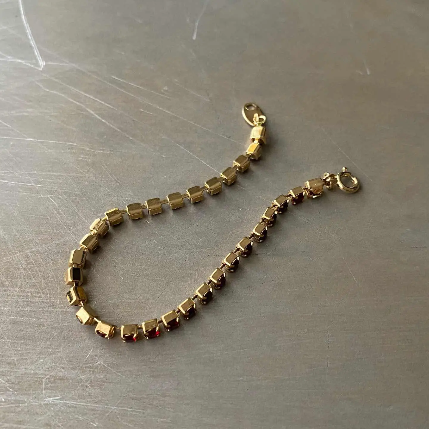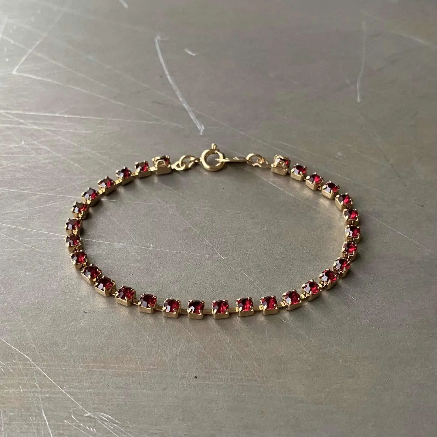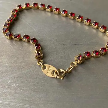 1886年にNYで香水会社として創業し、1971年よりコスチュームジュエリーの制作を始めたブランド「AVON」のUSAヴィンテージテニスブレスレット。赤いビジューがキラキラと輝くシンプルながら美しいデザインです。 □Materials メタル(ゴールドメッキ)、ガラスストーン □Size 全長 約17.3㎝ 幅 約3㎜ 3g □Brand AVON(エイボン) 刻印入り □Condition【A】 使用感の少ない良好な状態です。中古品であることをご理解のうえお買い求めください。ご購入前に必ずショッピングガイドのご確認をお願いいたします。 【S】未使用 【A】未使用に近い 【B】やや使用感あり 【C】使用感あり Item No.3504