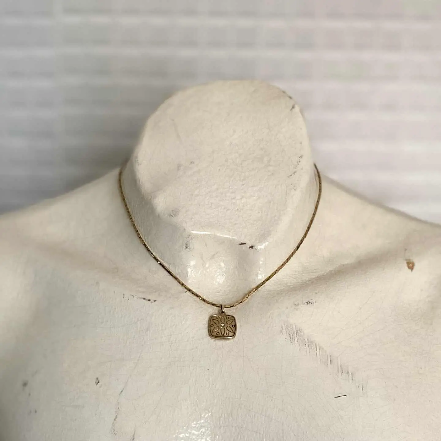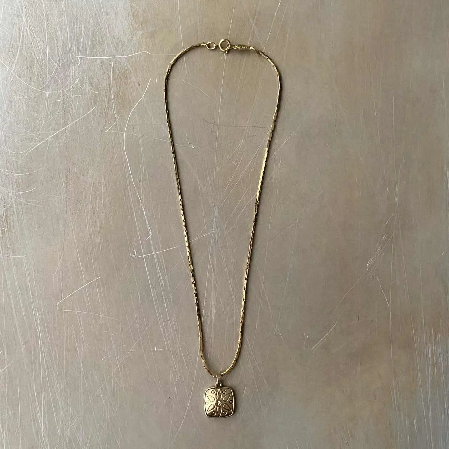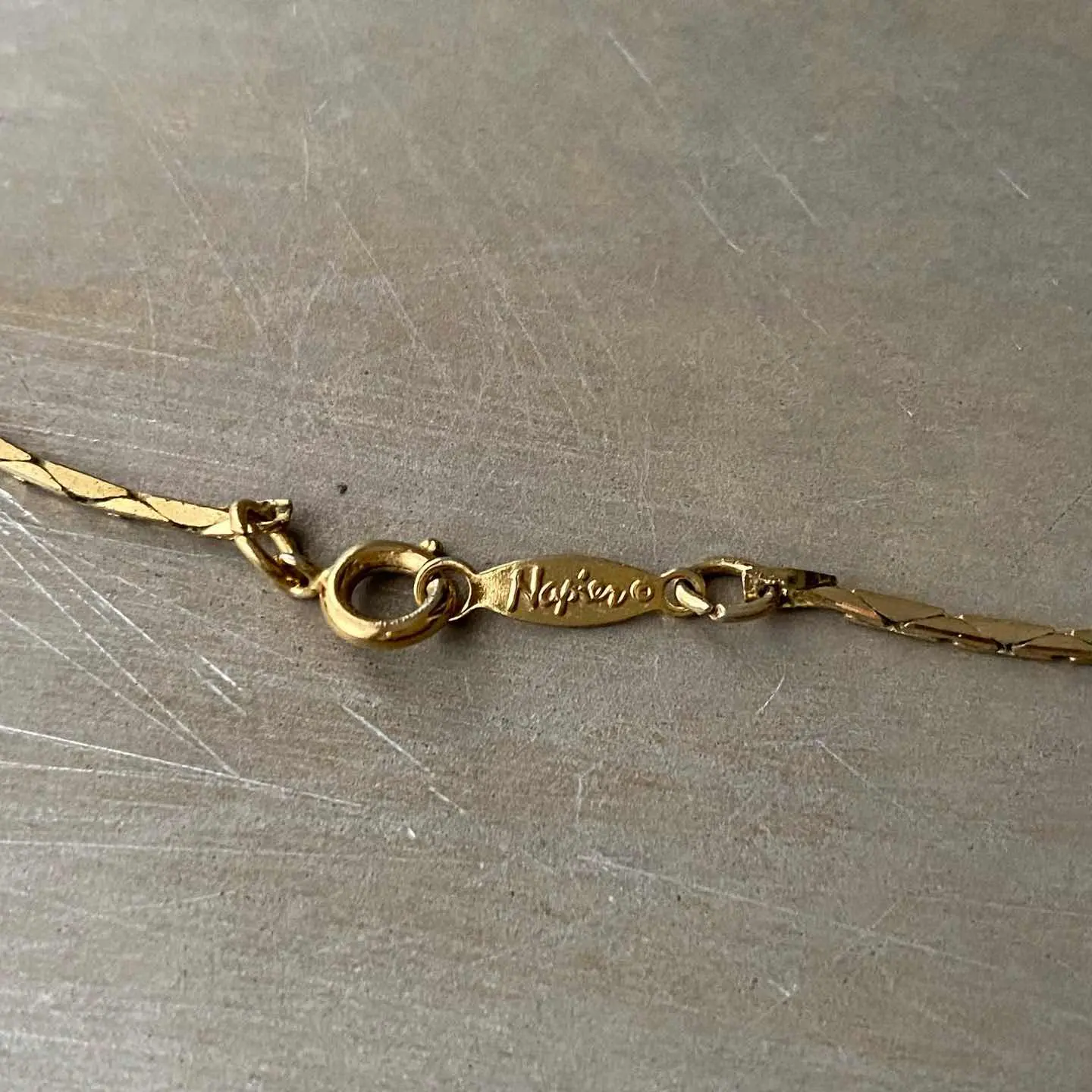 1878年にマサチューセッツ州で創立されたジュエリーブランド「NAPIER」のUSAヴィンテージネックレス。フラワーモチーフの中央にビジューがさりげなく輝く魅力的なデザインです。 □Materials メタル(ゴールドメッキ)、ガラスストーン □Size 全長 約38.5㎝ チャーム 約H2×W1.5㎝ 6g □Brand NAPIER (刻印入り) □Condition【B】 経年によるメタルのトーンダウンはみられますが、目立ったダメージの無い良好なヴィンテージコンディションです。中古品であることをご理解のうえお買い求めください。ご購入前に必ずショッピングガイドのご確認をお願いいたします。 【S】未使用 【A】未使用に近い 【B】やや使用感あり 【C】使用感あり Item No.3506