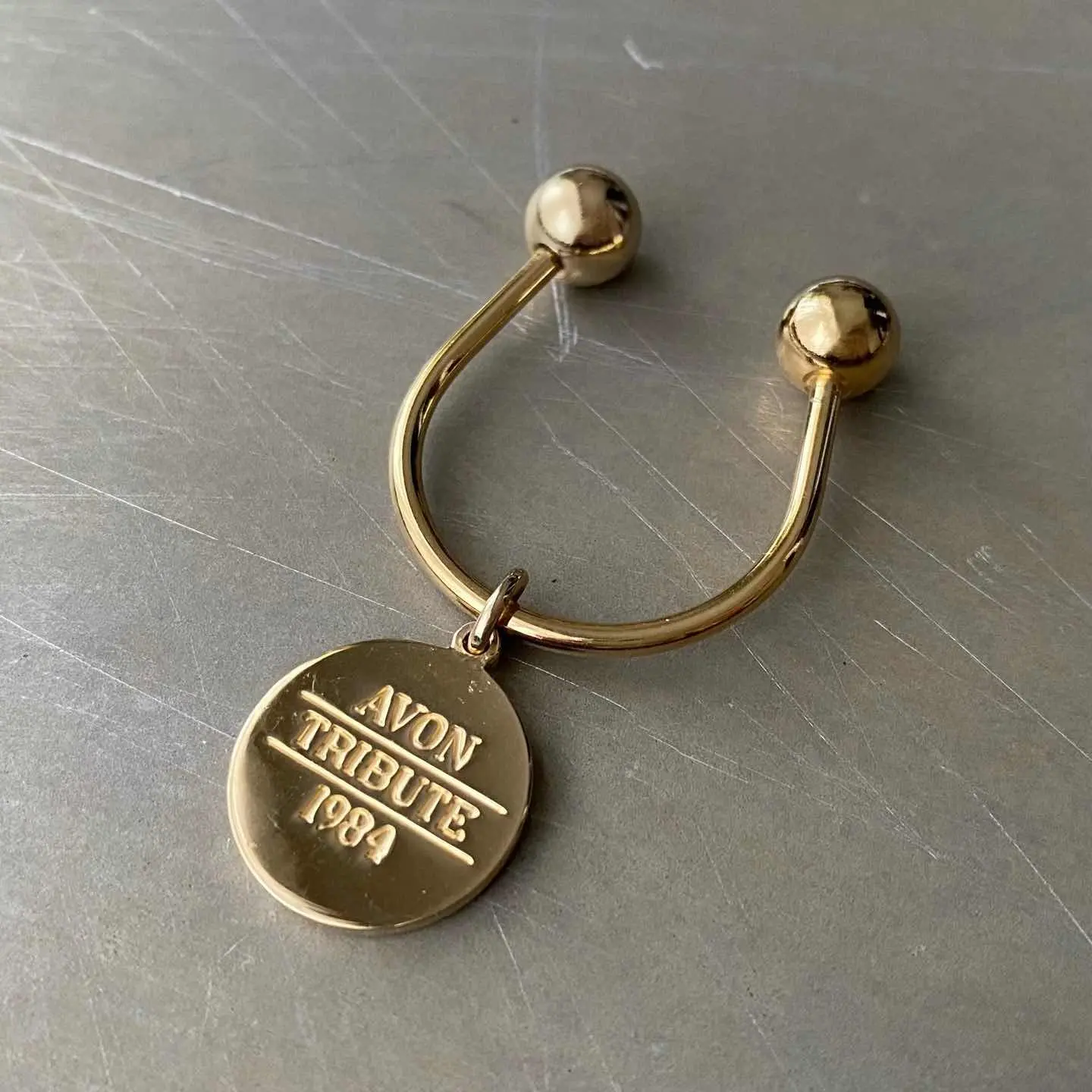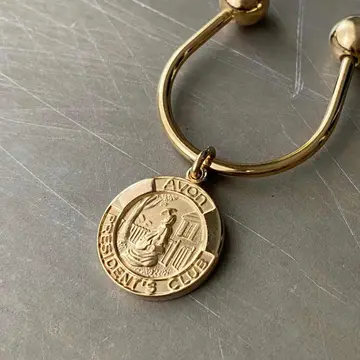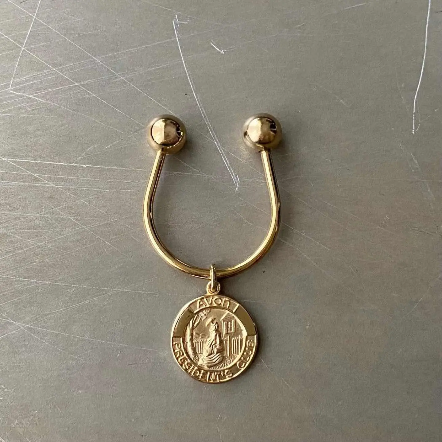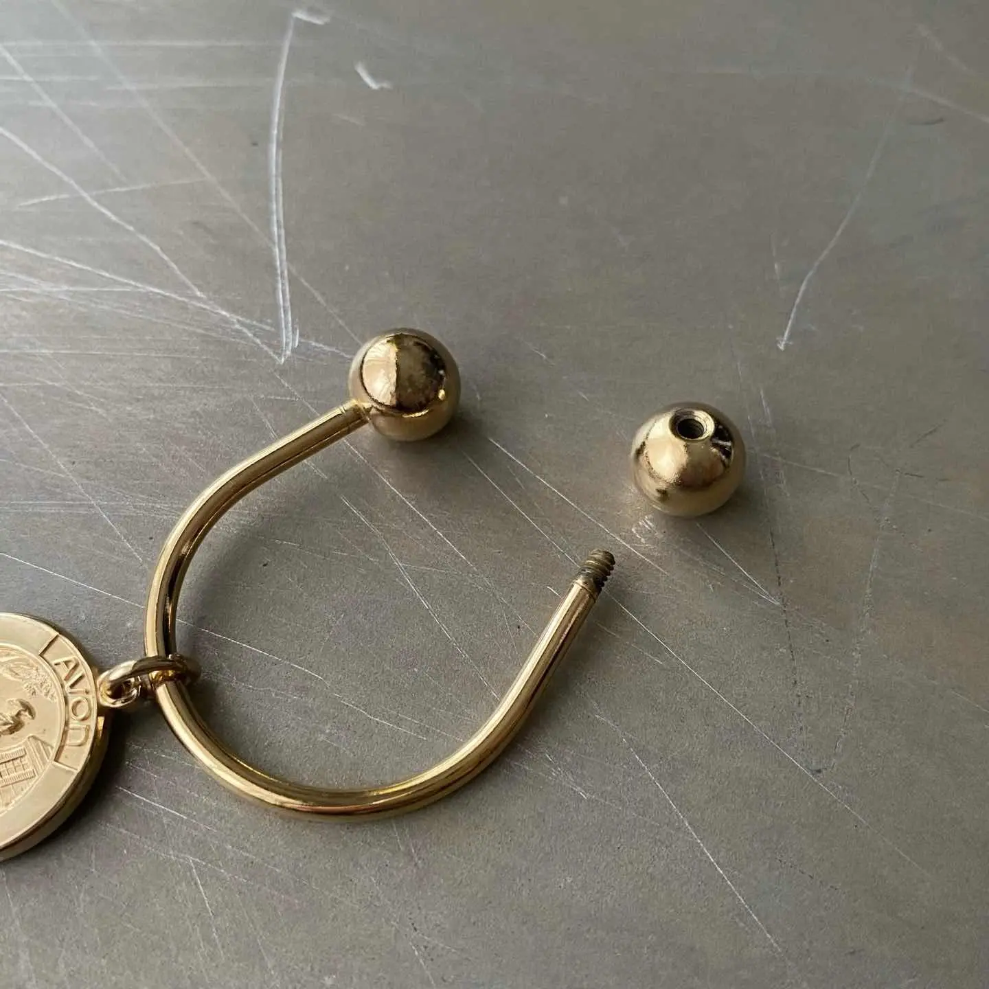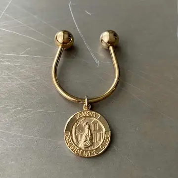 1886年にNYで香水会社として創業し、1971年よりコスチュームジュエリーの制作を始めたブランド「AVON」のUSAヴィンテージキーチェーン。コインが揺らめくお洒落なデザイン。ホースシューの形は「幸せを呼び込む」ラッキーアイテムとして親しまれています。向かって右側のボールを回すと鍵が通せるようになっています。 □Materials メタル(ゴールドメッキ) □Size 約H6.1×W3.1㎝ ボール部分直径 約9㎜ 15g □Brand AVON(エイボン) 刻印入り □Condition【B】 目立ったダメージの無い良好なヴィンテージコンディションです。中古品であることをご理解のうえお買い求めください。ご購入前に必ずショッピングガイドのご確認をお願いいたします。 【S】未使用 【A】未使用に近い 【B】やや使用感あり 【C】使用感あり Item No.3505