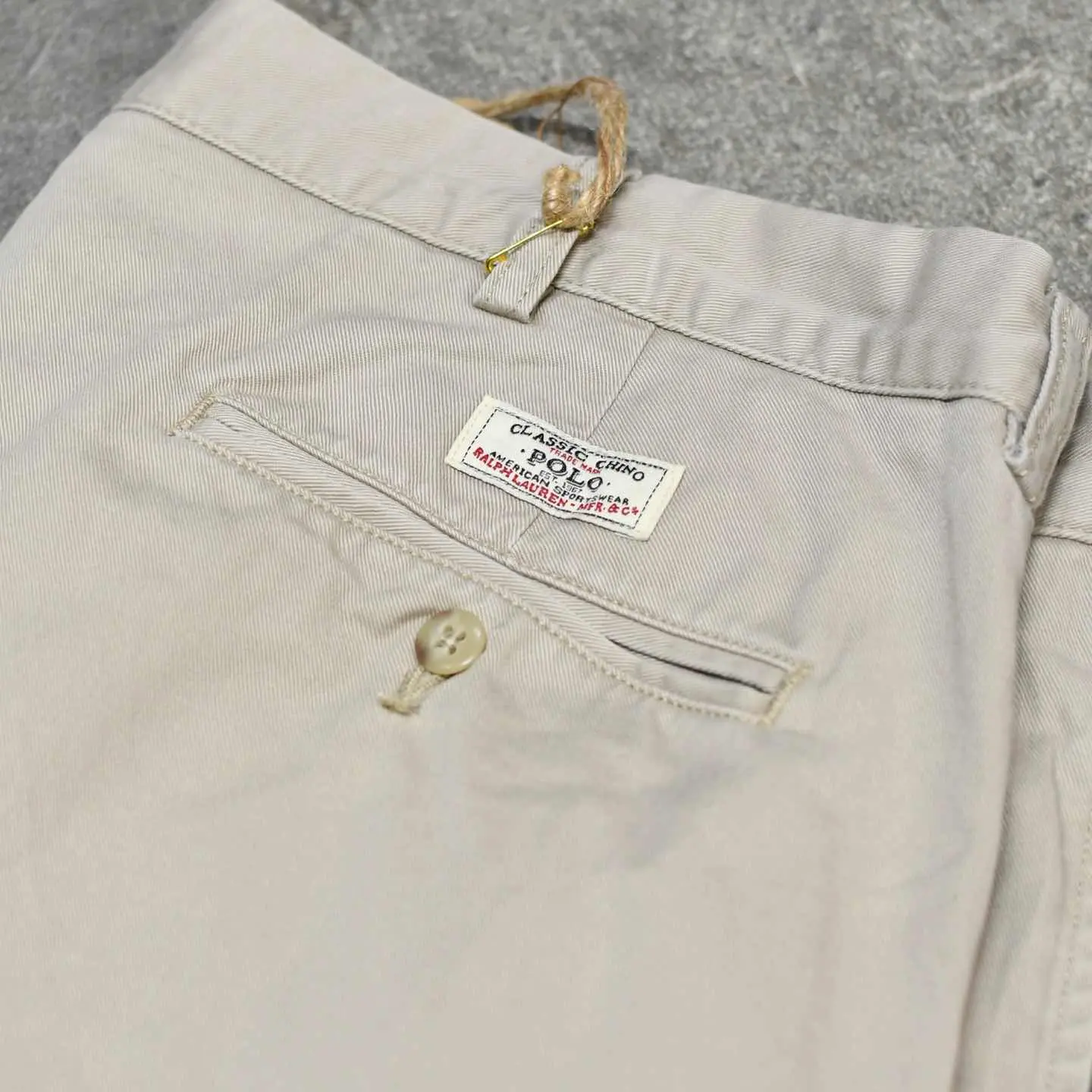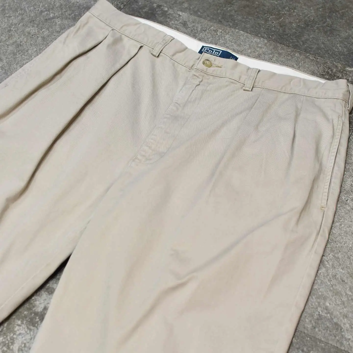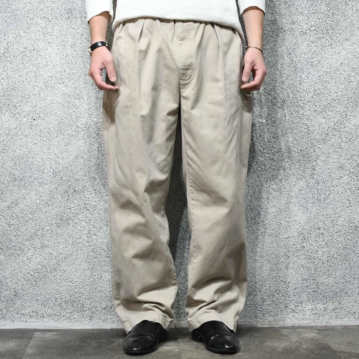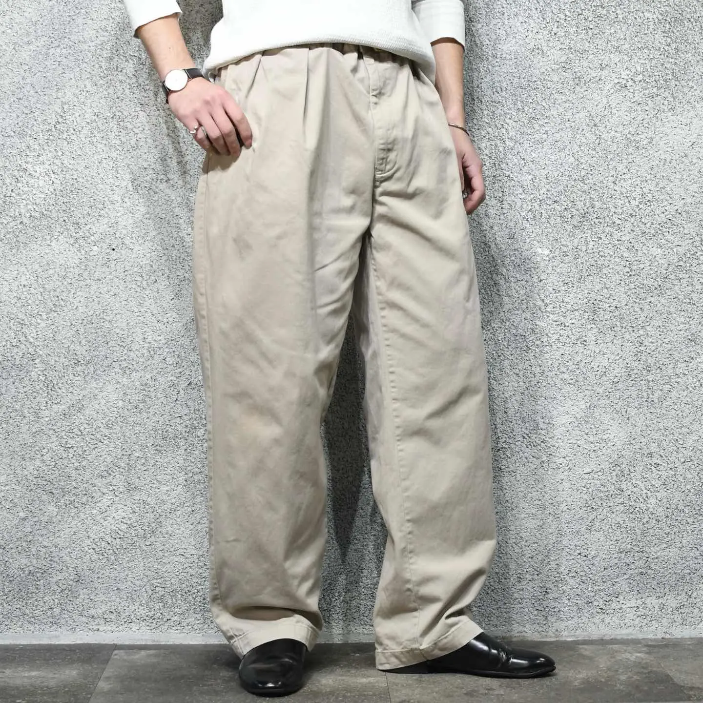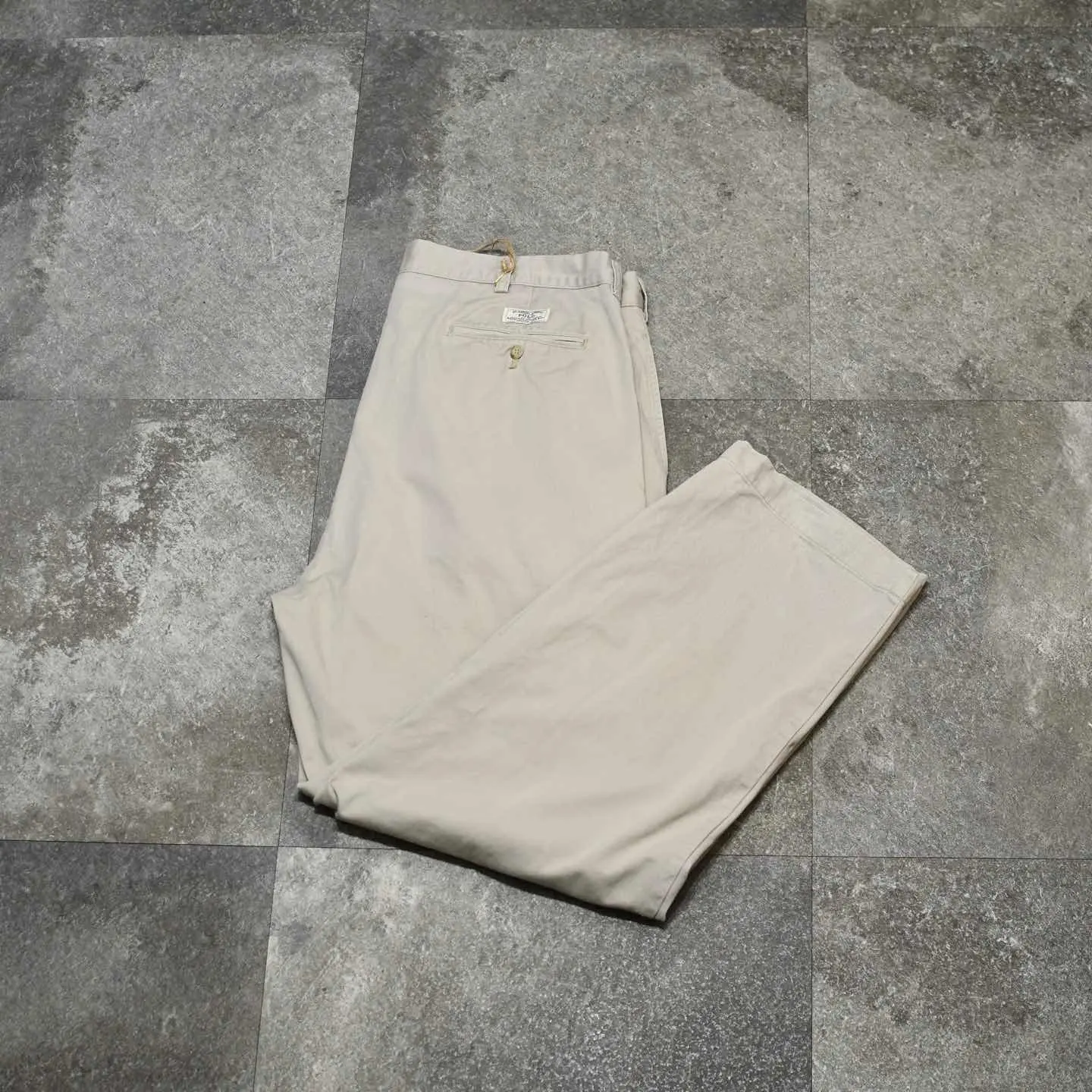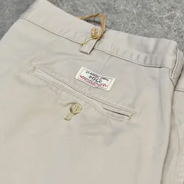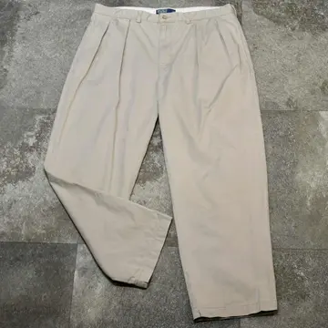 SIZE:38x30 ウエスト94cm 総丈105cm 股下74.5cm わたり41cm 裾幅24.5cm fabric/cotton 着用画像 177cm/64kg ポロチノに中でも個人的に好きなシリーズ ”Andrew Pant” ウエスト周りは2タック、程良い太さを残したまま 裾へと落ちるワイドなシルエット。 それでいて野暮ったくならないのは、 アウトタックではなくインタックだからかと 思いますし、5本以上チノを持つ自分が思う、 一番使い勝手の良い癖の無いチノパンとして おすすめです。 穿き心地の良い柔らかい生地でストレス無く、 足元に溜めてもロールアップでも、 好みでどうぞ。 ※右腿辺りに軽度の汚れあり。 ※裾上げ等のレングス直しにつきましては、 購入前に必ずご連絡お願い致します。 ※撮影状況により、実物と多少色が異なる 場合がございます。 ※古着を取り扱っているため、気づかない汚れや ほつれがある場合がございます。 予めご了承ください。 ※サイズは着用感で選んでおり、 表記サイズではございません。 表記サイズは説明欄の最初に記載しております。 old vintage ヴィンテージ used 80's 90's POLO RALPH LAUREN Eddie Bauer OLD GAP LANDS' END ランズエンド LLBean エルエルビーン オールドギャップ エディーバウアー ラルフローレン ブルックスブラザーズ Brooks Brothers などがお好きな方 #vintage #old #used #90s #80s #古着 #ヴィンテージ #LLBean #エルエルビーン #EddieBauer #エディーバウアー #oldgap #LANDSEND #ランズエンド #NAUTICA #ラルフローレン #POLORALPHLAUREN #ブルックスブラザーズ #BrooksBrothers #チノパン #ワイドパンツ