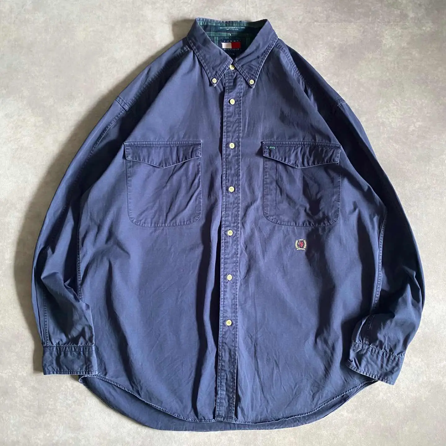 ○商品説明 90s TOMMYHILFIGER 可愛らしい一枚になります。 胸元ではなく少し下に刺繍があります。 気になった方は是非。 ○サイズ 表記 L 平置き ・肩幅51cm ・身幅63cm ・袖丈60cm ・着丈80cm ○商品の状態 B A:使用感がほとんどなく、汚れやシミもなし B:多少使用感はあるが、汚れやシミも少ない C:使用感があり、汚れやシミがある D:使用感があり、大きな汚れや破れあり ○色 ネイビーブルー #90s#tommyhilfiger #トミーヒルフィガー#シャツ
