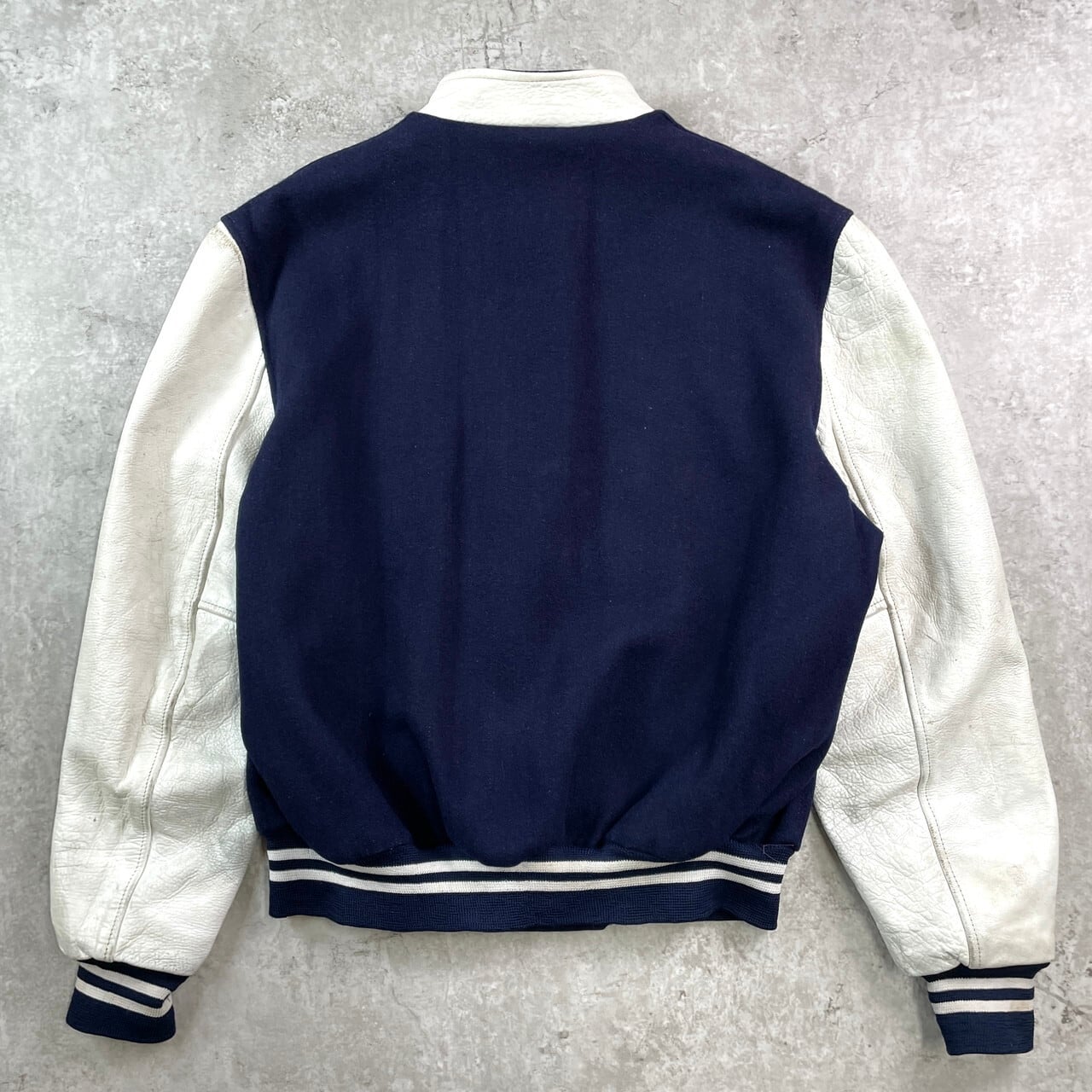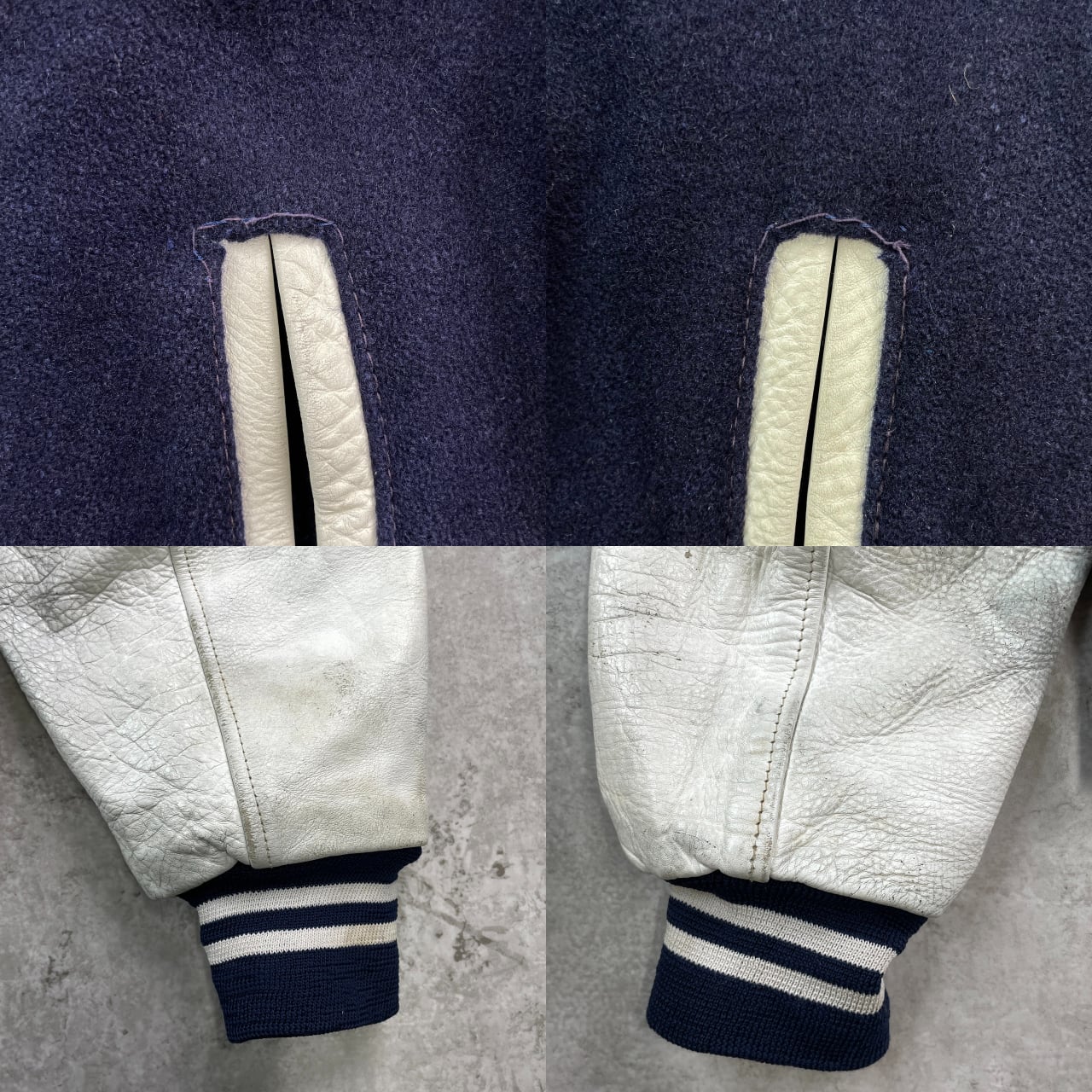 ■スタンドカラー 袖革 ウールスタジャン メンズL相当 古着 スタジアムジャケット アワードジャケット 立ち襟 ダークネイビー ホワイト 白【ブルゾン・ジャケット】/ネイビー 【サイズ】 表記 不明(着用感メンズL相当) モデル身長172cm ※計測値をご確認ください。 着丈…68 身幅…68 肩幅…53 袖丈…67 【生産国】不明 【素材】不明 【状態】袖や袖リブなどに汚れがございます。 画像にてご確認ください。 【c251115007】 ※古着は洗濯、検品などのケアを行っております。(新品・デッドストックは洗濯していません。) ※モニターの発色により実物と異なる場合がございます。予めご了承ください。 ※ 海外直輸入USED品になります。