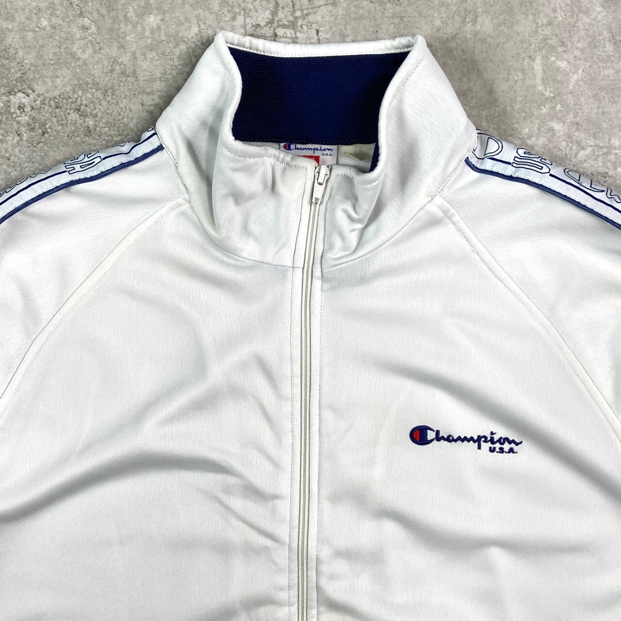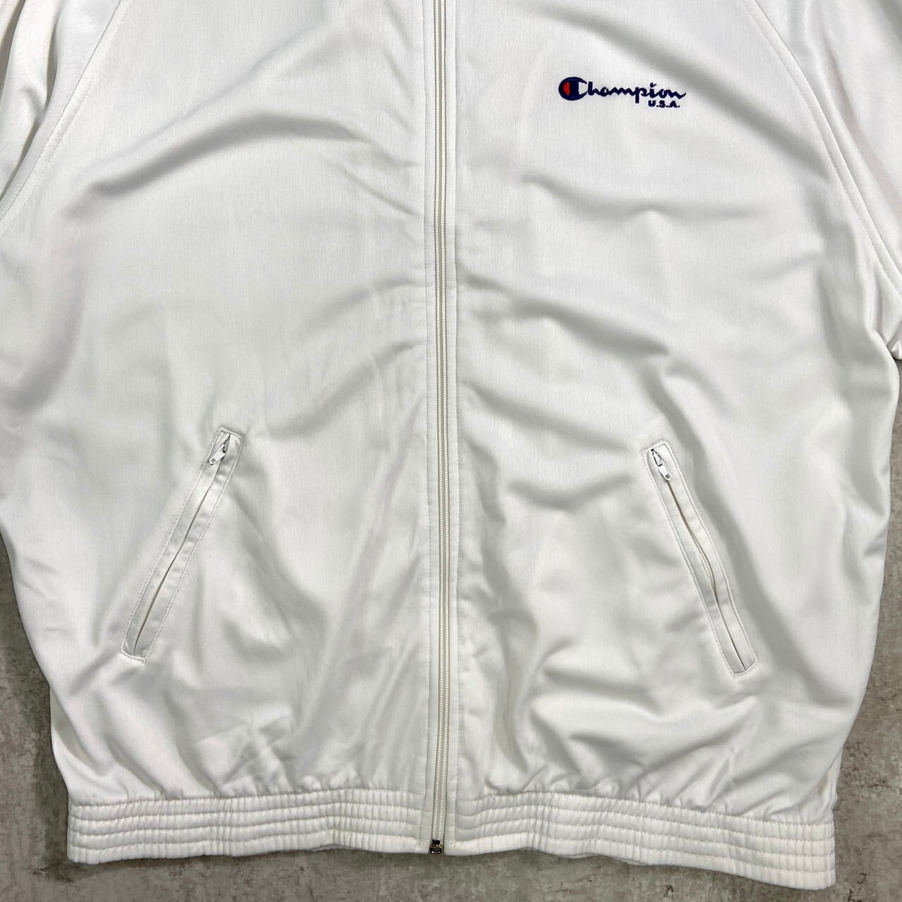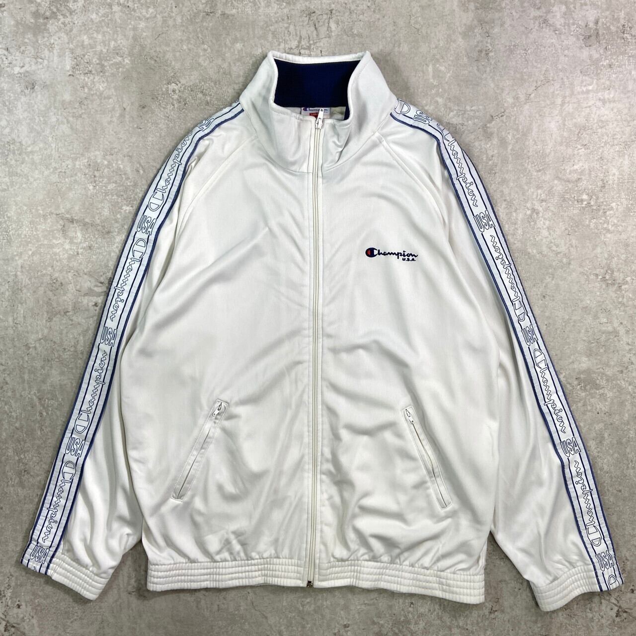 ■90年代 Champion USA チャンピオン ジャージ トラックジャケット メンズL 古着 90s VINTAGE ヴィンテージ USA企画 白【ジャージ・トラックジャケット】/ホワイト 【ブランド】Champion USA チャンピオン 【サイズ】表記 LARGE ※計測値をご確認ください。 着丈…72 身幅…65 裄丈…86 袖丈(脇下計測)…55 【生産国】不明 【素材】不明 おそらくポリエステルかと思われます。 【状態】多少の使用感は御座いますが、目立ったダメージや汚れは御座いません。 画像にてご確認ください。 【c251014014】 ※古着は洗濯、検品などのケアを行っております。(新品・デッドストックは洗濯していません。) ※モニターの発色により実物と異なる場合がございます。予めご了承ください。 ※ 海外直輸入USED品になります。