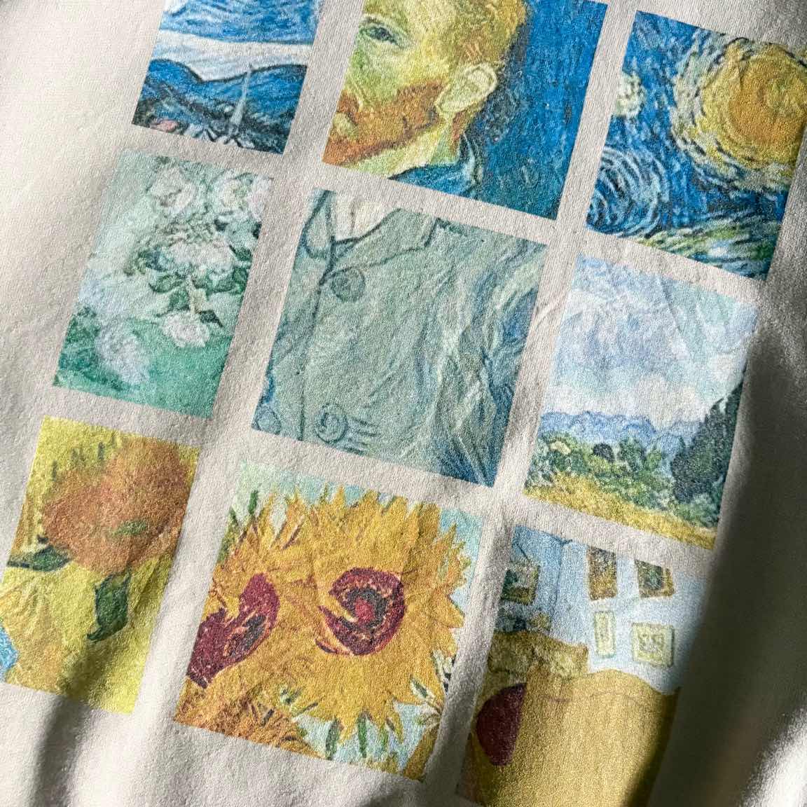 ○商品説明 GILDAN フィンセント・ファン・ゴッホの有名な絵画作品を 正方形のブロック状にデザインした一枚。 上段の中央部にはゴッホ自身の自画像。 上段左右にはゴッホの代表作の一つ星月夜。 中段の左側には花瓶に生けられた花。 下段の中央、左側にはゴッホの最も有名なひまわり。 フィンセント・ファン・ゴッホの傑作の数々を 贅沢にコラージュしたセンス抜群のアイテム。 ビビッときた方は是非。 ○サイズ 表記M(L相当) 平置き ・肩幅56cm ・身幅57cm ・袖丈57cm ・着丈61cm ○商品の状態B A:使用感がほとんどなく、汚れやシミもなし B:多少使用感はあるが、汚れやシミも少ない C:使用感があり、汚れやシミがある D:使用感があり、大きな汚れや破れあり ○色 ベージュ #GILDAN#ギルダン#ゴッホ#ひまわり#スウェットトレーナー