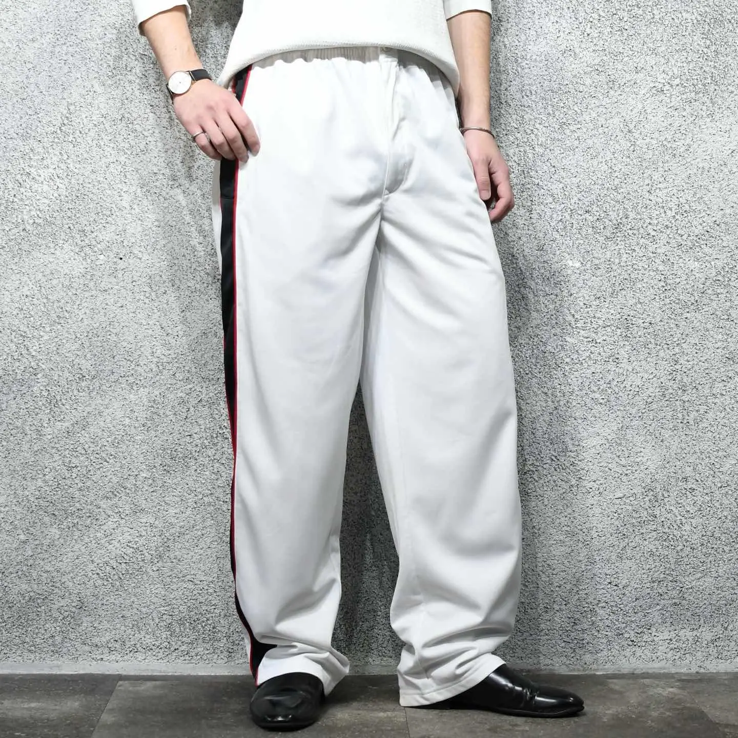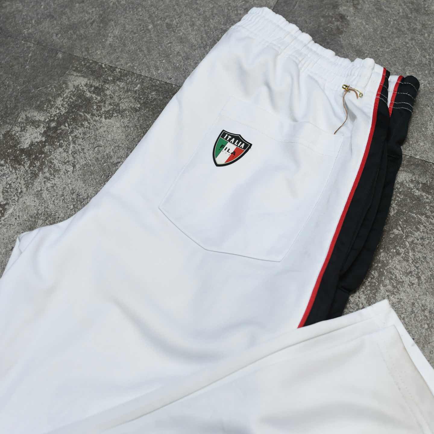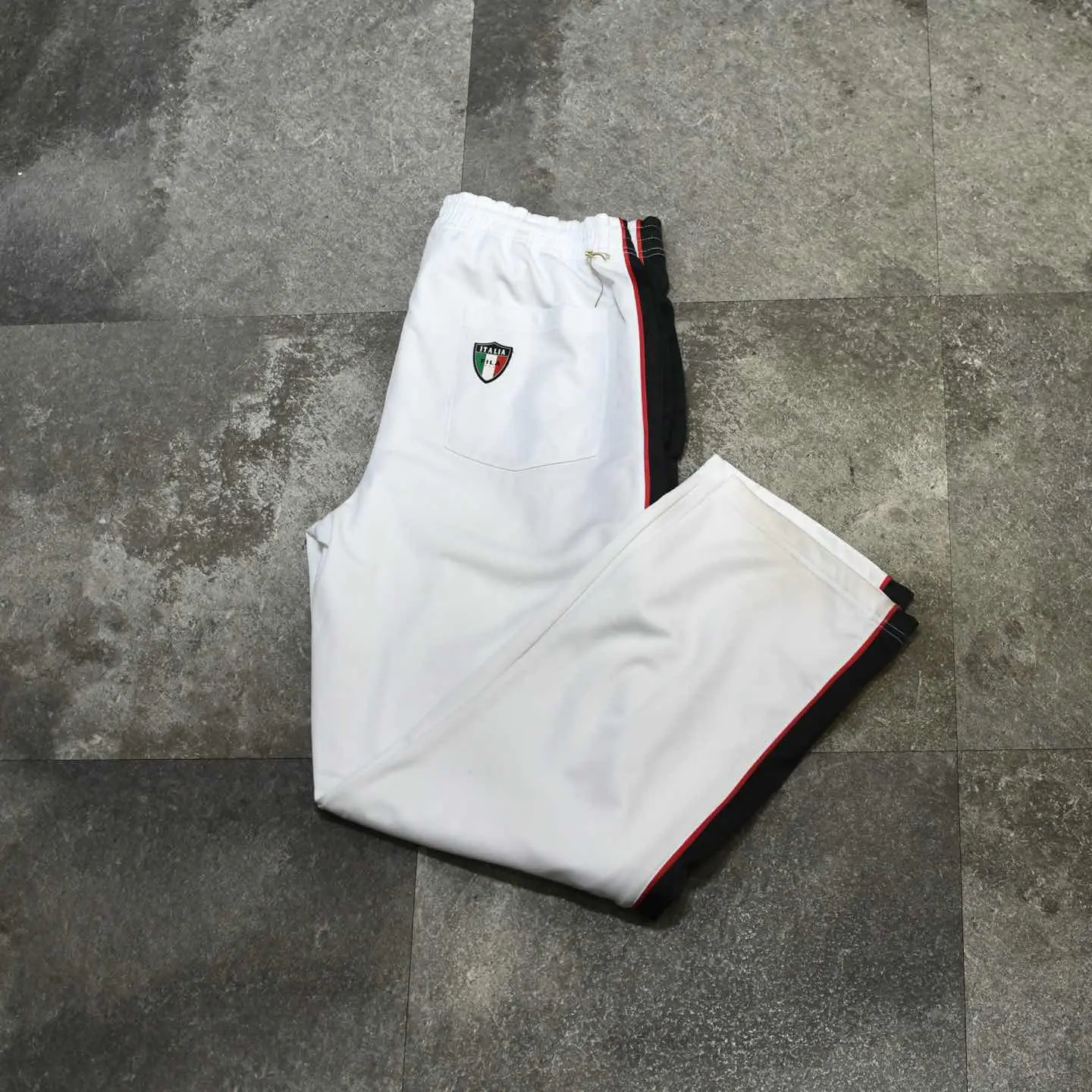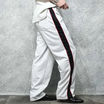 SIZE:- ウエスト~112cm(ドローコード付き) 総丈107cm 股下78cm わたり37cm 裾幅24cm fabric/質感よりpoly 着用画像 177cm/64kg イタリアのスポーツウェアブランドが手掛けた、 イタリアらしい色使いなトラックパンツ。 トラックパンツで白、パンツで白となると、 どこか汚れそうで心配になりますが、 前の持ち主が裾を引きずってくれたおかげで、 振り切って雑にも穿ける白トラック。 太めのシルエットで、フロントにはスラックスなど 他のパンツ同様の前立てがあり、トラックパンツでは 比較的珍しい作りなのも惹かれました。 裏地はフリース生地で、寒い季節に活躍する トラックパンツとして、コートや レザージャケットなどと合わせて外したいなと。 ※裾上げ等のレングス直しにつきましては、 購入前に、必ずご連絡お願い致します。 ※撮影状況により、実物と多少色が異なる 場合がございます。 ※古着を取り扱っているため、気づかない汚れや ほつれがある場合がございます。 予めご了承ください。 ※サイズは着用感で選んでおり、 表記サイズは説明欄の最初に記載しております。 old vintage ヴィンテージ used 80's 90's POLO RALPH LAUREN Eddie Bauer OLD GAP LANDS' END ランズエンド LLBean エルエルビーン オールドギャップ エディーバウアー ラルフローレン ブルックスブラザーズ Brooks Brothers 白 ホワイト などがお好きな方 #vintage #old #used #90s #80s #古着 #ヴィンテージ #LLBean #EddieBauer #oldgap #LANDSEND #NAUTICA #ラルフローレン #POLORALPHLAUREN ##BrooksBrothers #トラックパンツ #ワイドパンツ #イージーパンツ 12000