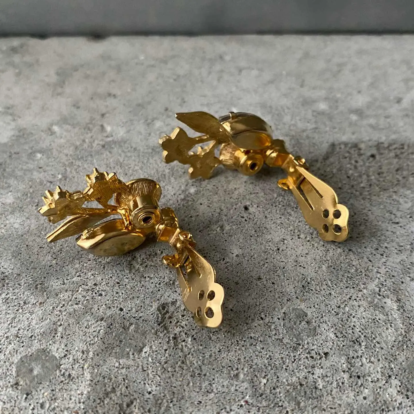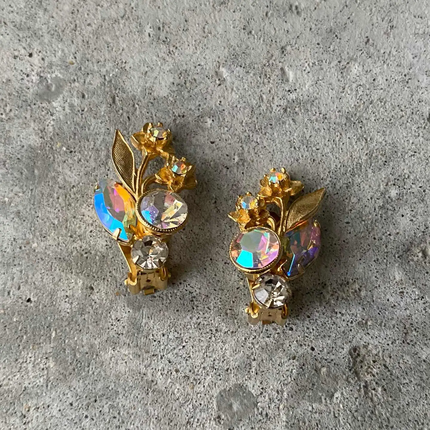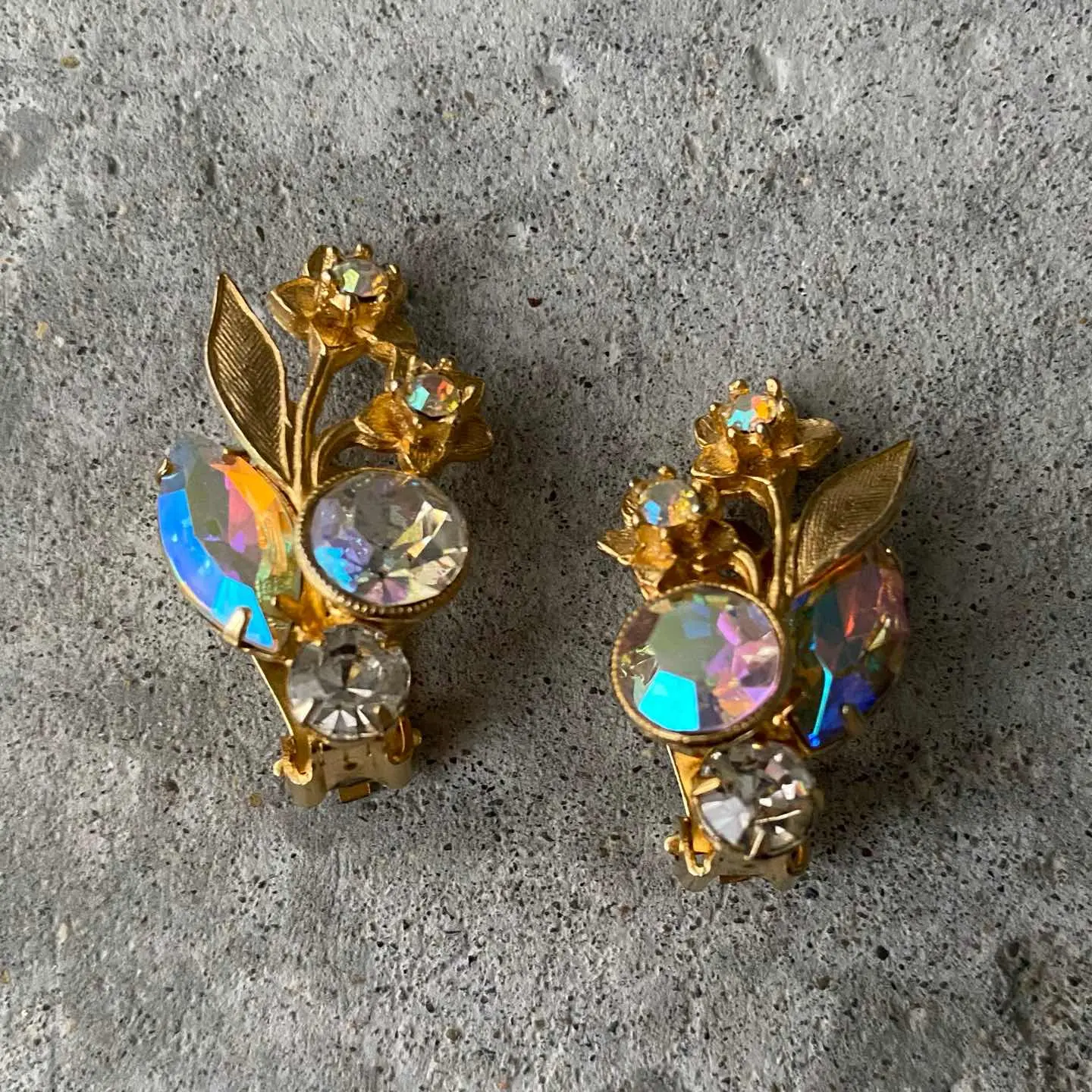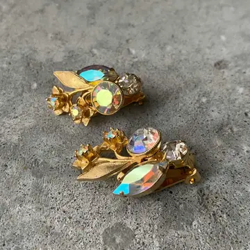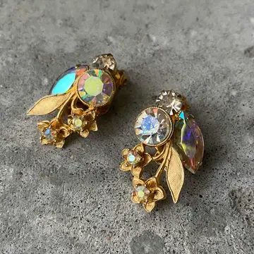 クラシカルな雰囲気のUSAヴィンテージイヤリング。フラワーモチーフのメタルにオーロラ色のビジューがキラキラと輝きます。ヴィンテージならではの上品なデザインで、お顔まわりを華やかな雰囲気にしてくれます。 □Materials メタル(ゴールドメッキ)、ガラスストーン □Size 約H3.2×W1.9㎝ 11g □Condition【C】 石座裏側にメッキ変色、ストーンのテーブル部分のオーロラ箔が剥がれ、マダラ模様のようになっています。古びた雰囲気がお好きな方におすすめです。中古品であることをご理解のうえお買い求めください。ご購入前に必ずショッピングガイドのご確認をお願いいたします。 【S】未使用 【A】未使用に近い 【B】やや使用感あり 【C】使用感あり Item No.3536
