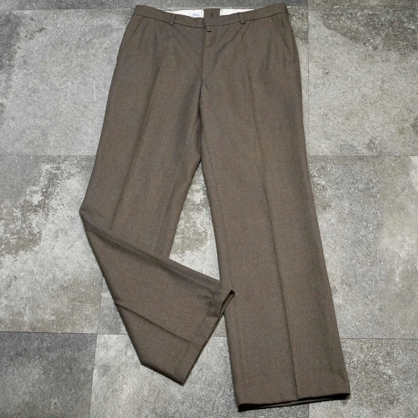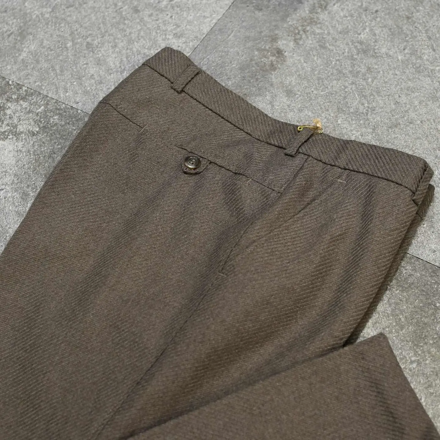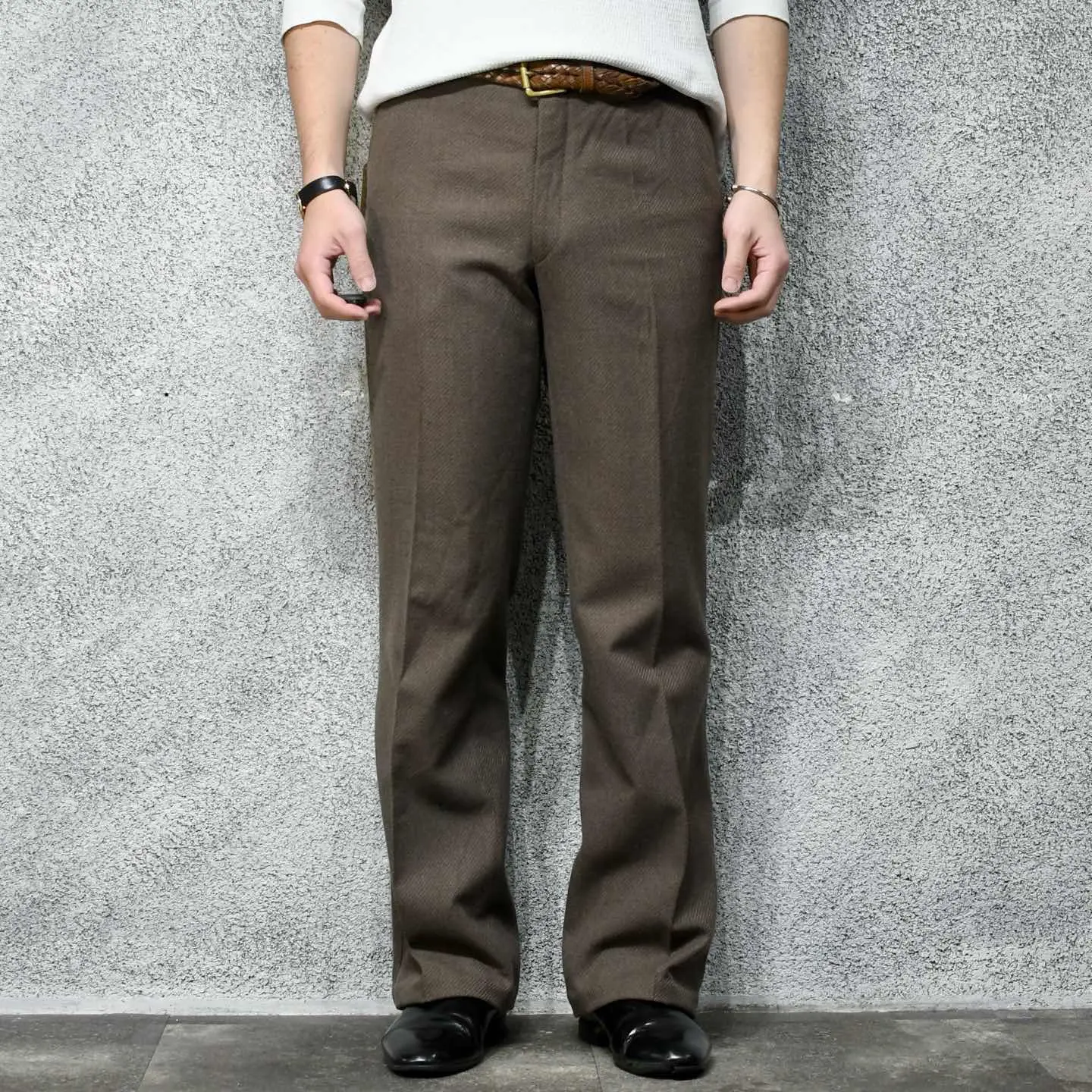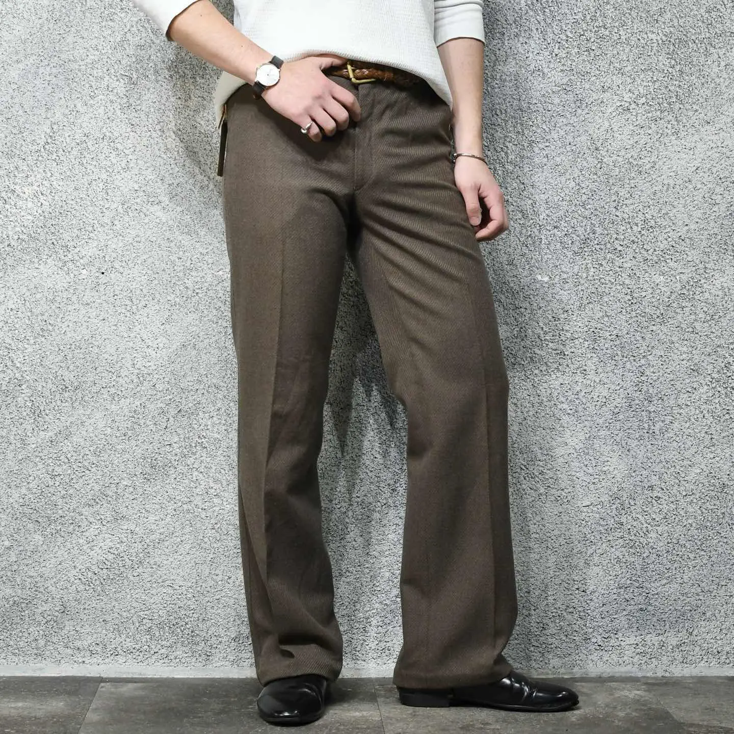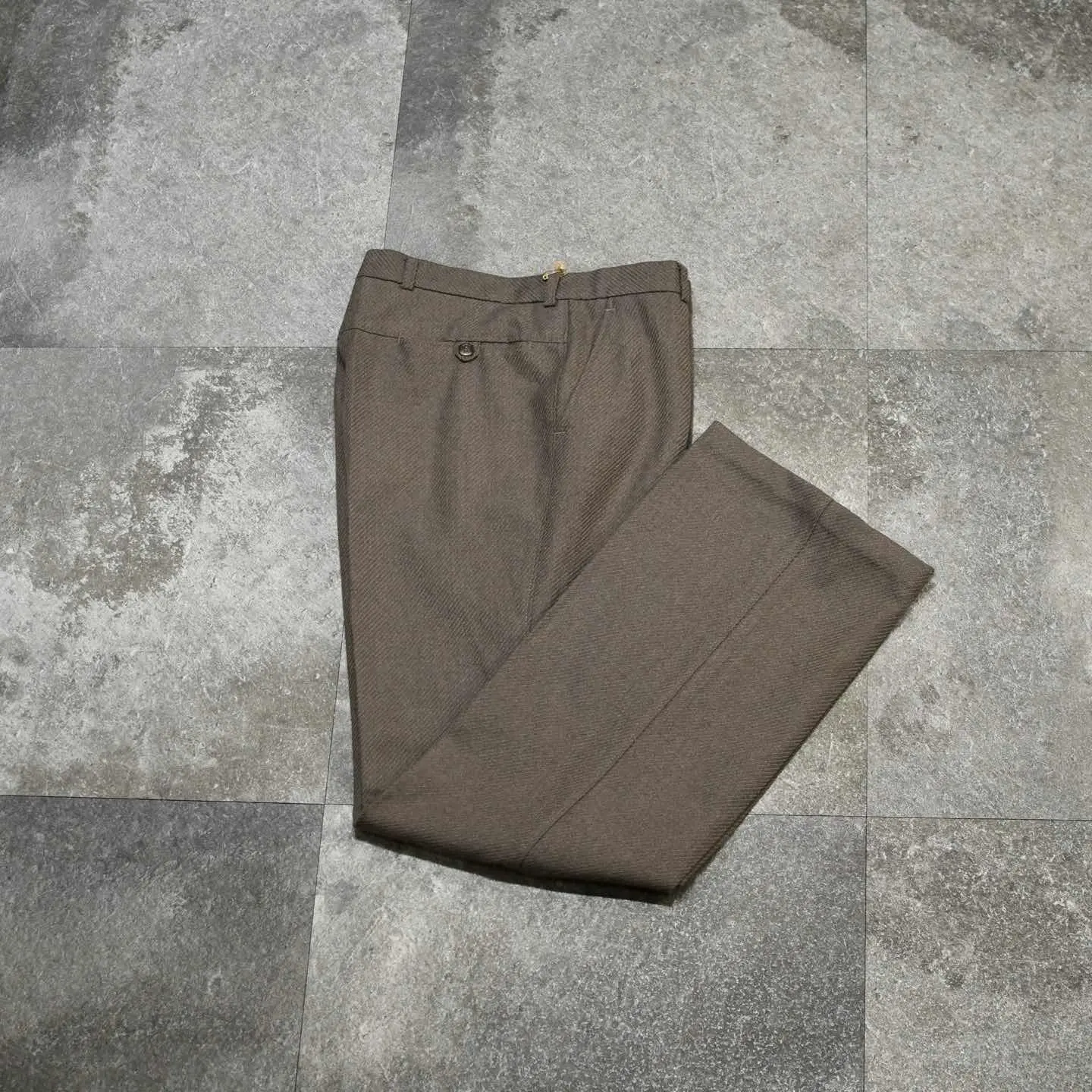 SIZE:- ウエスト79cm 総丈105cm 股下80cm わたり32cm 裾幅25.5cm fabric/poly・wool 着用画像 177cm/64kg 1926年、元はスラックスを手掛けるブランドとして創業を始めた、アメリカのブランド”Haggar” そんなアメリカのブランドが、 ヨーロッパの市場向けに作ったライン ”Inter Modelli” 当ブランドの上位ライン”black label”と 同じような立ち位置ではないでしょうか。 ドイツの化学メーカーが手掛けるTreviraという 上質な合成繊維まで使用され、ジップはoptiと 質に拘りを感じる一本。 物足りなさを感じない裾広がりの塩梅と、 そこから生まれるキレイなシルエット。 フレアパンツが手元に無い方も、1本目として こんな贅沢な個体を選んでみてはどうでしょう。 ※撮影状況により、実物と多少色が異なる 場合がございます。 ※古着を取り扱っているため、気づかない汚れや ほつれがある場合がございます。 予めご了承ください。 ※サイズは着用感で選んでおり、 表記サイズは説明欄の最初に記載しております。 old vintage ヴィンテージ used 80's 90's アメリカ古着 ユーロ古着 POLO RALPH LAUREN Eddie Bauer OLD GAP LANDS' END ランズエンド LLBean エルエルビーン オールドギャップ エディーバウアー ラルフローレン ブルックスブラザーズ Brooks Brothers ブラウン ワイドパンツ フレアスラックス ブーツカット などがお好きな方 #vintage #old #used #90s #80s #古着 #ヴィンテー #EddieBauer #oldgap #ラルフローレン #POLORALPHLAUREN #ブルックスブラザーズ #BrooksBrothers #フレアパンツ #スラックス #ブーツカット