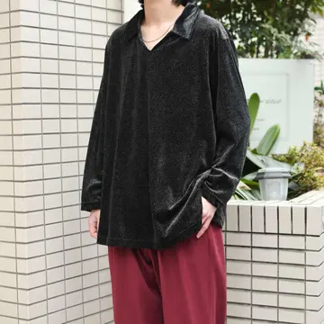 古着 ベロア スキッパー プルオーバー 総柄 柄 ブラック 黒 ポロシャツ