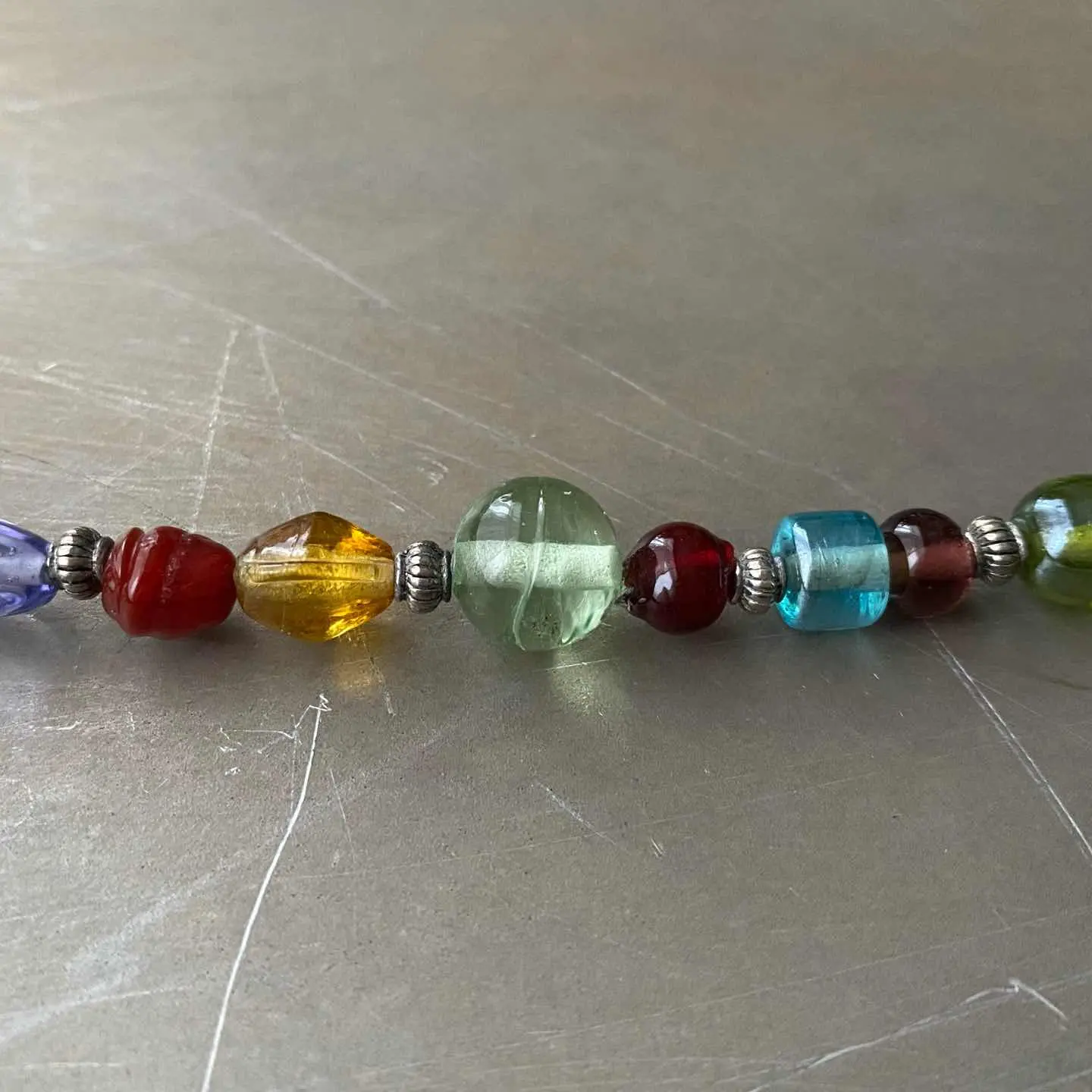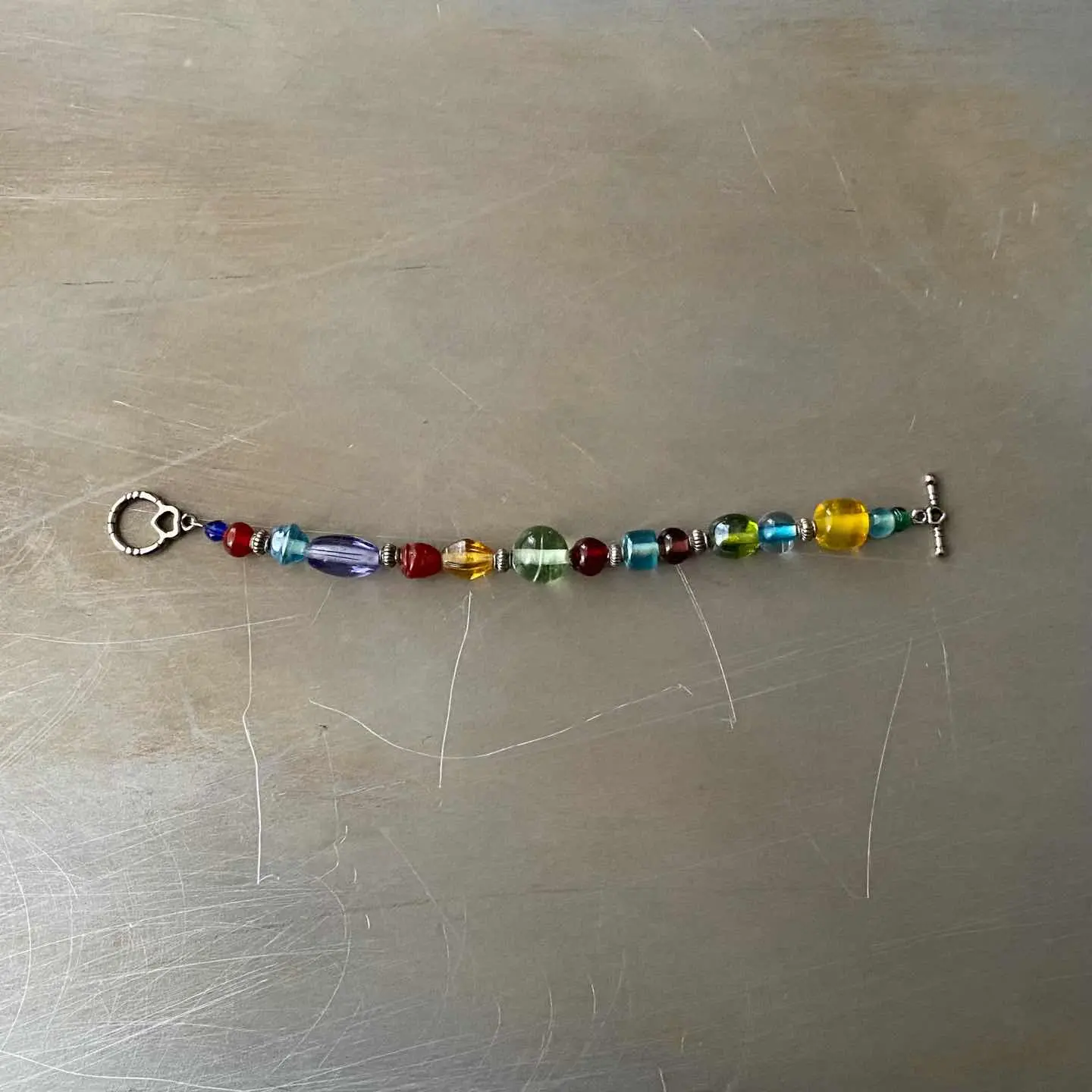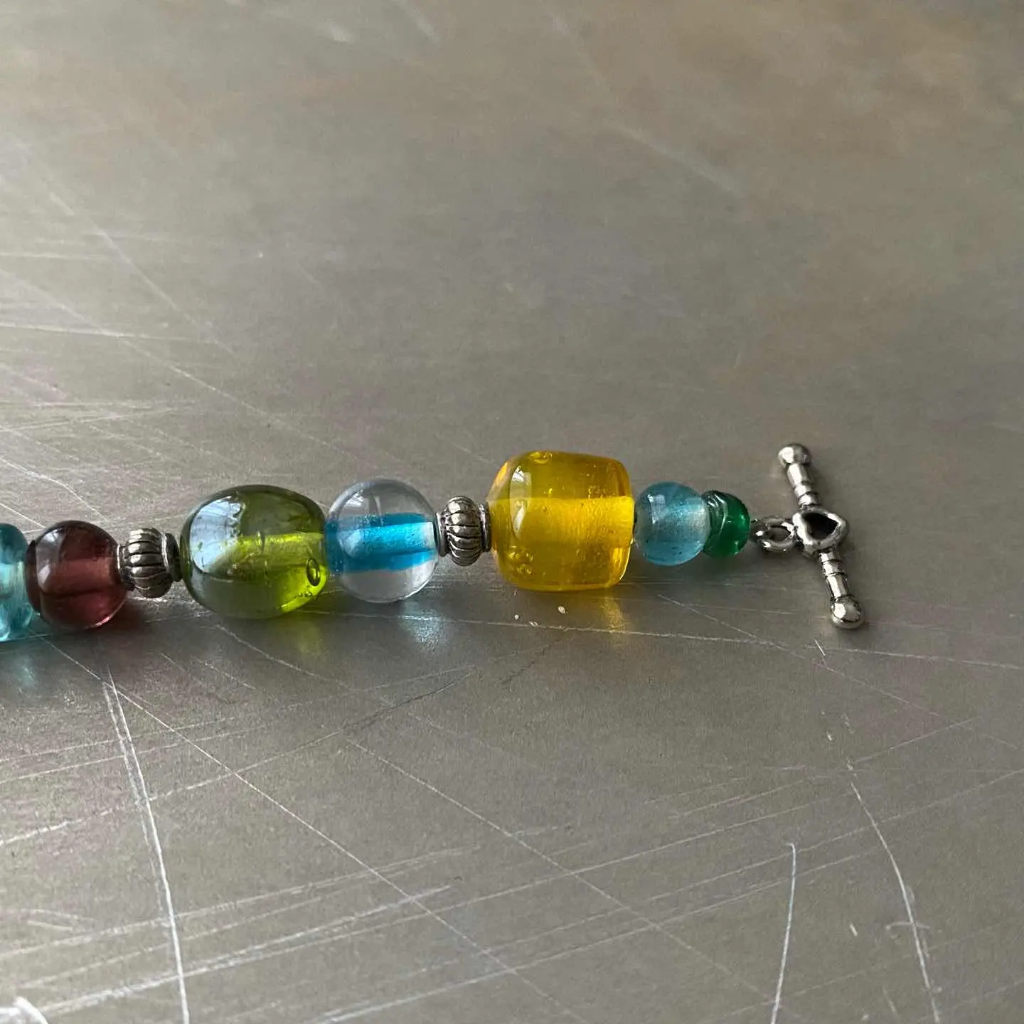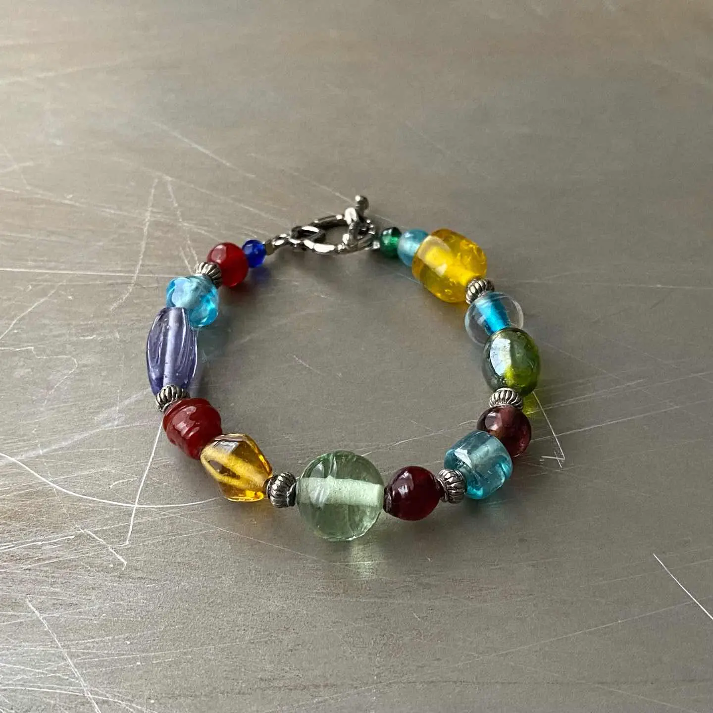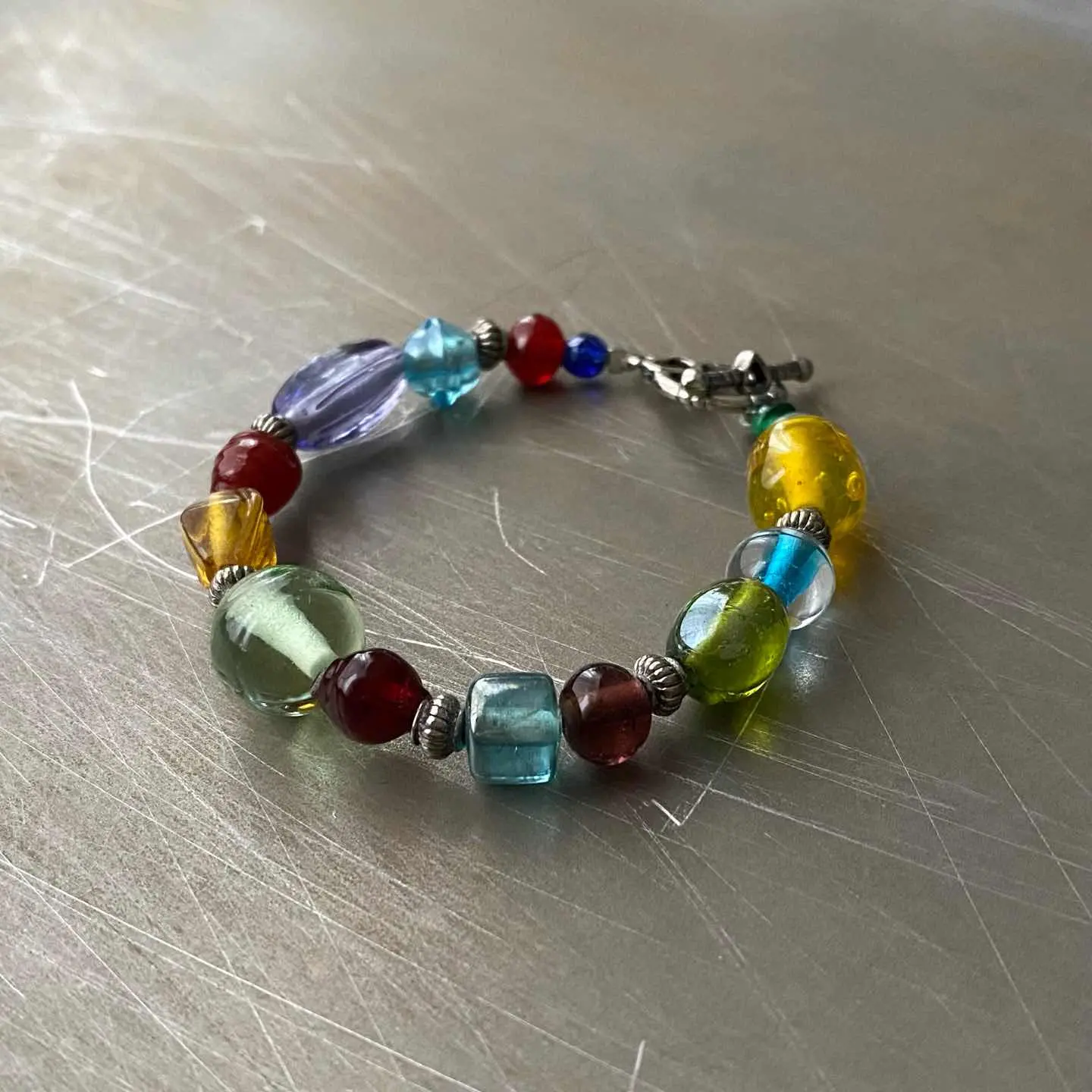 まるでキャンディーのようなガラスビーズのUSAヴィンテージブレスレット。カラフルな色合いとハンドメイドならではの温もりのあるビーズが魅力的です。 □Materials メタル(シルバーメッキ)、ガラスビーズ (※ワイヤー交換済) □Size 全長 約17.7㎝ 幅 約1.2㎝ 18g □Condition【A】 使用感の少ない良好な状態です。(ガラスの内側には気泡がみられます)中古品であることをご理解のうえお買い求めください。ご購入前に必ずショッピングガイドのご確認をお願いいたします。 【S】未使用 【A】未使用に近い 【B】やや使用感あり 【C】使用感あり Item No.3546