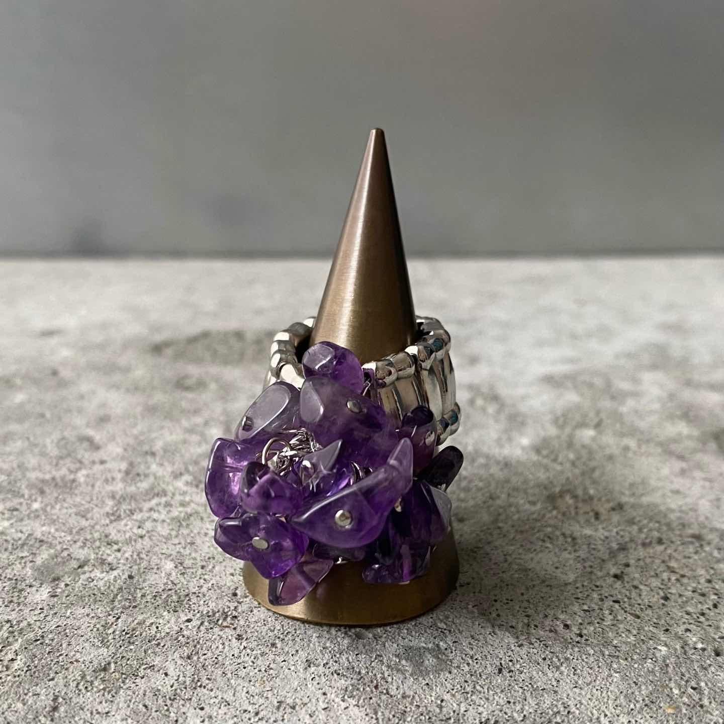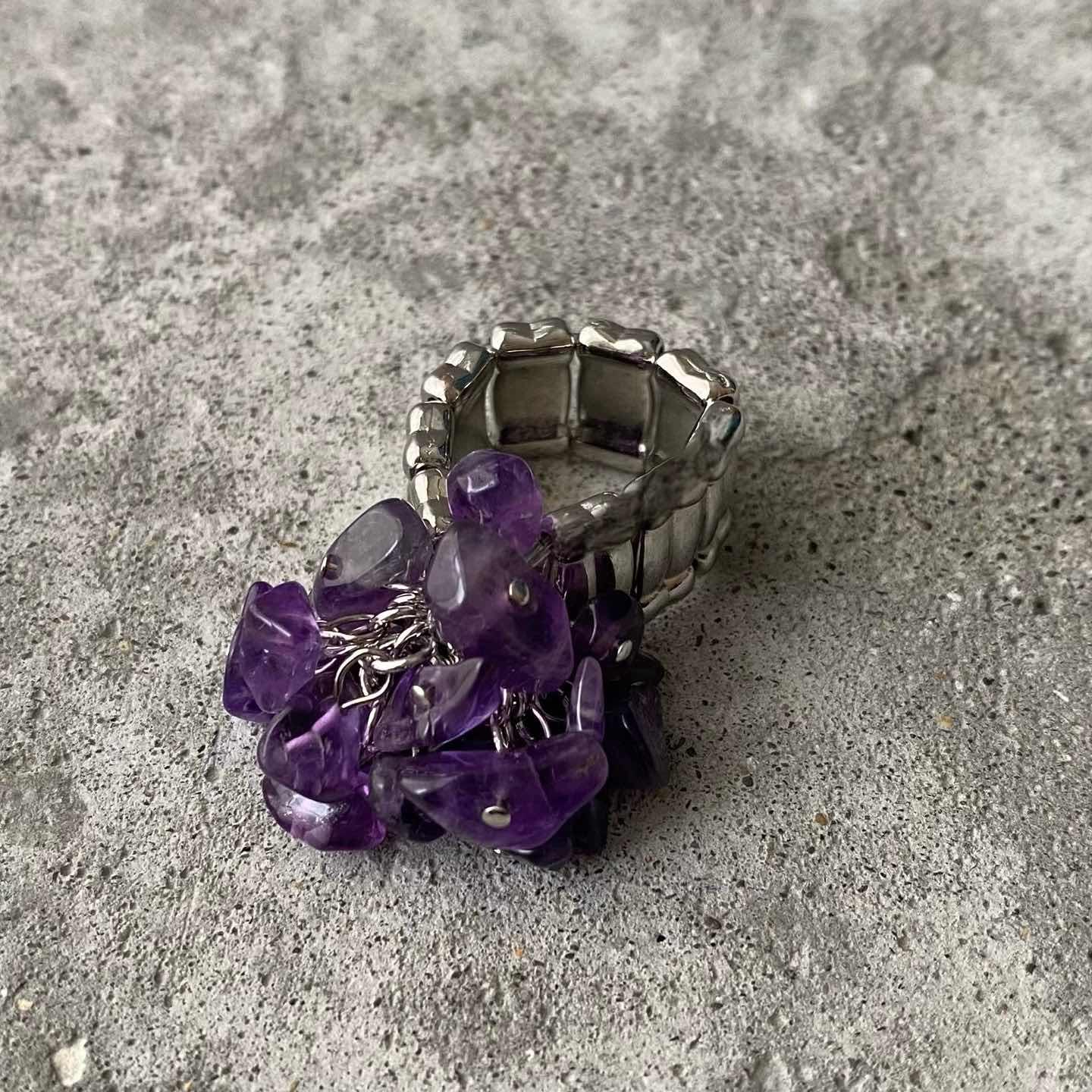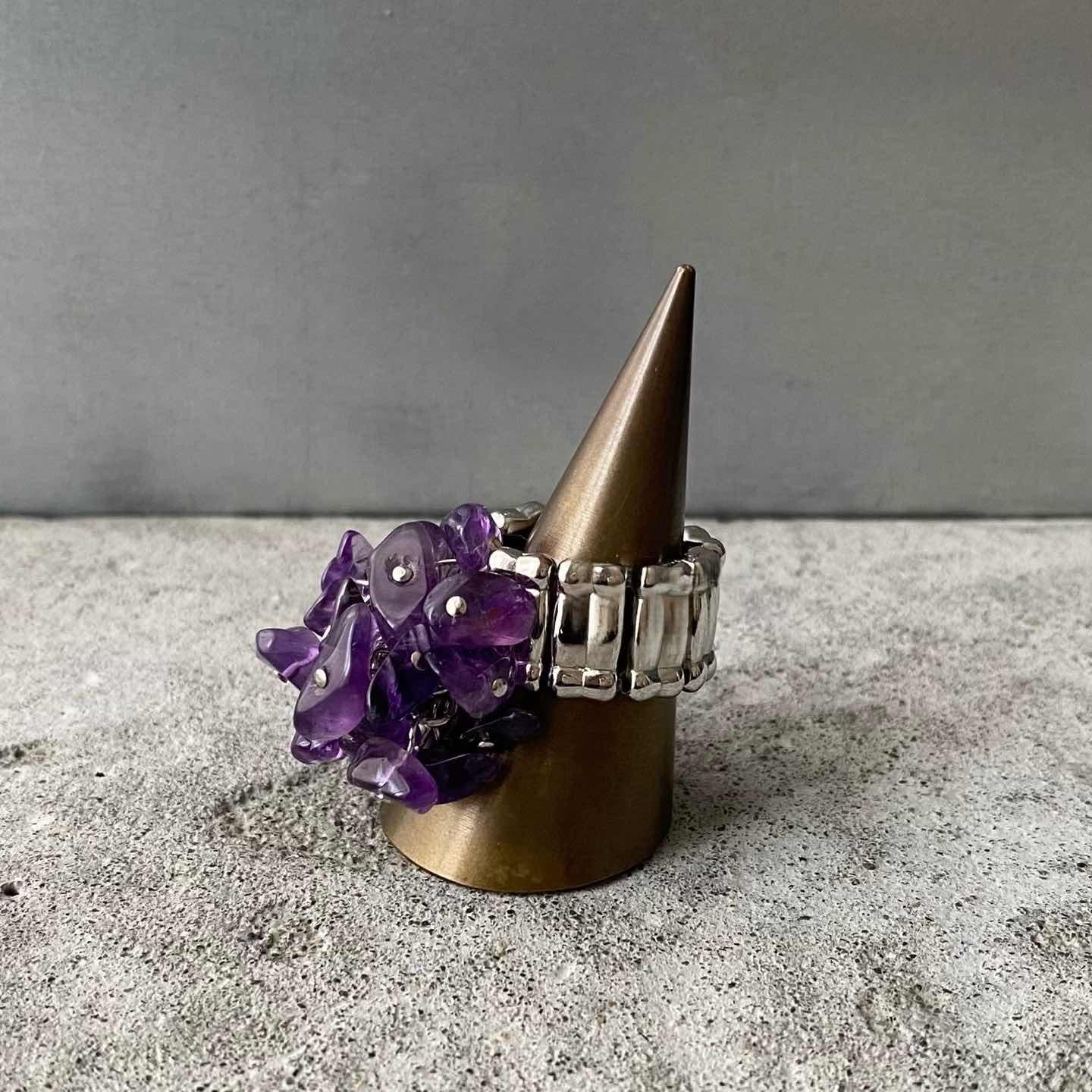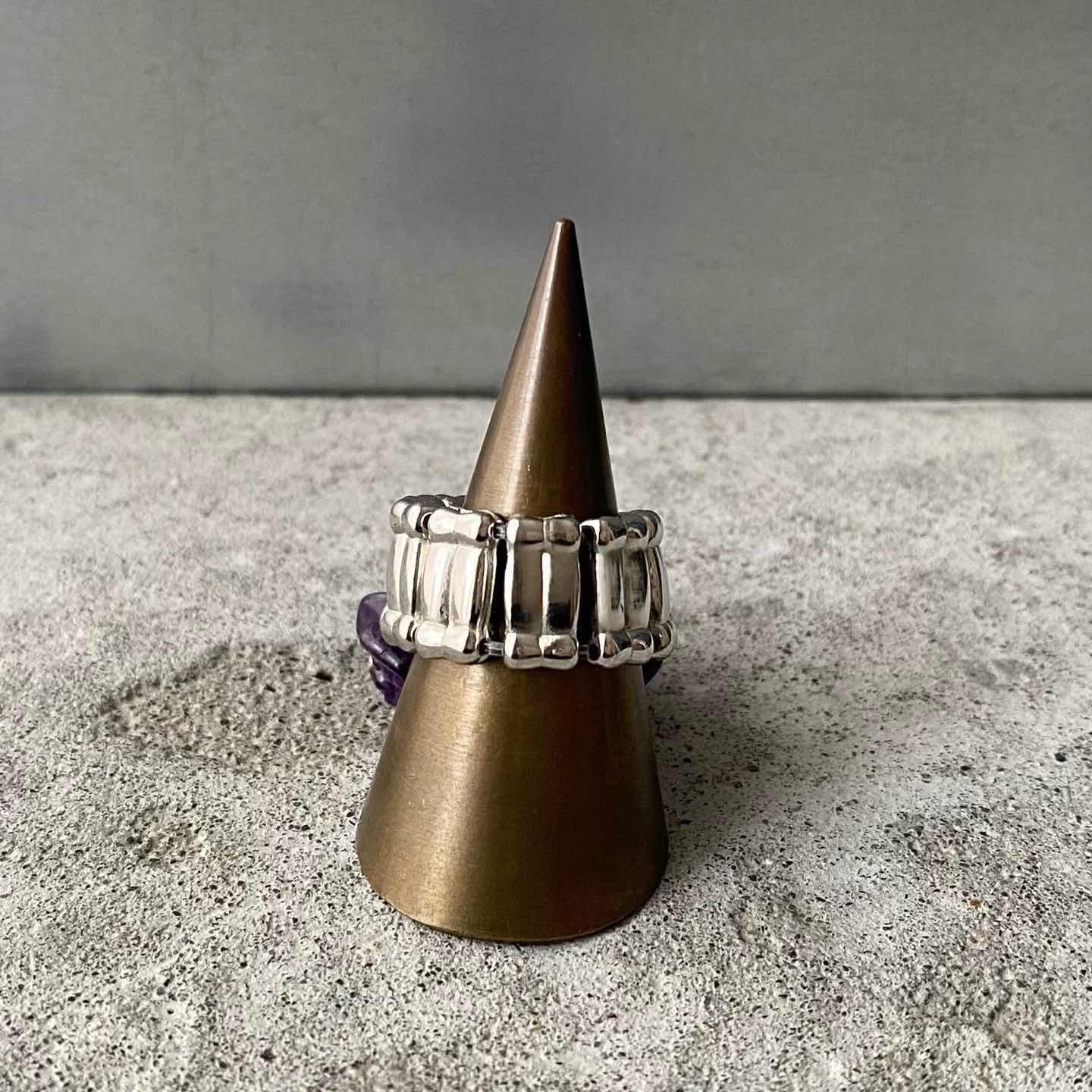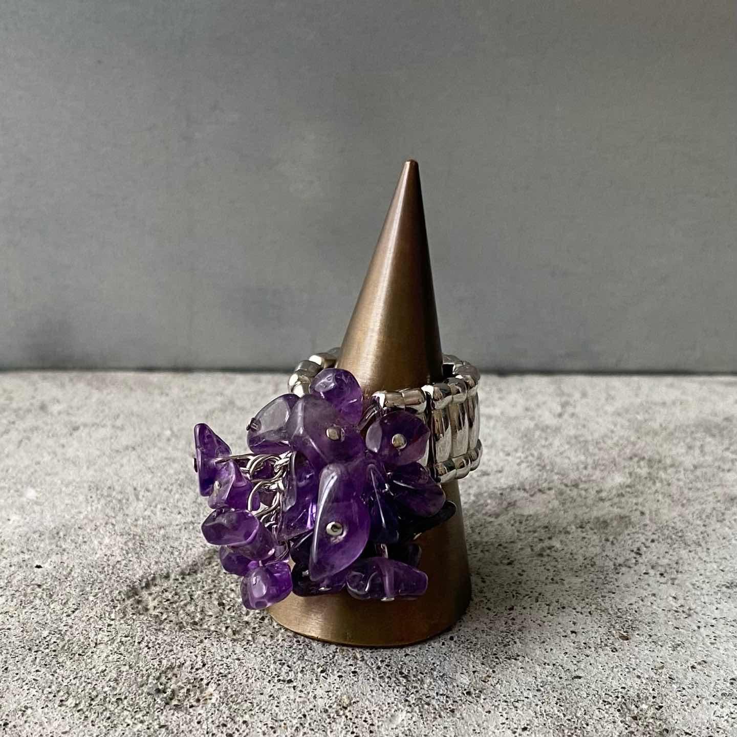 ラフカットのアメジストがジャラジャラと揺れ動くUSAヴィンテージリング。ほどよいボリューム感でコーディネートの差し色におすすめです。 □Materials 天然石(アメジスト)メタル(シルバーメッキ)、ゴム □Size 11号(※リング部分は伸縮性のあるストレッチタイプです) 幅 約1.1〜2.5㎝ 7g □Condition【A】 使用感の少ない良好な状態です。中古品であることをご理解のうえお買い求めください。ご購入前に必ずショッピングガイドのご確認をお願いいたします。 【S】未使用 【A】未使用に近い 【B】やや使用感あり 【C】使用感あり Item No.3551