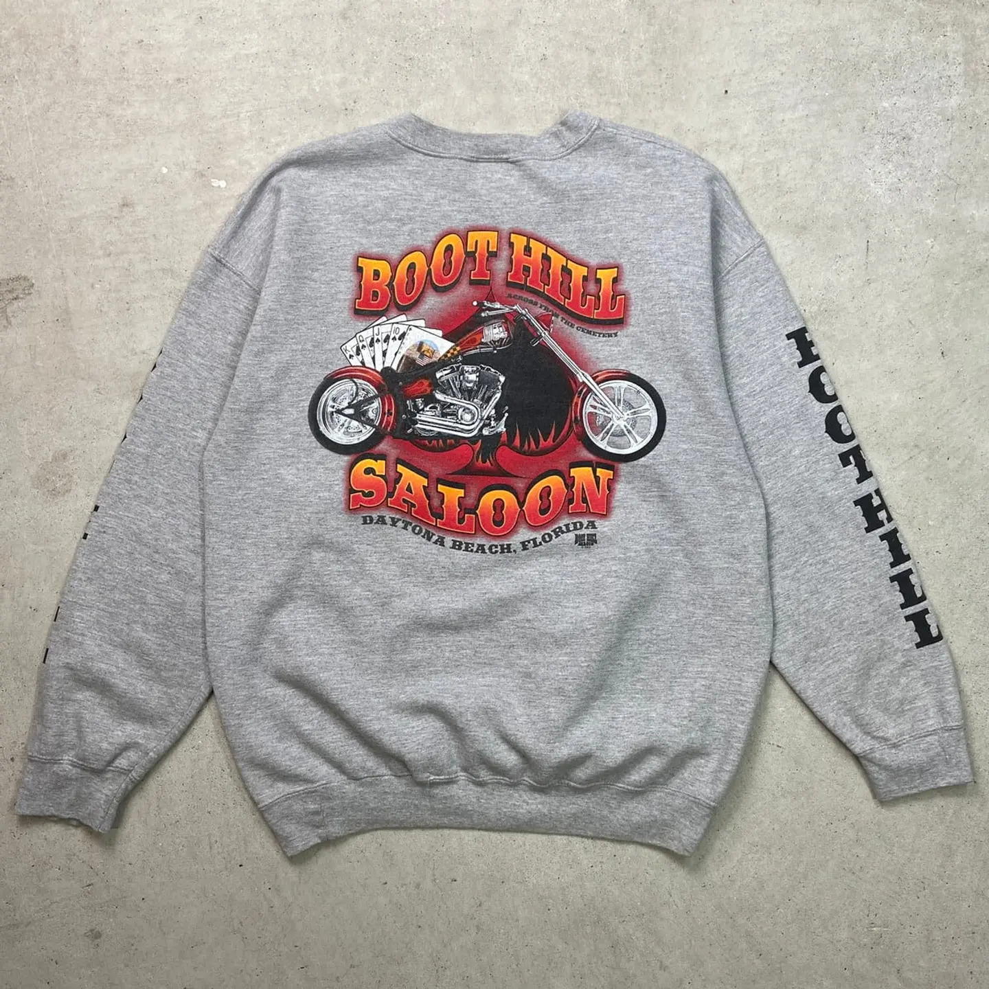 ■古着 BOOT HILL SALOON プリントスウェットシャツ メンズL 00年代 00s Y2K VINTAGE ヴィンテージ USED トレーナー バックプリント 袖プリント バイク モーターサイクル DAYTONA BEACH デイトナビーチ 灰色【スウェット】/グレー 【ブランド】GILDAN 【サイズ】表記 L ※計測値をご確認ください。 着丈…70 身幅…61 肩幅…62.5 袖丈…58 【生産国】メキシコ製 【素材】コットン50% ポリエステル50% 【状態】フロント中心付近に目立たない程度の薄汚れがございます。 画像にてご確認ください。 【c251211107】 ※古着は洗濯、検品などのケアを行っております。(新品・デッドストックは洗濯していません。) ※モニターの発色により実物と異なる場合がございます。予めご了承ください。 ※ 海外直輸入USED品になります。