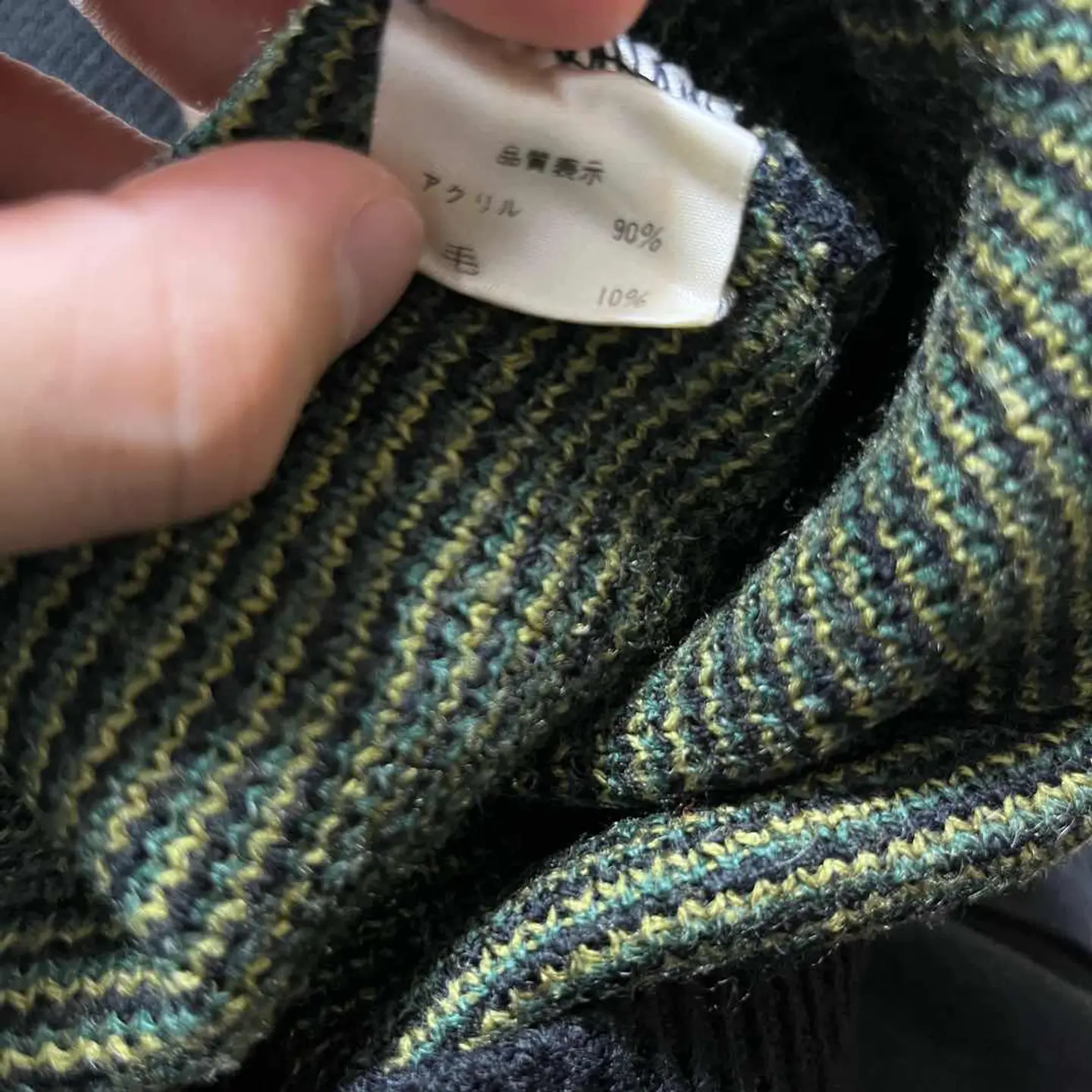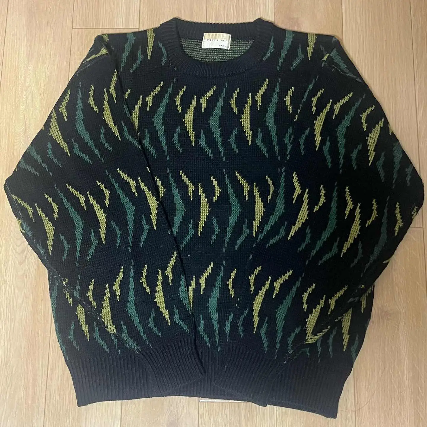希少】vintage 総柄 デザインニット セーター 80s〜90s頃のヴィンテージ・デザインニットです。 目を引く幾何学的な総柄(アニマル・タイガー風)が今のトレンドにぴったりな一着。 安心の日本製で、アクリル・ウール混の柔らかな肌触りです。 肩幅の広いドロップショルダー仕様なので、着用した際に綺麗なボックスシルエットになります。 男性はもちろん、女性が**オーバーサイズ(ゆるだぼ)**に着用しても非常に可愛いです! ●サイズ:表記 F(メンズM相当) ※素人採寸ですので、多少の誤差はご了承下さい。 ・肩幅:約52cm ・身幅:約54cm ・着丈:約60cm ・袖丈:約52cm ●カラー ブラック × グリーン × イエロー(幾何学柄) ●素材 アクリル 90% 毛(ウール) 10% ●状態 目立った傷や汚れはなく、年代物としては綺麗な状態です。 ※古着・ヴィンテージ品であることをご理解の上、ご購入をお願いいたします。 #ヴィンテージ #古着男子 #古着女子 #90s #80s #レトロ #総柄ニット #デザインニット #日本製 #オーバーサイズ #ゆるだぼ #ユニセックス