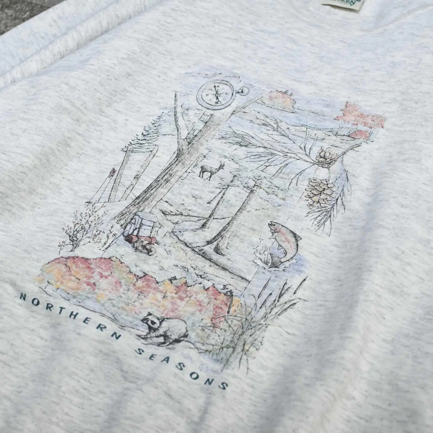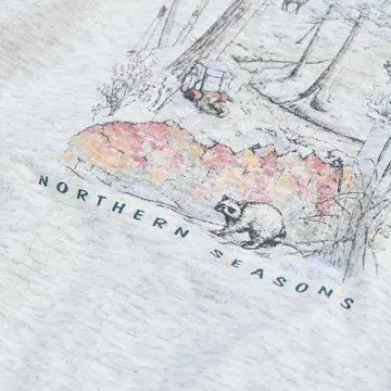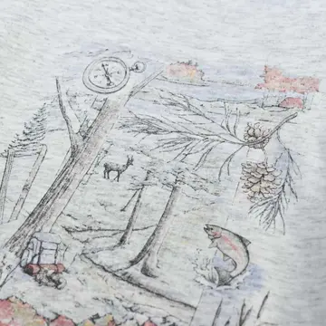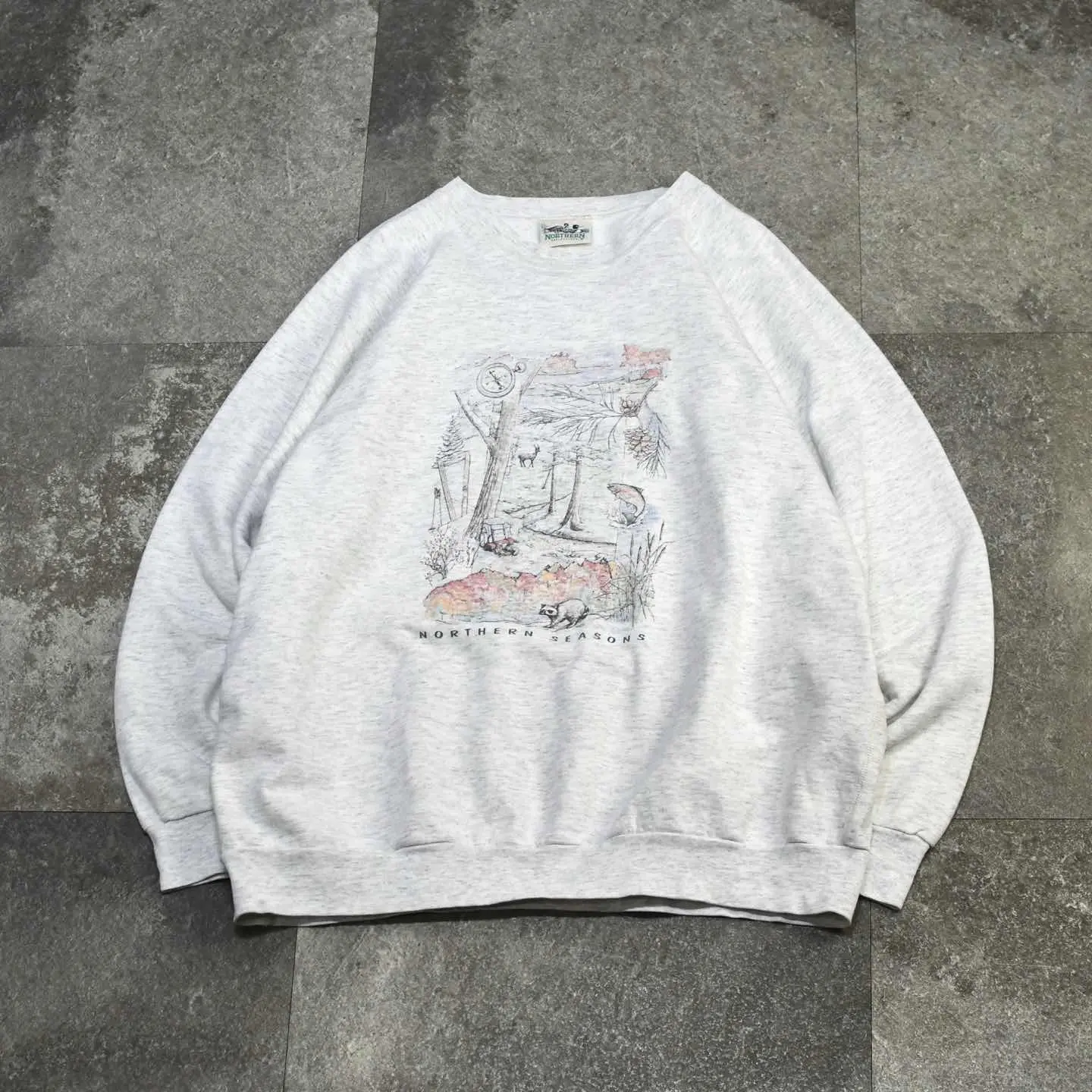 SIZE:- 着丈70cm 身幅70cm 裄丈93cm fabric/質感よりcotton・poly 着用画像 177cm/64kg ぱきっとしたプリントではなく、 馴染む掠れたプリント。 鳥や鹿、魚、草木など自然豊かな北半球の季節を 色を用いて描いているのが◎ 小物やパンツ、インナーのシャツで、色を拾ったり、 楽に1枚で着たり、カジュアルでありながら 程良く洒落たスウェットとして コーデに落とし込んでみてはどうでしょう。 ※撮影状況により、実物と多少色が異なる場合が ございます。 ※古着を取り扱っているため、気づかない汚れや ほつれ等がある場合がございます。 ※サイズは着用感で選んでおり、 表記サイズは説明欄の最初に記載しております。 古着 オーバーサイズ old vintage ヴィンテージ used 80's 90's アメリカ古着 ユーロ古着 POLO RALPH LAUREN Eddie Bauer OLD GAP LANDS' END ランズエンド LLBean エルエルビーン オールドギャップ エディーバウアー ラルフローレン ブルックスブラザーズ Brooks Brothers グレー 灰色 プリントスウェット などがお好きな方 #vintage #オーバーサイズ #old #used #90s #80s #古着 #ヴィンテージ #アメリカ古着 #ユーロ古着 #LLBean #エルエルビーン #EddieBauer #エディーバウアー #oldgap #オールドギャップ #LANDSEND #ランズエンド #NAUTICA #ノーティカ #ラルフローレン #POLORALPHLAUREN #ブルックスブラザーズ #BrooksBrothers #スウェット #トレーナー #アニマルスウェット #プリントスウェット