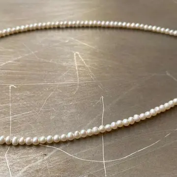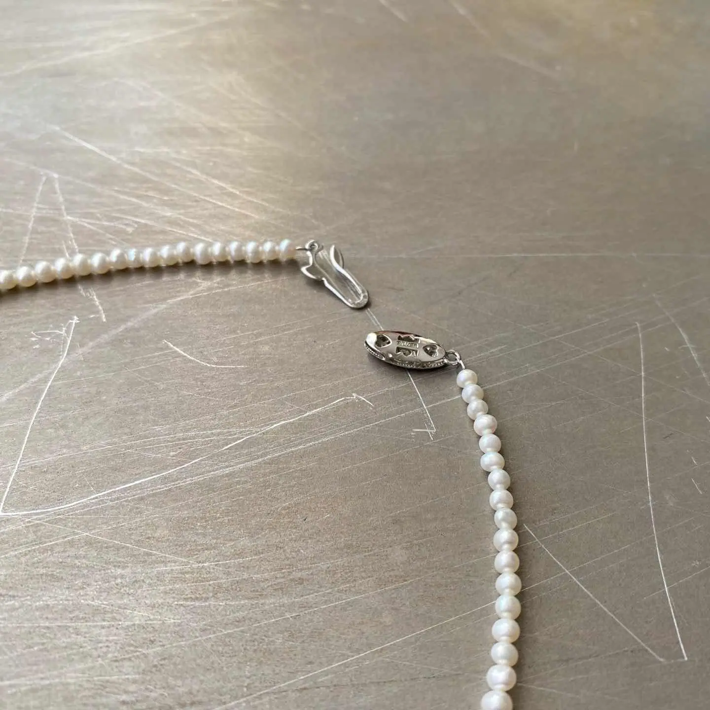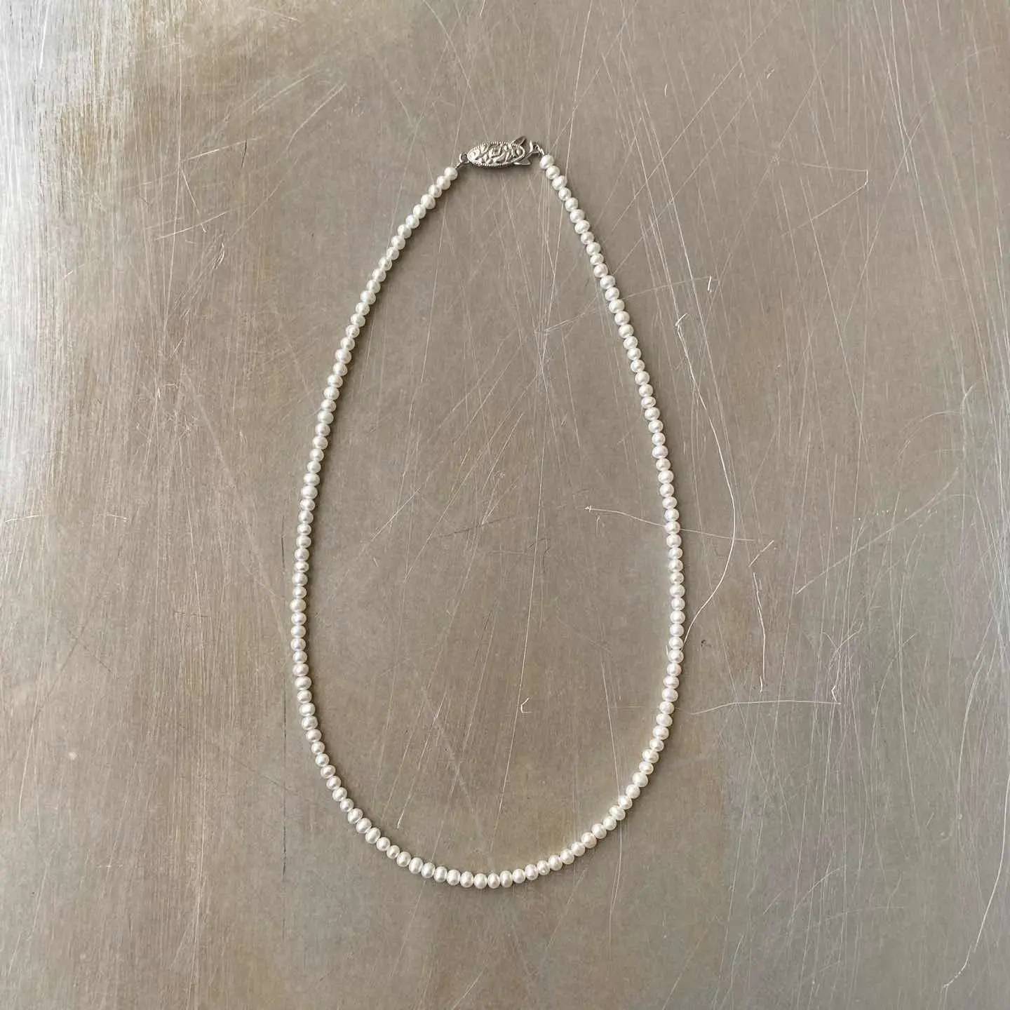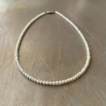 繊細な淡水パールが魅力的なUSAヴィンテージネックレス。レトロな金具も素敵なポイント。身につけやすいサイズ感でお顔まわりに上品な雰囲気をプラスしてくれます。 □Materials 天然石(淡水パール)、SILVER(刻印入り) (※ワイヤー交換済) □Size 全長 約42.5㎝ パール幅 約4㎜ 8g □Condition【A】 使用感の少ない良好な状態です。中古品であることをご理解のうえお買い求めください。ご購入前に必ずショッピングガイドのご確認をお願いいたします。 【S】未使用 【A】未使用に近い 【B】やや使用感あり 【C】使用感あり Item No.3562