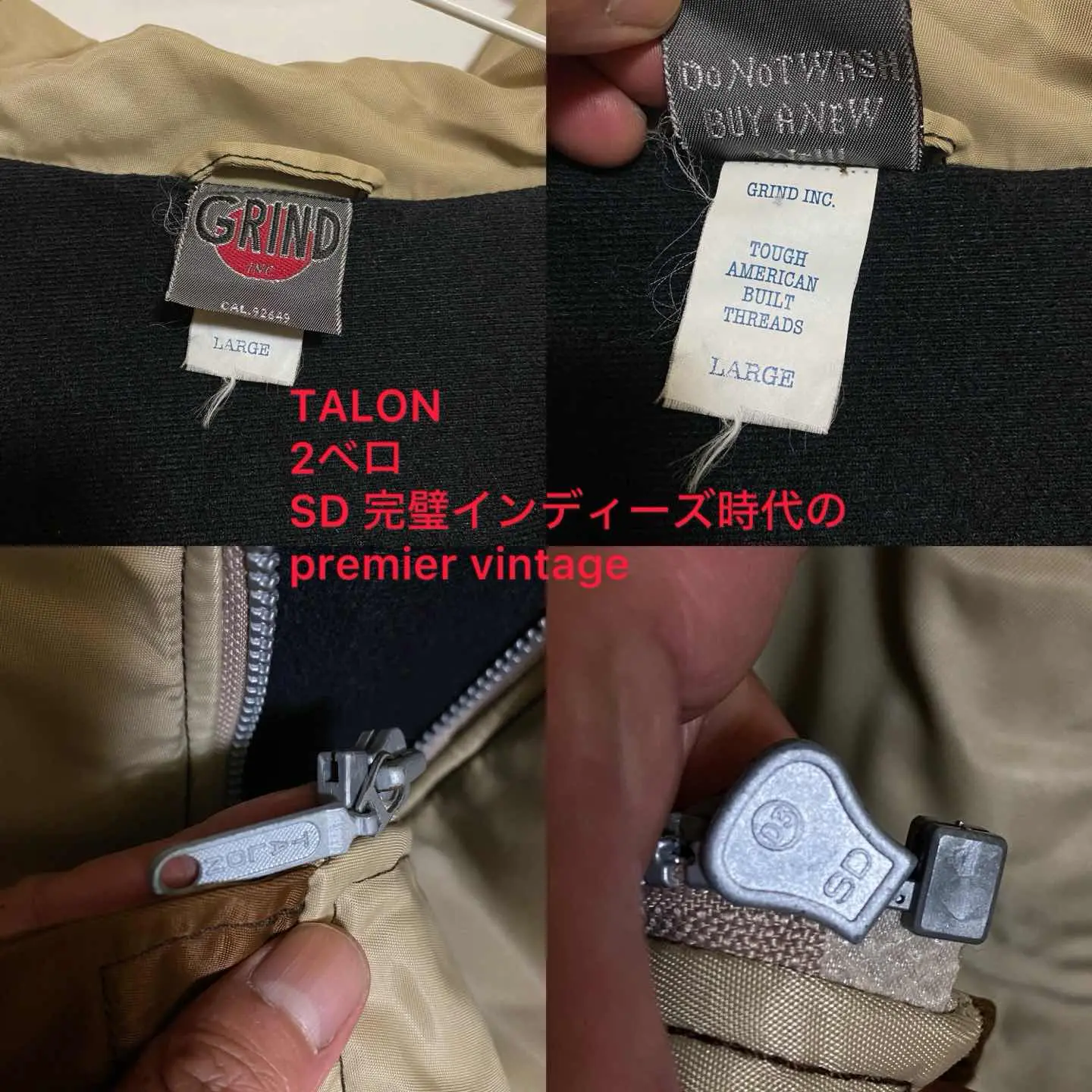 80-90 伝説の一着美品 GRIND USA フーテッドジャケット F 1991年スタート、そもそも、かなり、短期間しか、販売しなかったので、 市場に美品で出回る事はほぼほぼない。 グラインドの伝説の1着、 フーテッドジャケット メッキTALONです、 1991スタートなのに?80-90と明記?なぜ?ですよね、はい、メッキTALONは、INDIES時代の 幻のかつ、伝説の古着コレクターには、たまらない一着、コーディネートことを参考にしながら、少しでもお気に召しましたら、即ゲットよろしくお願いします ▷color◁ 写真とおり、切り替えが お洒落 ※お使いのブラウザにより、色が異なって見える場合がございます ▷size◁ 平置き片面採寸【㎝表記】 表記size L表記ですが、USAです、 あきらか、フリーあります 着丈80 身幅70 肩幅68 袖丈65 ※多少の誤差はご容赦下さい 【着用画像データ】 身長170㎝ 普段Mがジャストのわたしが、かなり、ゆるだぼ 【素材】 リモンタミックスに、 インは、ライト裏地につかわれる、フリースみたいなやつ 【状態】 美品、スケートブランドで美品は奇跡です!!