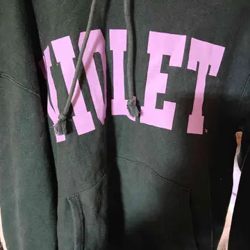 VIOLETのロゴフーディ。Championボディで袖にワッペン入り。 ダークグリーン×パープルの配色が良く、ストリート/古着ミックスにハマる一枚です。 サイズ:L 素材:コットン(※タグ参照) 状態:目立つダメージなし(プリント割れ/毛玉などは写真参照)