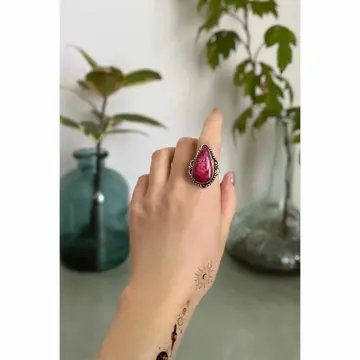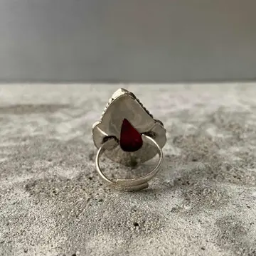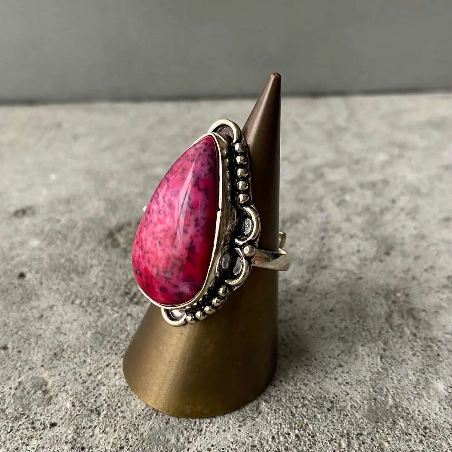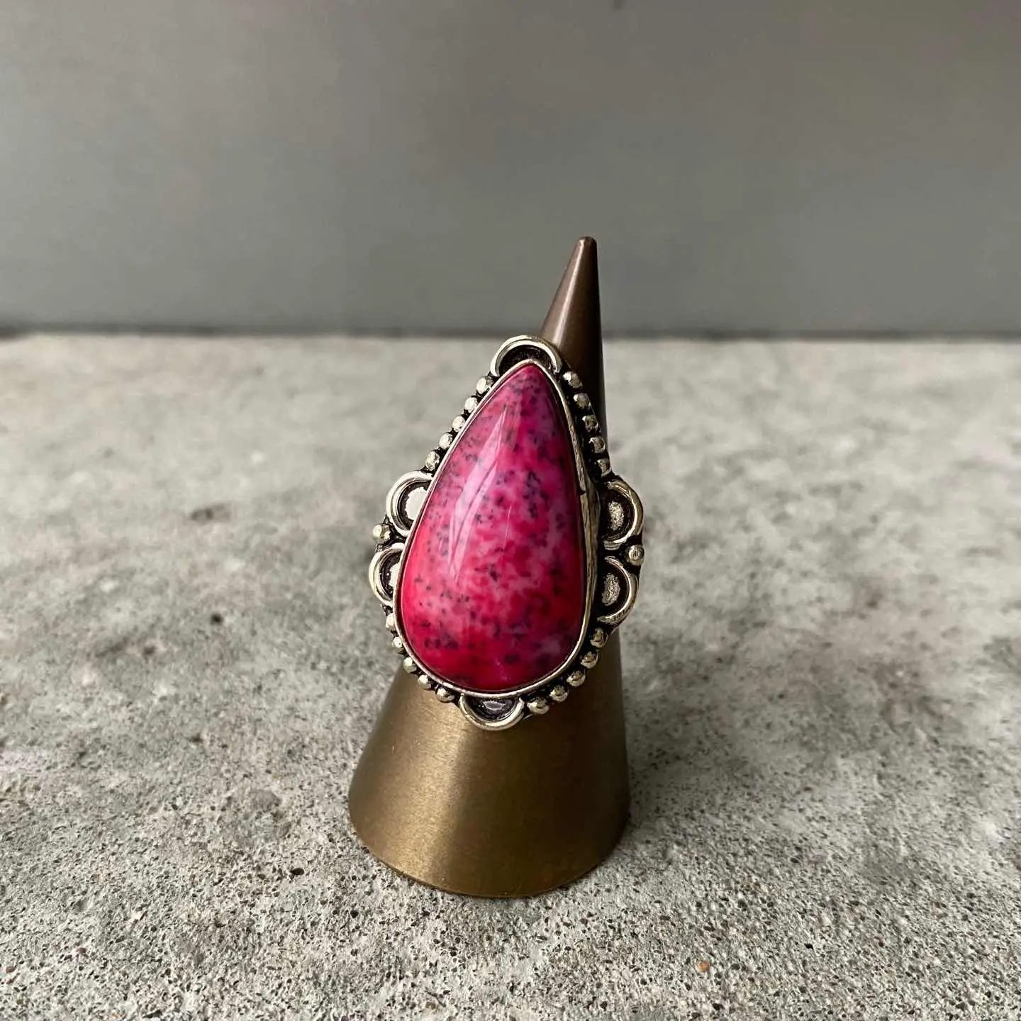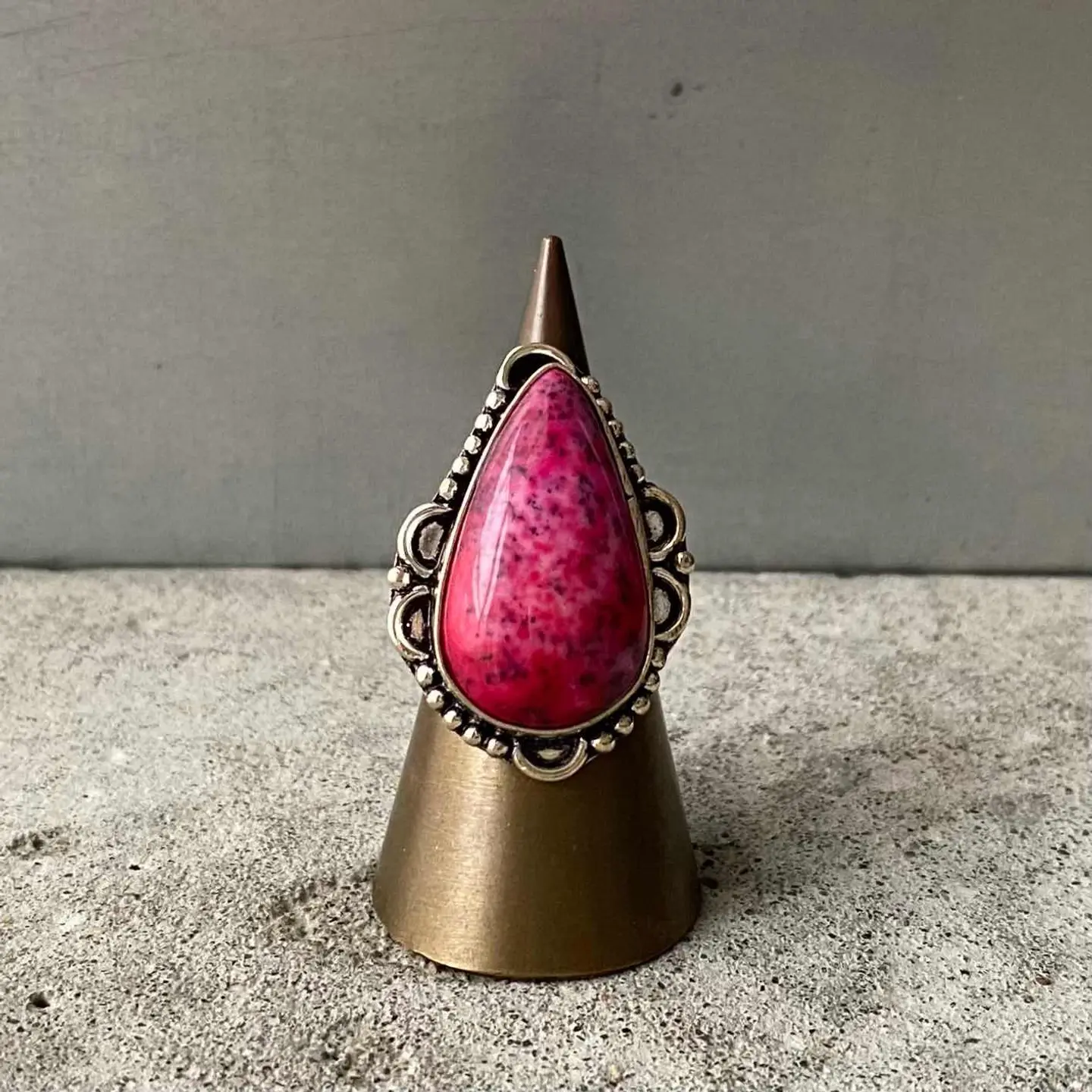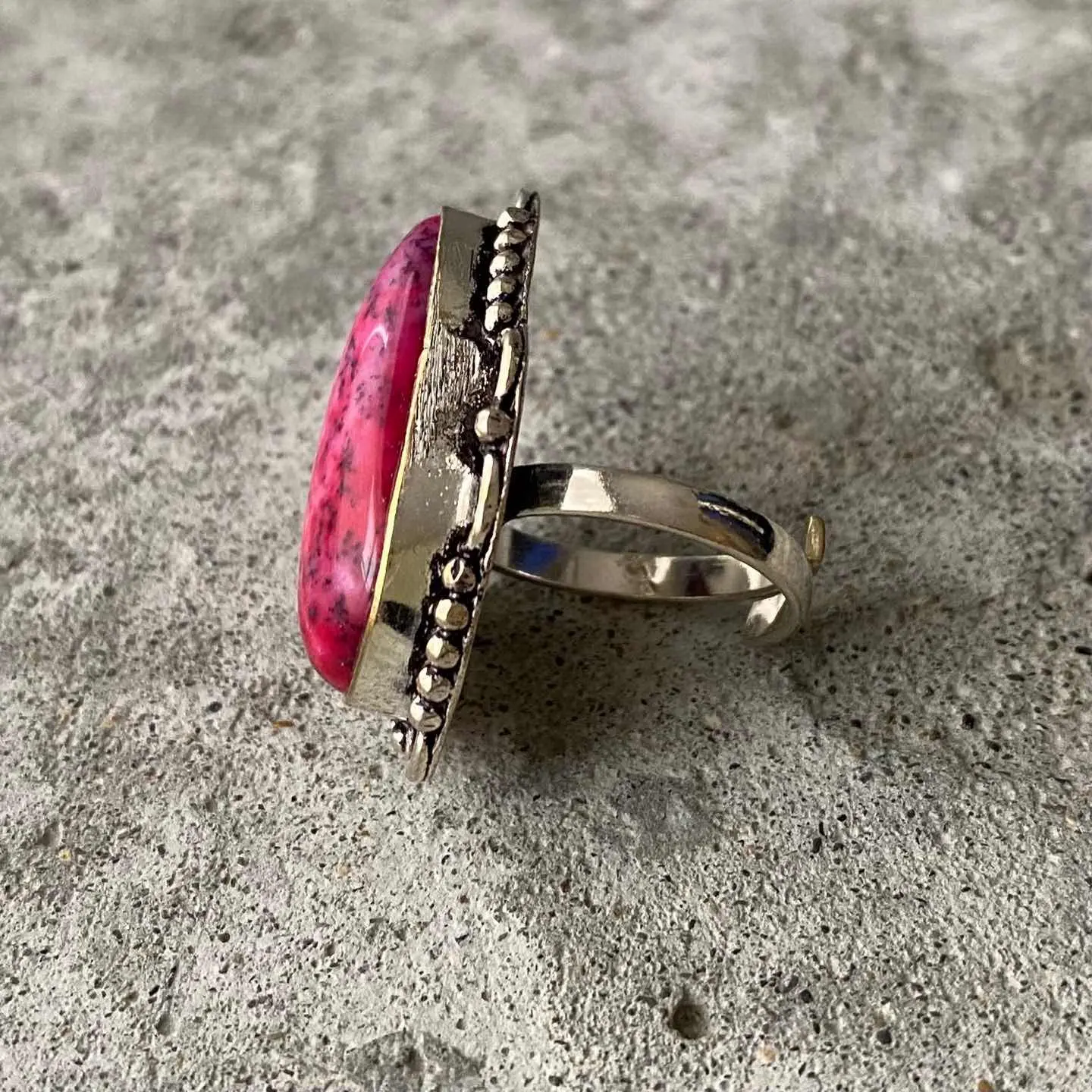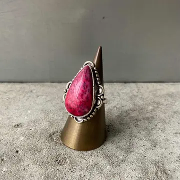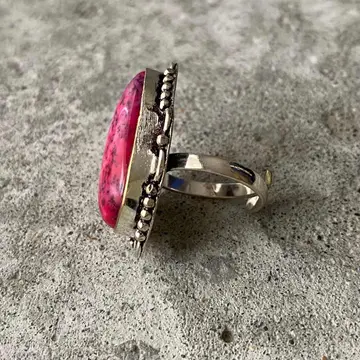 レトロな雰囲気のストーンリング。鮮やかなピンク色がコーディネートの差し色に。古着スタイルにもオススメです。 □Materials 真鍮(シルバー925メッキ)、イミテーションストーン □Size 10号(フリーサイズ) リング幅 約3㎜ 石座部分 約H3×W2.1㎝ 7g □Condition こちらの商品は新品です。海外ハンドメイド製品の為ラフな作りがお好きな方にオススメです。元々の作りですが、メタル部分に細かなスレ傷やリングの曲面部分にフラットになっている箇所がございます。ご購入前に必ずショッピングガイドのご確認をお願いいたします。 Item No.3574