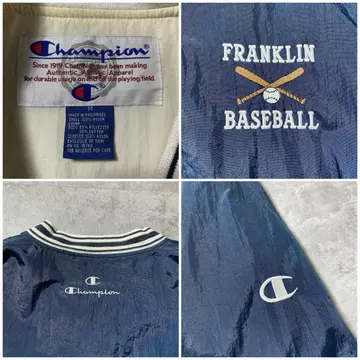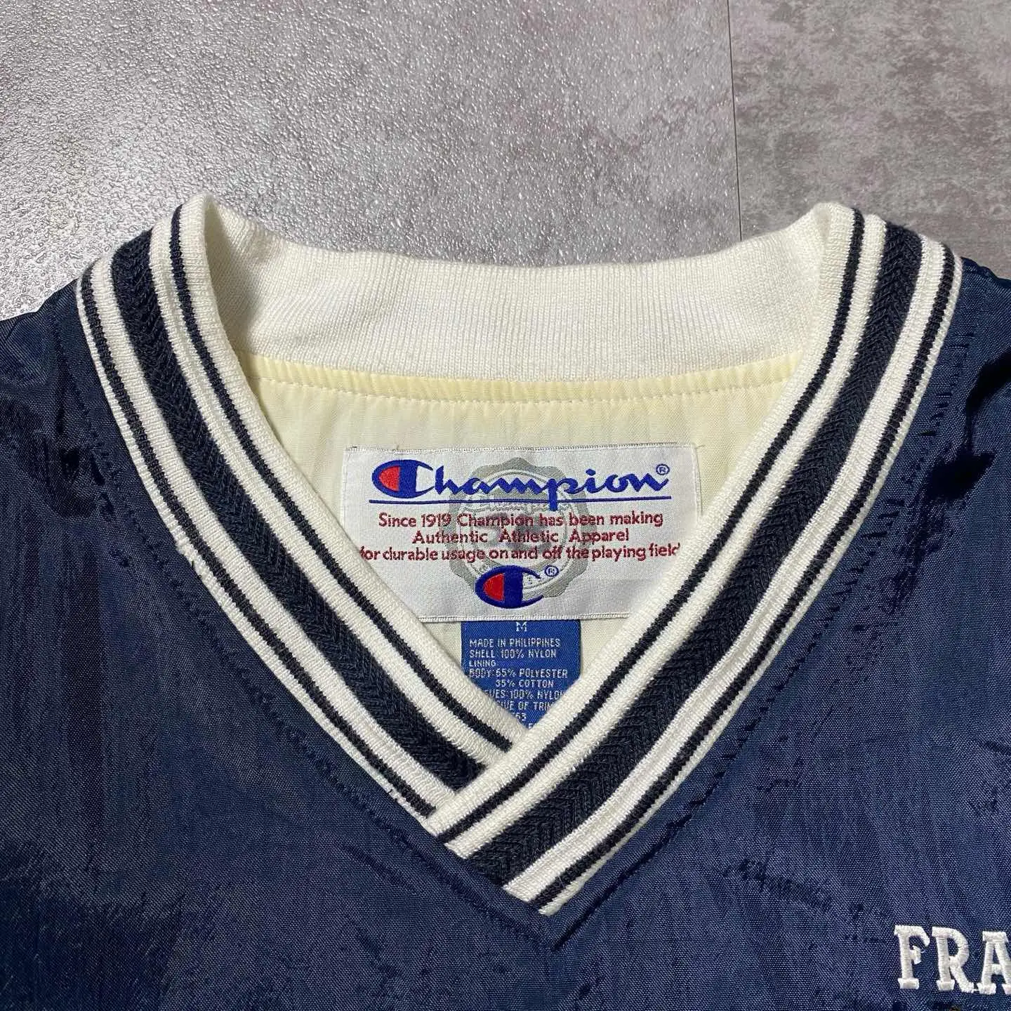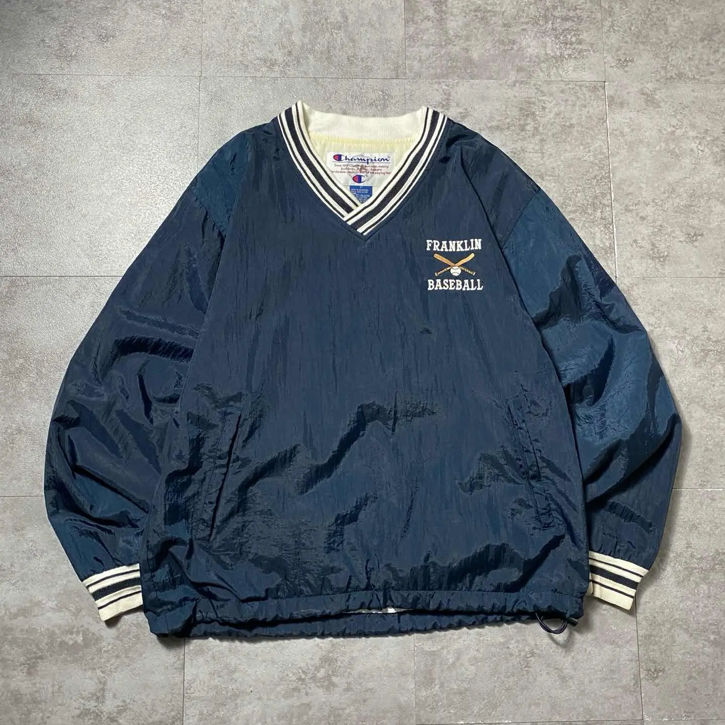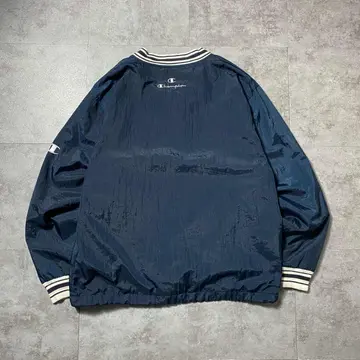 90s チャンピオン 刺繍ロゴ ラインリブ ネイビー ナイロンプルオーバー