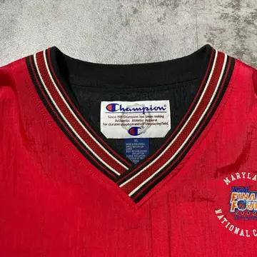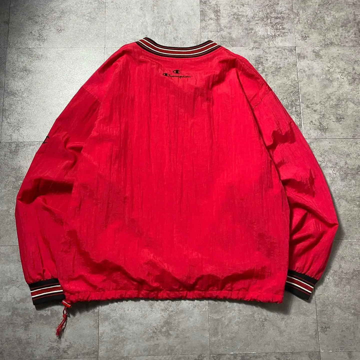 【XL】90s チャンピオン 刺繍ロゴ ラインリブ レッド ナイロンプルオーバー