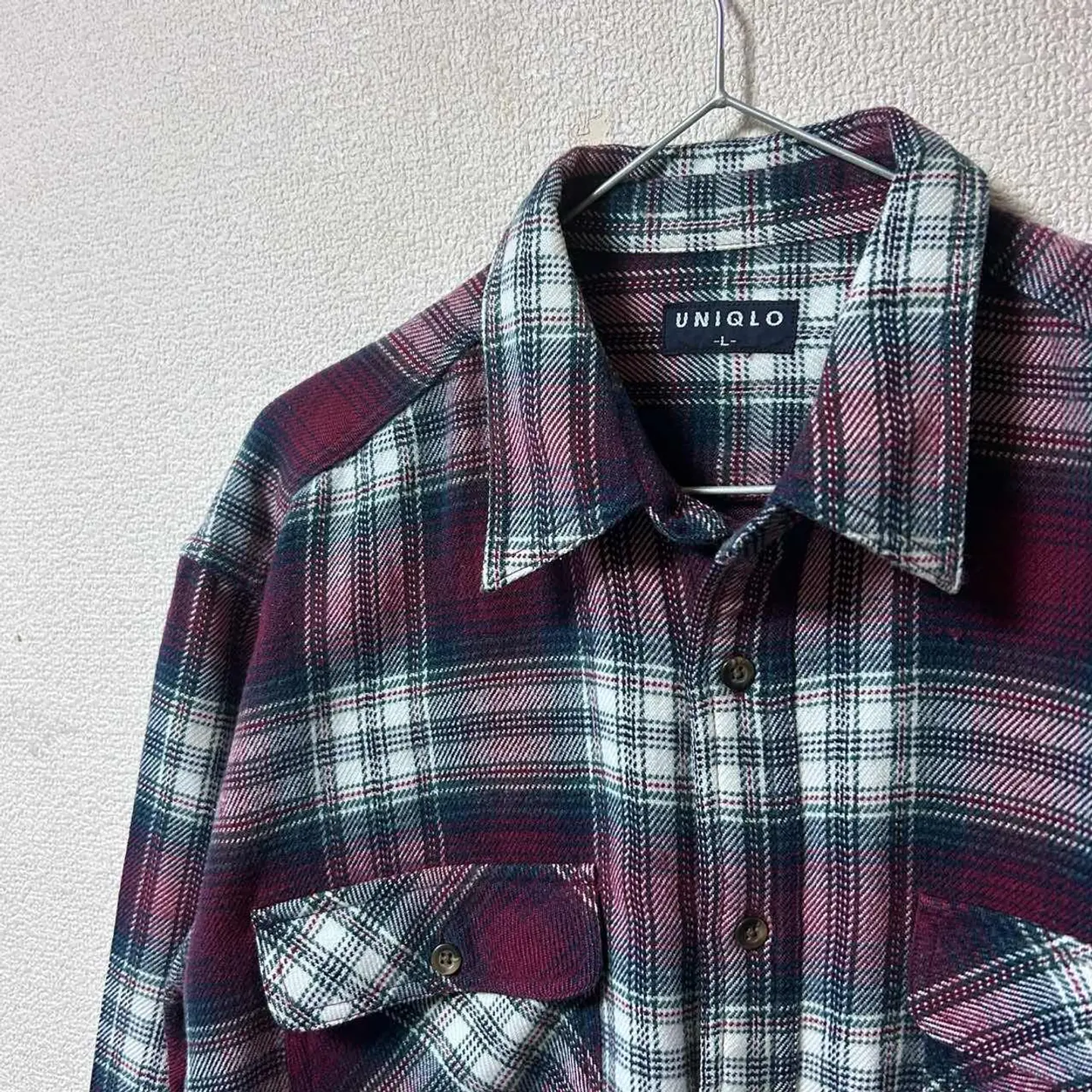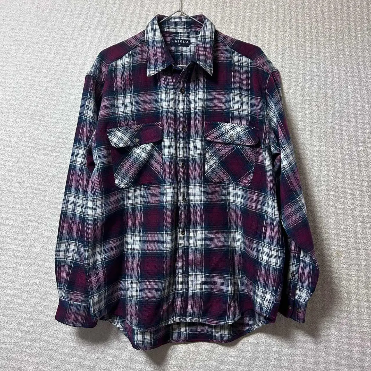 90s紺タグUNIQLO L チェックネルシャツ ボルドー系