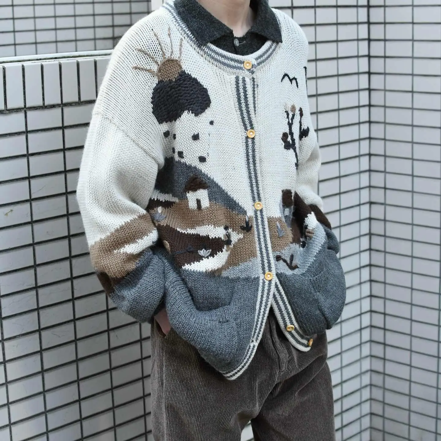 SIZE:- 着丈80cm 肩幅67cm 身幅62cm 袖丈62cm fabric/質感よりalpaca made in peru 着用画像 173cm/56kg この手の色んな意味で”温かみ”を感じるニットが 大好きです。 カラス?に太陽、そして老夫婦と巨大カタツムリ。 フルボタンだからこそニットとしてだけでなく、 カーディガンやブルゾン代わりとしても 活躍するアイテムです。 毛足の長いアルパカ素材で、ウールよりも 軽く暖かく、そして刺激が少ないのも◎ インナーにはシャツやニットポロを着て、 襟を出して、そんなスタイリングでどうぞ。 ※撮影状況により、実物と多少色が異なる場合が ございます。 ※古着を取り扱っているため、気づかない汚れや ほつれ等がある場合がございます。 ※サイズは着用感で選んでおり、 表記サイズは説明欄の最初に記載しております。 古着 オーバーサイズ old vintage ヴィンテージ used 80's 90's アメリカ古着 ユーロ古着 POLO RALPH LAUREN Eddie Bauer OLD GAP LANDS' END ランズエンド LLBean エルエルビーン オールドギャップ エディーバウアー ラルフローレン ブルックスブラザーズ Brooks Brothers アイボリー 生成り カーディガン ブルゾン などがお好きな方 #vintage #オーバーサイズ #old #used #90s #80s #古着 #ヴィンテージ #アメリカ古着 #ユーロ古着 #LLBean #エルエルビーン #EddieBauer #エディーバウアー #oldgap #オールドギャップ #LANDSEND #ランズエンド #NAUTICA #ノーティカ #ラルフローレン #POLORALPHLAUREN #アルパカニット #ニット #セーター #デザインニット #ニットブルゾン #ブルゾン #カーディガン