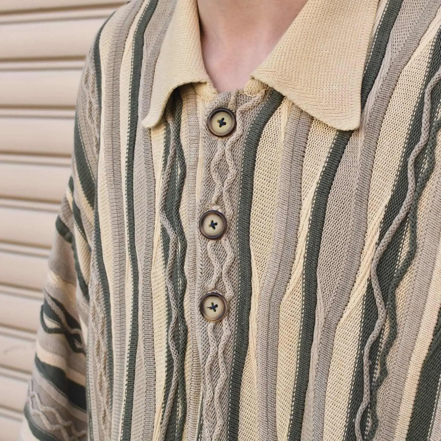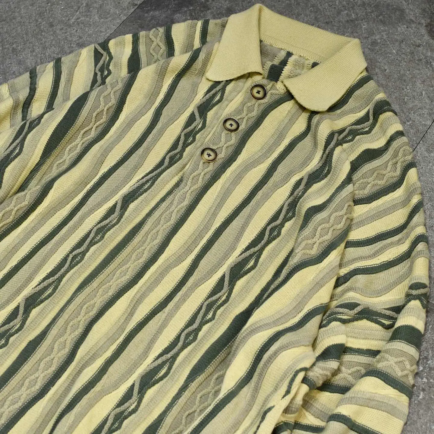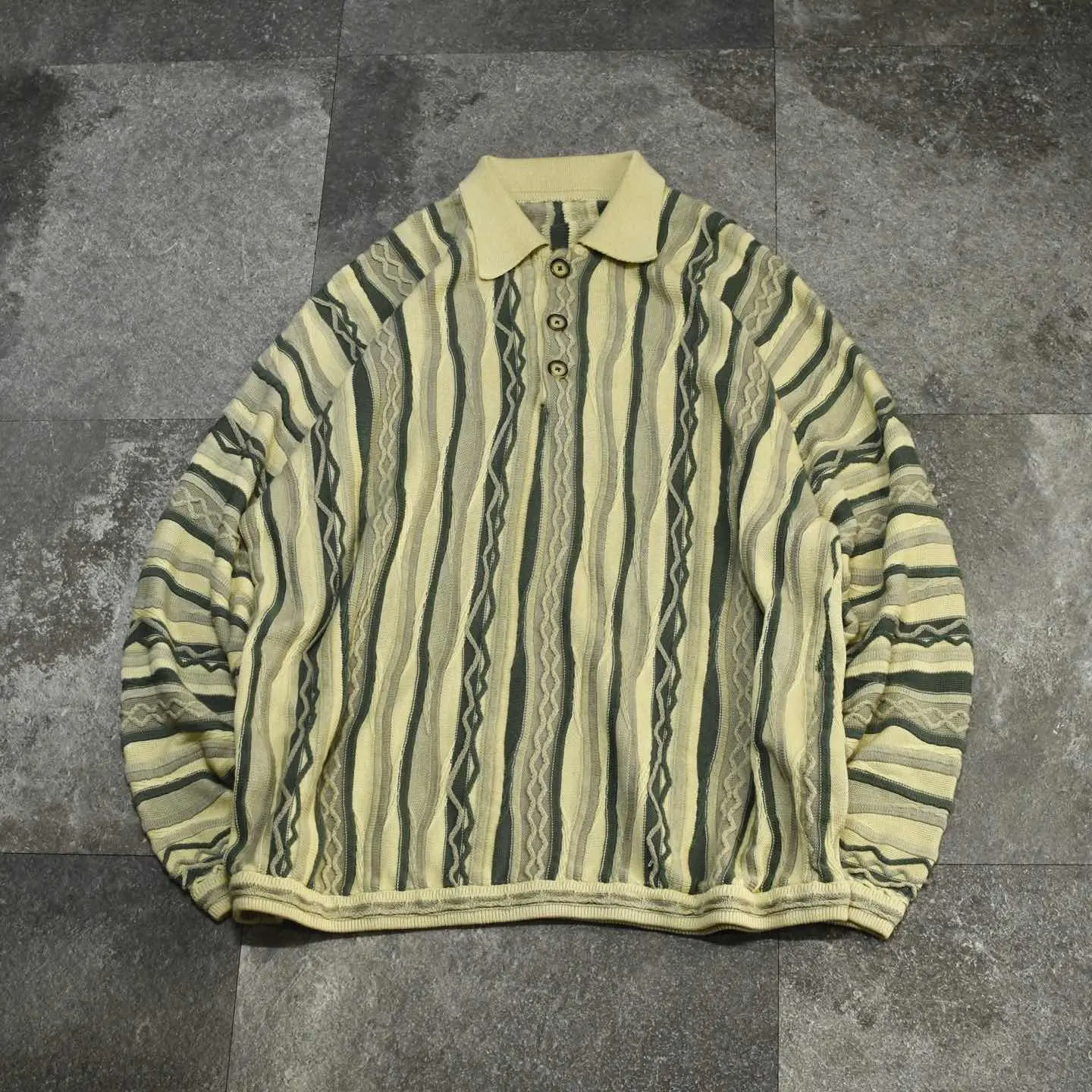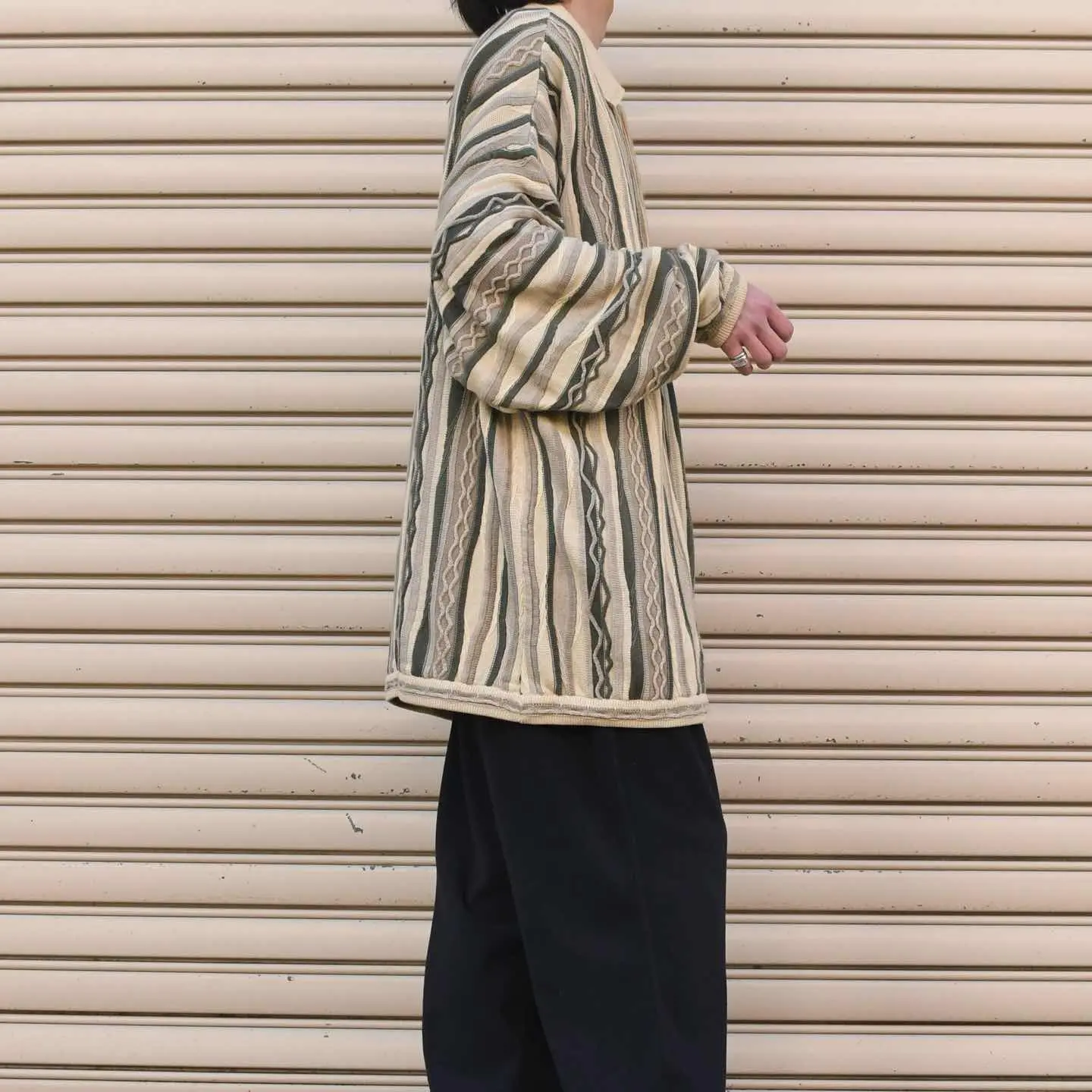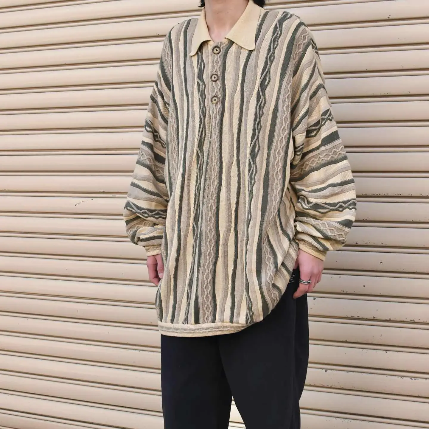 SIZE:- 着丈81cm 肩幅70cm 身幅71cm 袖丈60cm fabric/質感よりcotton・acrylic 着用画像 173cm/58kg coogiを筆頭に、色鮮やかな3Dニットを 時折見掛けますが、こちらは比較的落ち着いた 印象を纏う、同色でまとまった3Dニット。 さらにはニットポロタイプで、 通常のクルーネックの個体と比べても、 色味も相まって大人びた雰囲気のある逸品。 そんな雰囲気をサイズで崩し、カジュアルに ゆったりと着れるアイテムです。 3Dニットは興味あるけど、派手で... そんな方にこそ、雰囲気にバランスの取れた こんな個体はどうでしょう。 自分ならこんな個体を、と思わせてくれた1着として おすすめです。 ※色味に関しましては、物撮りを参考に お願いいたします。 ※撮影状況により、実物と多少色が異なる場合が ございます。 ※古着を取り扱っているため、気づかない汚れや ほつれ等がある場合がございます。 ※サイズは着用感で選んでおり、 表記サイズは説明欄の最初に記載しております。 old vintage ヴィンテージ used 80's 90's アメリカ古着 ユーロ古着 POLO RALPH LAUREN Eddie Bauer OLD GAP LANDS' END ランズエンド LLBean エルエルビーン オールドギャップ エディーバウアー ラルフローレン ブルックスブラザーズ Brooks Brothers コットンニット アクリルニット ベージュ ニットポロ などがお好きな方 #vintage #オーバーサイズ #old #used #90s #80s #古着 #ヴィンテージ #LLBean #エルエルビーン #EddieBauer #エディーバウアー #oldgap #ラルフローレン #POLORALPHLAUREN # #3Dニット #デザインニット #アクリルニット #コットンニット #ニットポロ