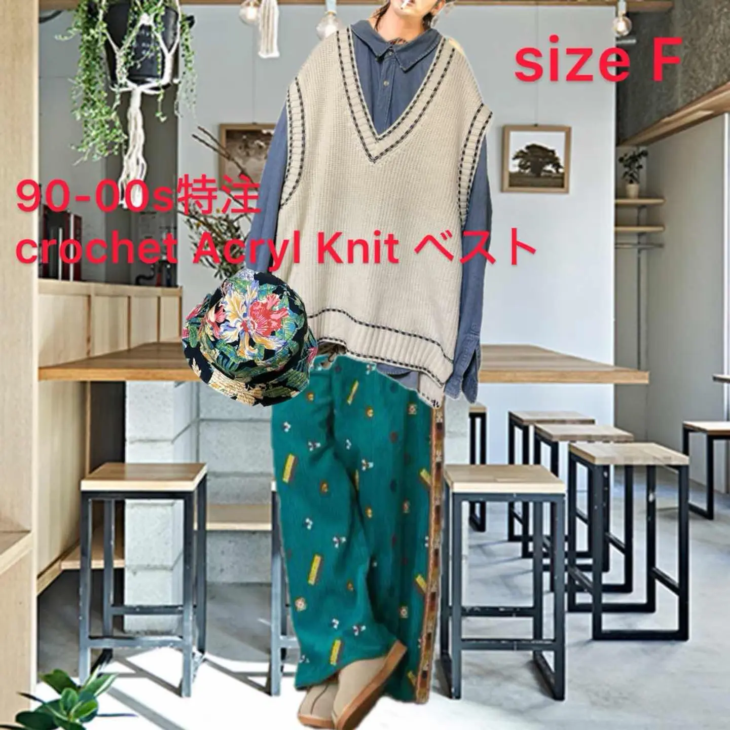 90-00s クロシェAcryl 特注 ステッチアート KnitベストF